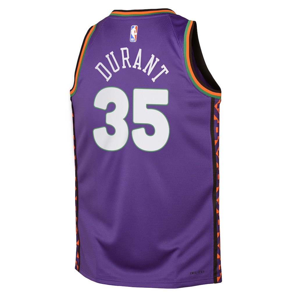 Show your support for Kevin Durant and the Phoenix Suns with this 2024/25 Swingman Player Youth Jersey in City Edition Purple. Crafted from 100% polyester, this lightweight and breathable jersey ensures comfort during games, training, or casual wear. The classic fit offers durability and style, perfect for young fans. Features the iconic #35 and team graphics. Available in sizes S to 3XL. Ideal for basketball enthusiasts, everyday outfits, or fan gear. Note: This is a generic sports apparel item, not affiliated with any professional teams or leagues.