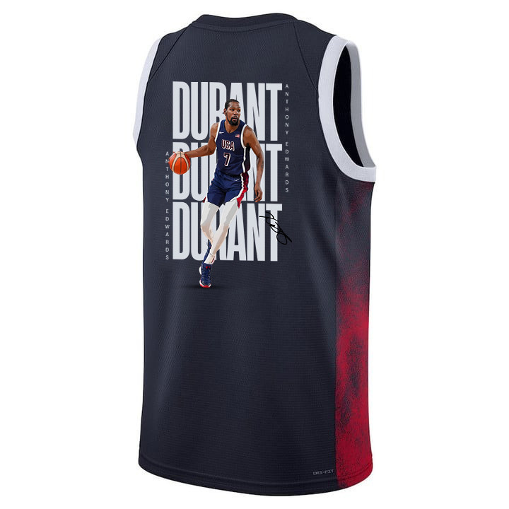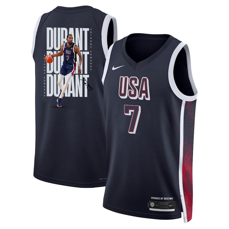 Elevate your game-day look or training sessions with the Kevin Durant 7 Key Player USA Basketball 2024 Swingman Jersey in navy and multicolor. This lightweight, breathable sports jersey is crafted from 100% polyester for superior comfort, moisture-wicking performance, and durability. Perfect for fans, athletes, or casual wear, it features a classic fit that pairs effortlessly with shorts, jeans, or athletic gear. The iconic USA Basketball design celebrates national pride with clean lines, player numbering, and authentic Swingman styling. Available in adult sizes S-3XL, this new unisex jersey keeps you cool during workouts, pickup games, or everyday outings. Ideal for basketball enthusiasts supporting Team USA in 2024 Olympic-inspired apparel.