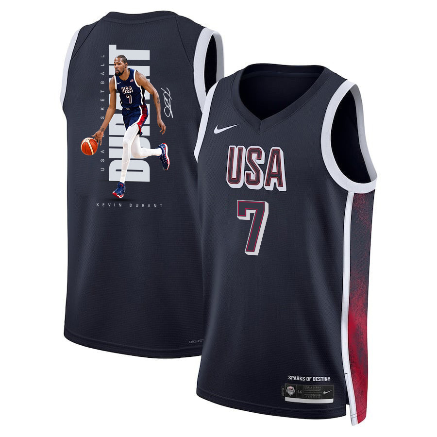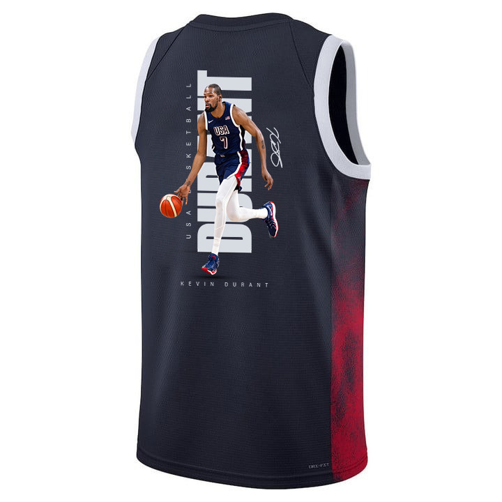 Elevate your fan gear with the Kevin Durant 7 Olympic Paris 2024 USA Basketball Swingman Player Jersey in navy and multicolor. This lightweight, breathable unisex jersey is crafted from 100% polyester for superior comfort and durability during workouts, training sessions, casual outings, or game days. The classic fit offers versatility, pairing effortlessly with shorts, jeans, or athletic wear. Featuring iconic USA Basketball design elements inspired by the Paris 2024 Olympics, it’s perfect for basketball enthusiasts, athletes, and everyday supporters. Available in adult sizes S-3XL. New condition. Note: This is a generic sports apparel item, not affiliated with any professional teams or leagues.