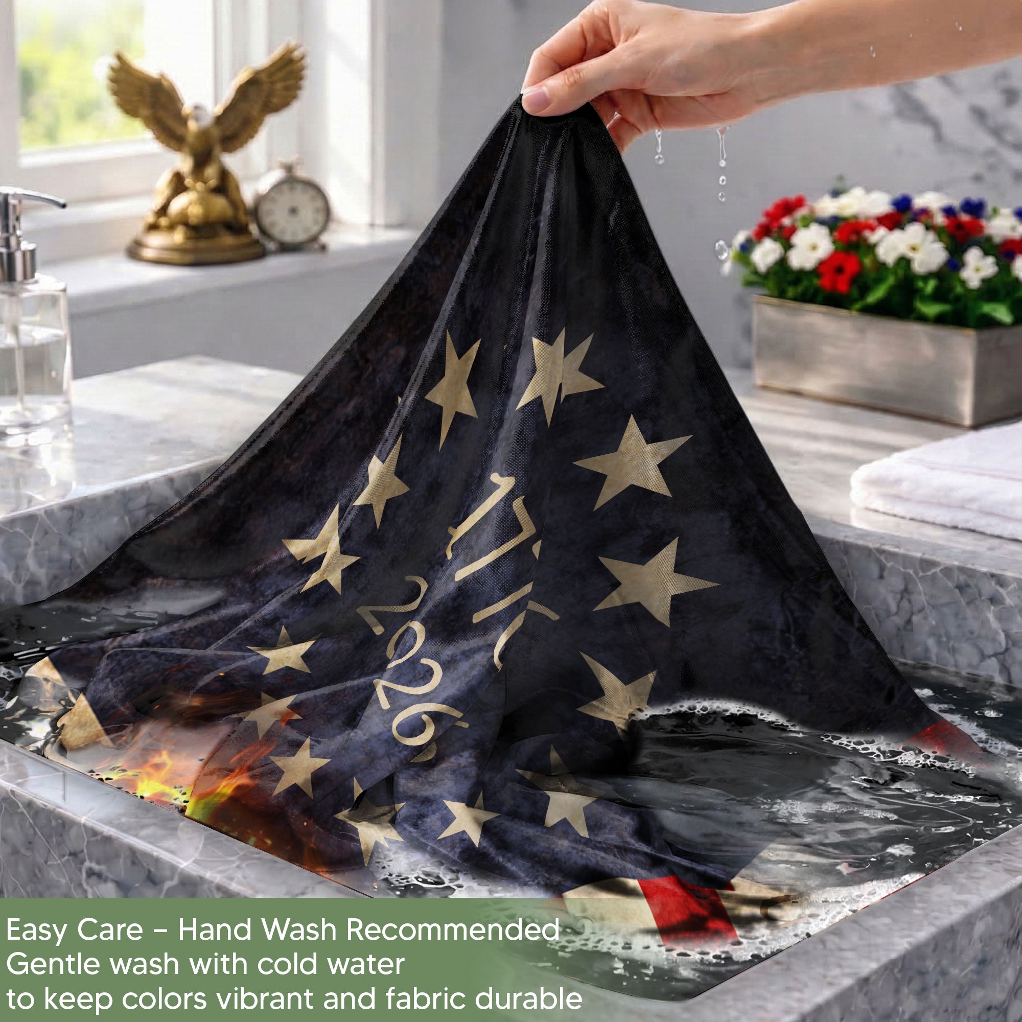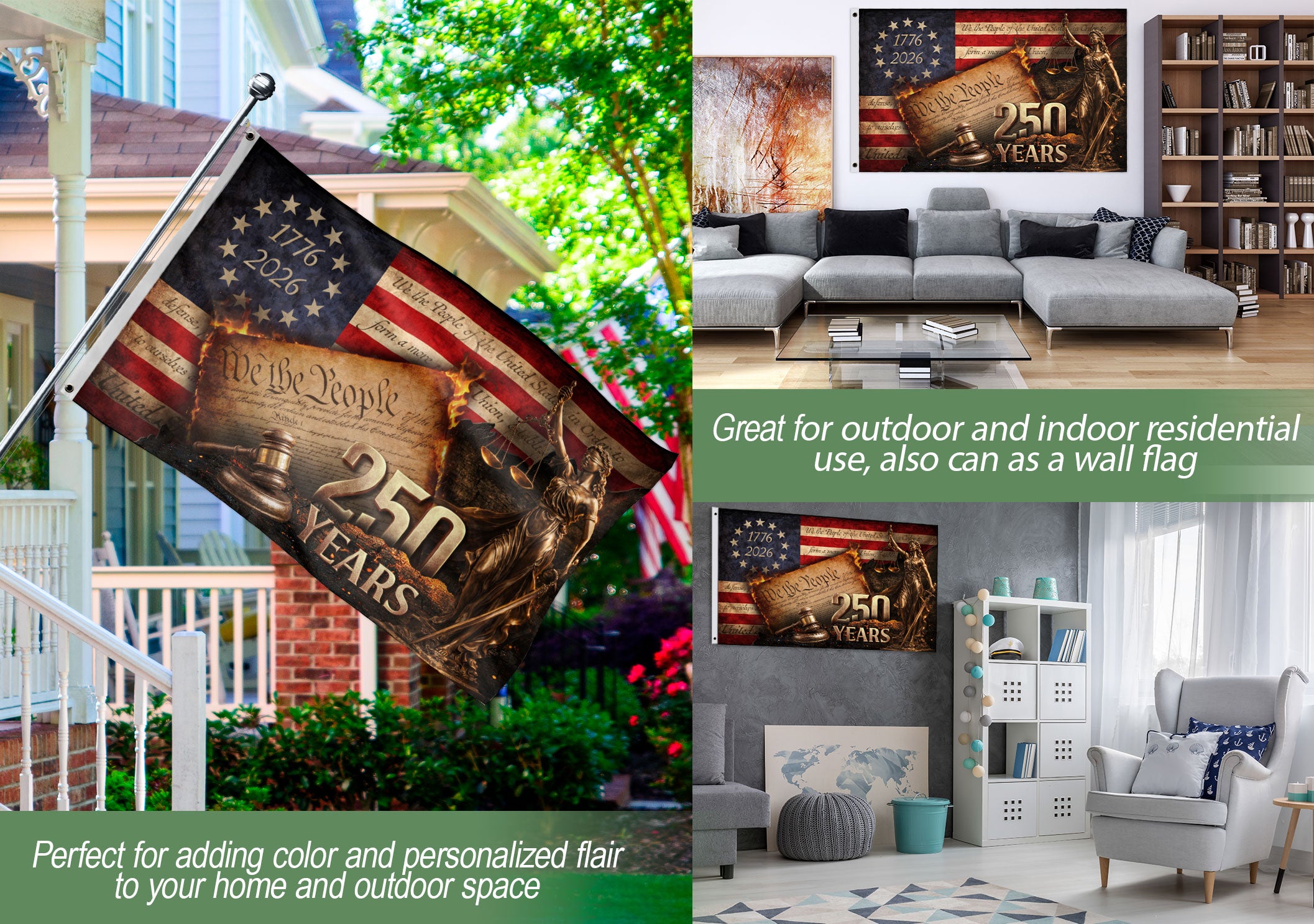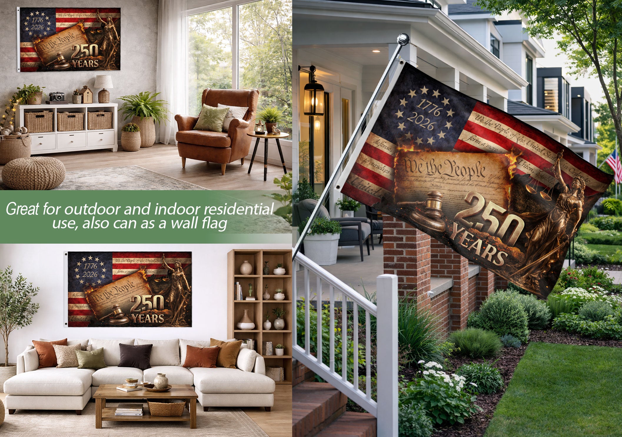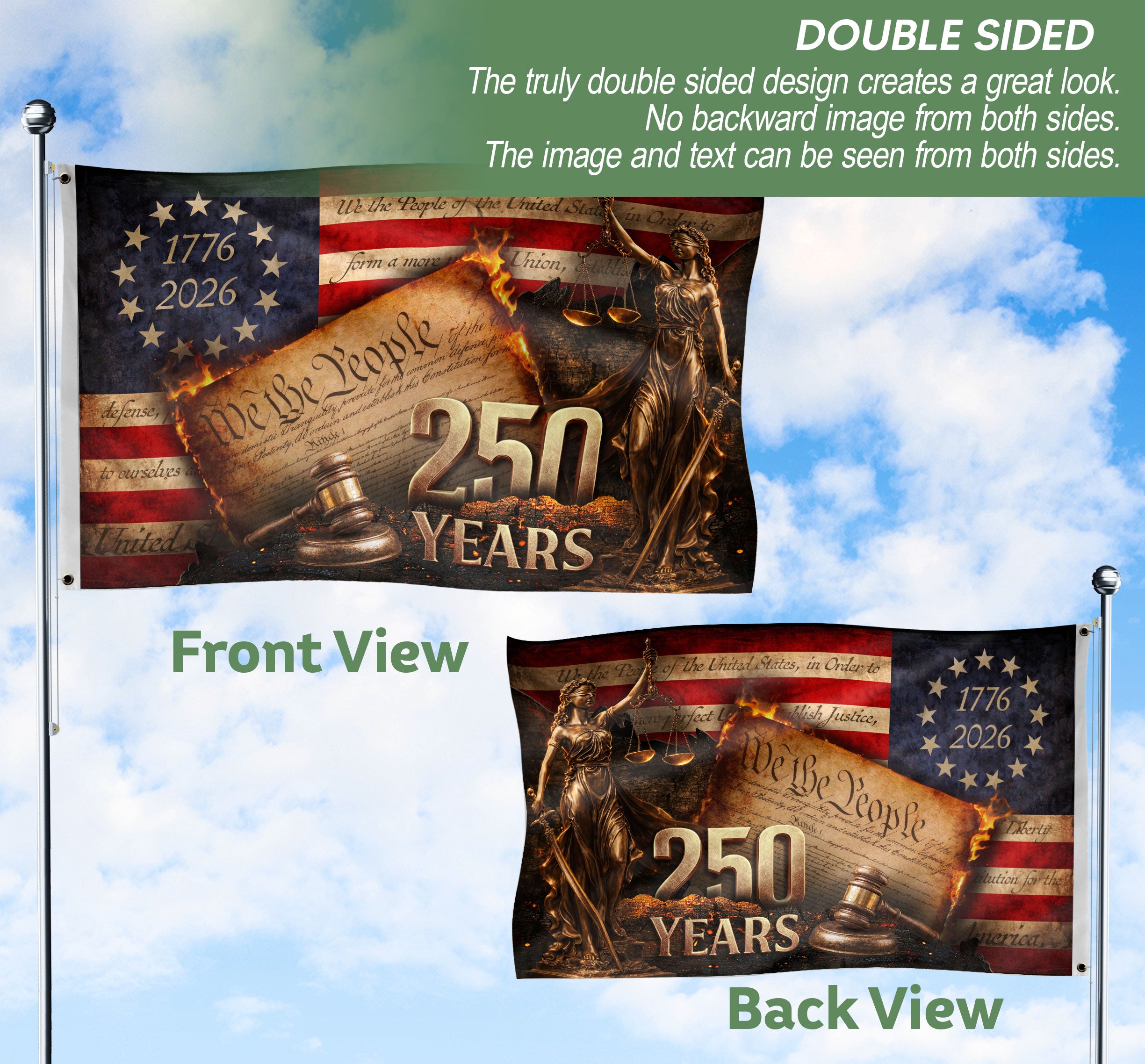 Celebrate 250 years of American freedom with this Lady Justice house flag commemorating 1776-2026. Featuring the iconic Lady Justice holding balanced scales and a gavel, alongside the powerful ‘We The People’ script, this patriotic flag honors the nation’s quarter-millennium milestone. Crafted from durable, weather-resistant polyester fabric, it withstands outdoor elements for long-lasting display. Perfect for porches, gardens, patios, or front yards, this bold garden flag makes a proud statement of liberty, justice, and national pride. Double-sided print ensures visibility from all angles. Easy to hang with a standard flagpole sleeve. Ideal for Independence Day, Memorial Day, Fourth of July, or everyday display.