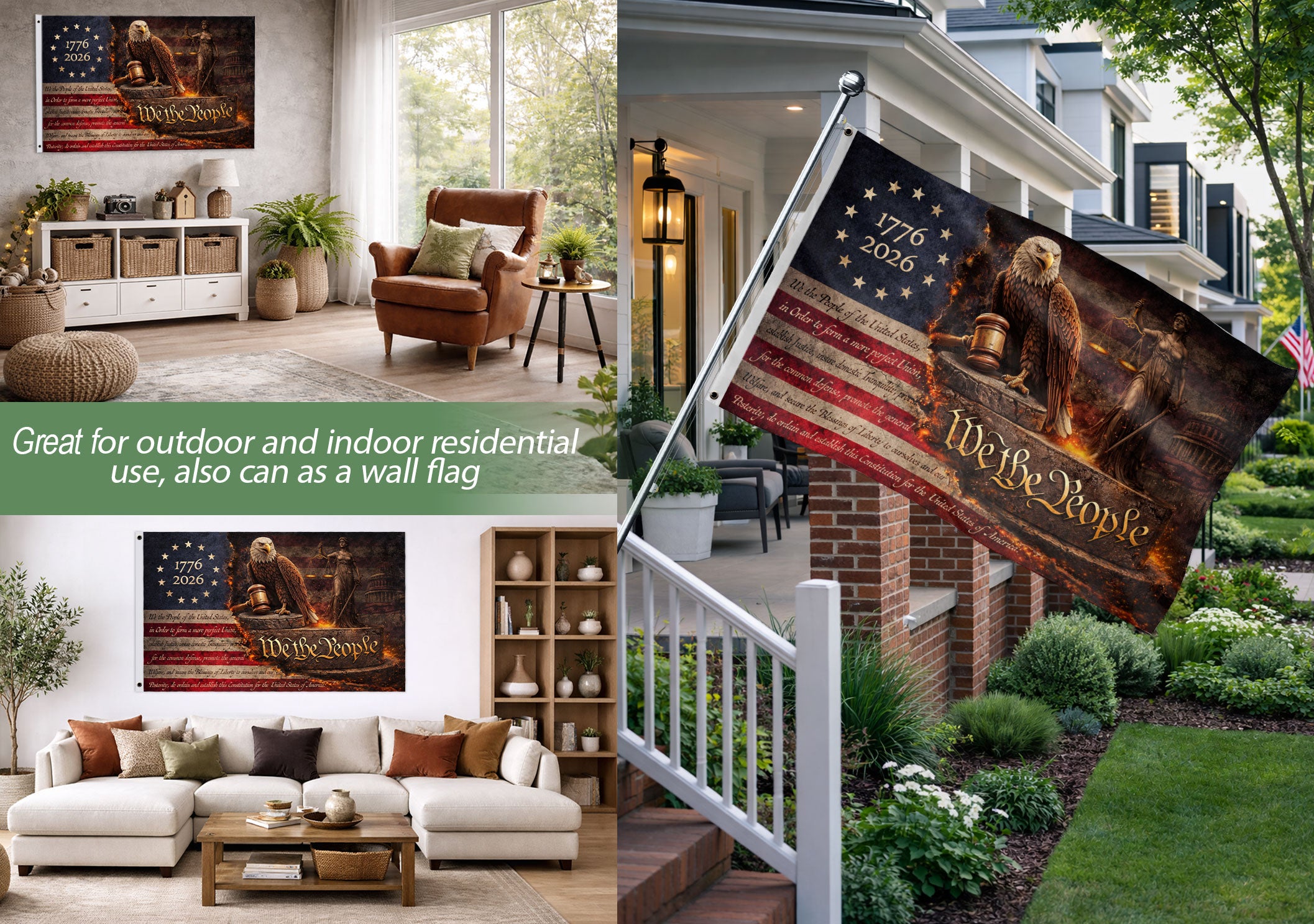 Celebrate 250 years of American independence with this striking Lady Justice house flag featuring We The People design. The artwork showcases Lady Justice holding her iconic scales and sword, flanked by a vigilant bald eagle guarding a shield marked 1776-2026. Crafted for outdoor display, this durable house flag embodies the core principles of the Republic—justice, liberty, and patriotism. Perfect for porches, gardens, or flagpoles to honor U.S. heritage during the semiquincentennial. Made with weather-resistant fabric to withstand the elements while proudly displaying American symbols like the eagle, shield, and founding motto. Ideal for patriots, history enthusiasts, and those commemorating the enduring promise of justice for all.