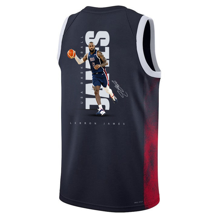 Experience the LeBron James 6 Olympic Paris 2024 USA Basketball Swingman Player Jersey in navy with multicolor accents. This lightweight, breathable unisex jersey is crafted from 100% polyester for optimal comfort and durability during training, workouts, games, or casual everyday wear. The classic fit ensures easy layering and pairing with shorts, pants, or other athletic gear. Perfect for basketball fans, athletes, or anyone seeking fan-inspired athletic apparel. Available in adult sizes S-3XL. New condition. Note: This is a generic sports jersey not affiliated with any professional teams or leagues.