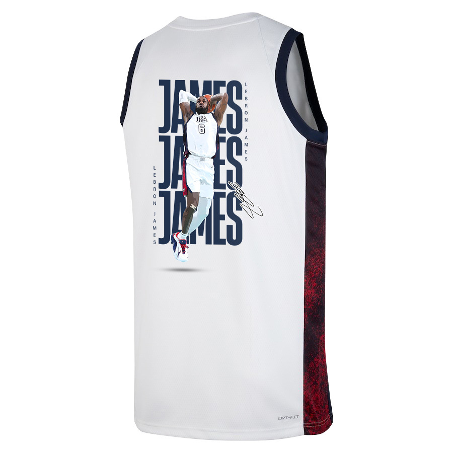 Experience the LeBron James 6 Key Player Men’s USA Basketball Unisex 2024 Swingman Player Jersey in white. Crafted from 100% polyester, this lightweight and breathable jersey ensures optimal comfort and performance during training, games, or casual wear. The classic fit offers versatility for fan-inspired outfits or everyday athletic style. Available in sizes S, M, L, XL, 2XL, 3XL, it’s designed for adults seeking durable, cool-wearing apparel. Pair it with shorts or jeans for a sporty look. Multicolor accents highlight the iconic USA Basketball design, making it perfect for basketball enthusiasts. New condition, generic sports apparel not affiliated with professional teams.