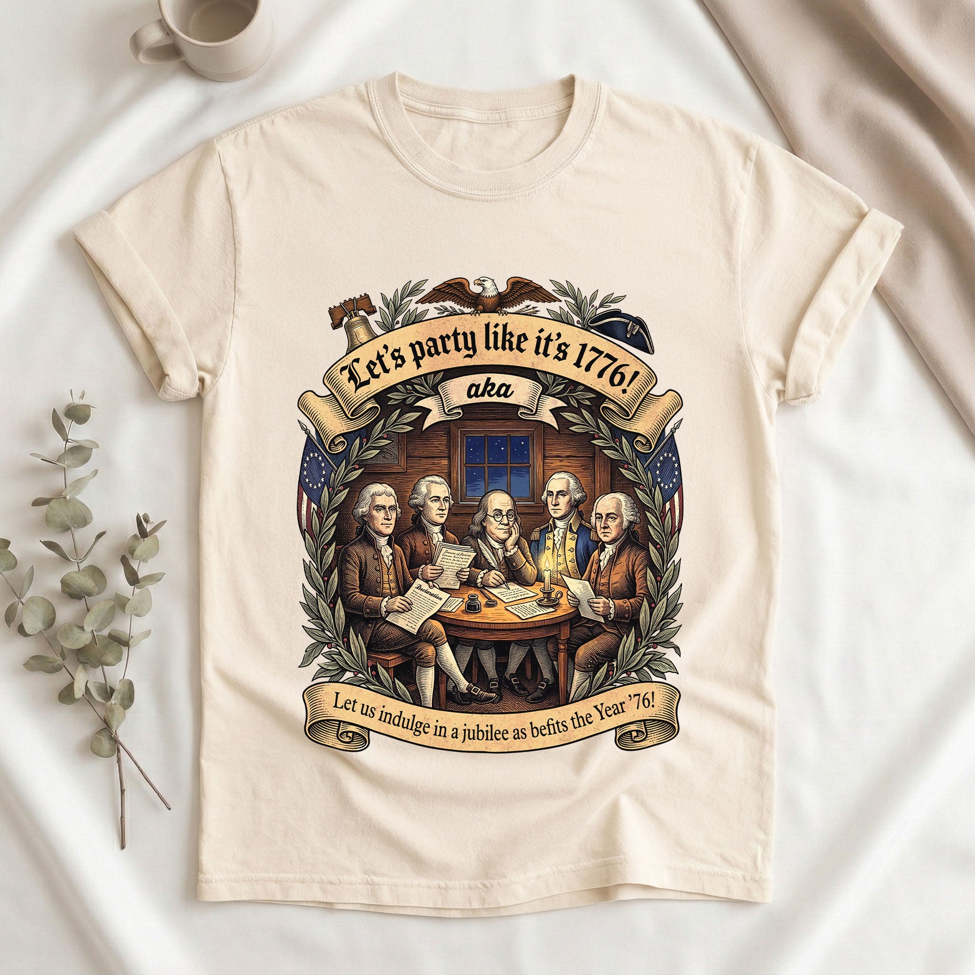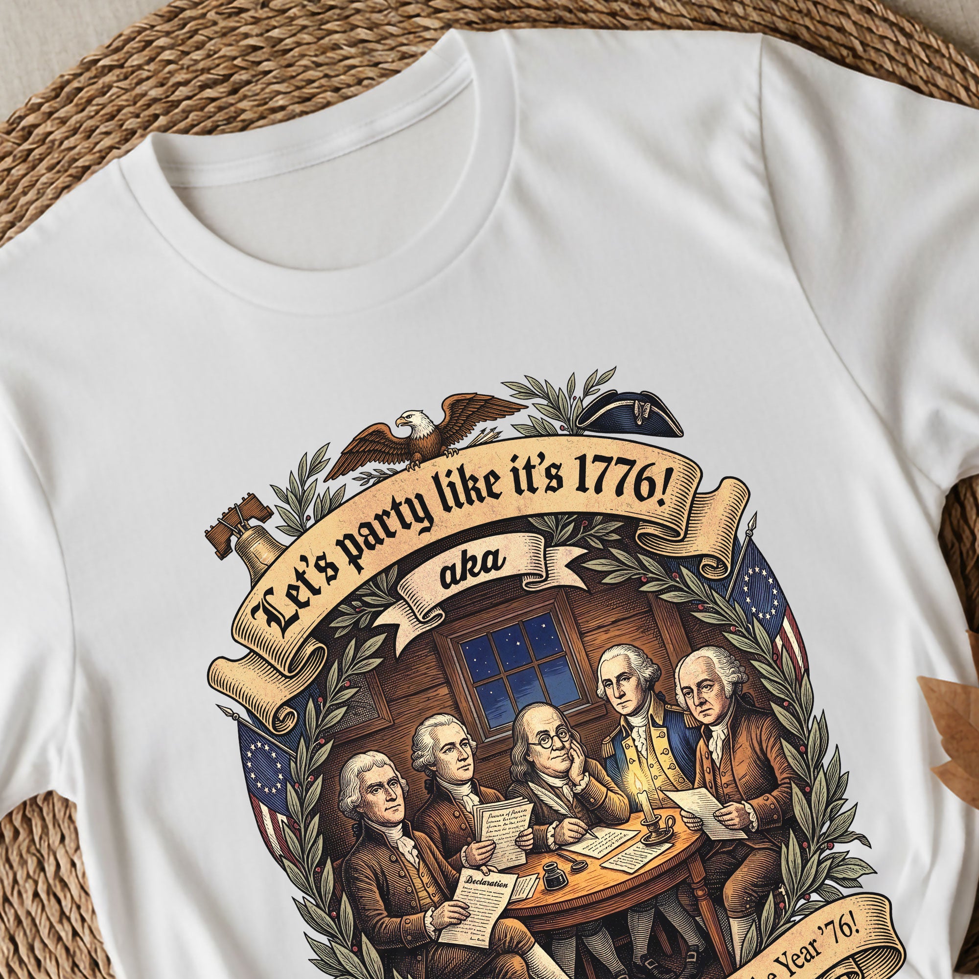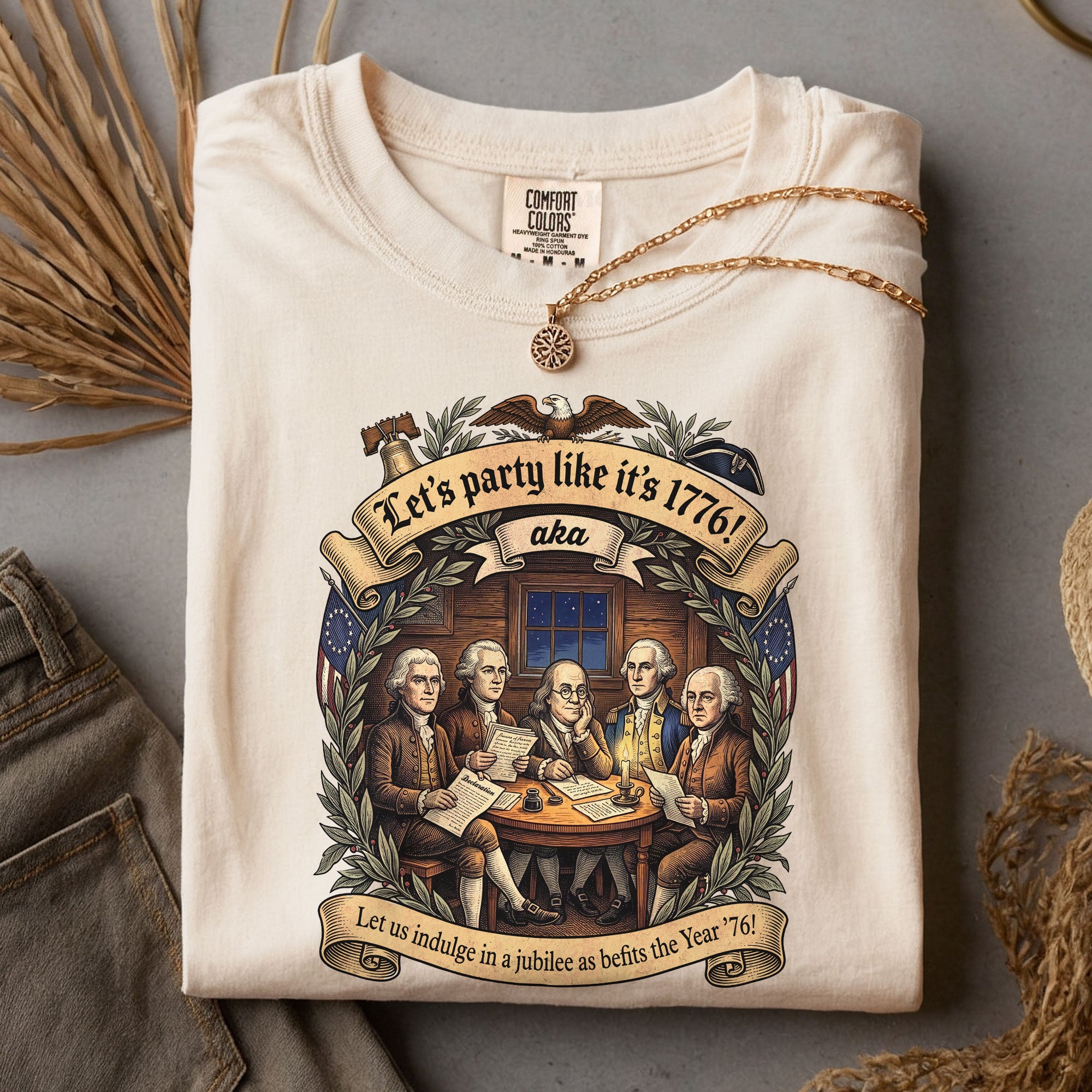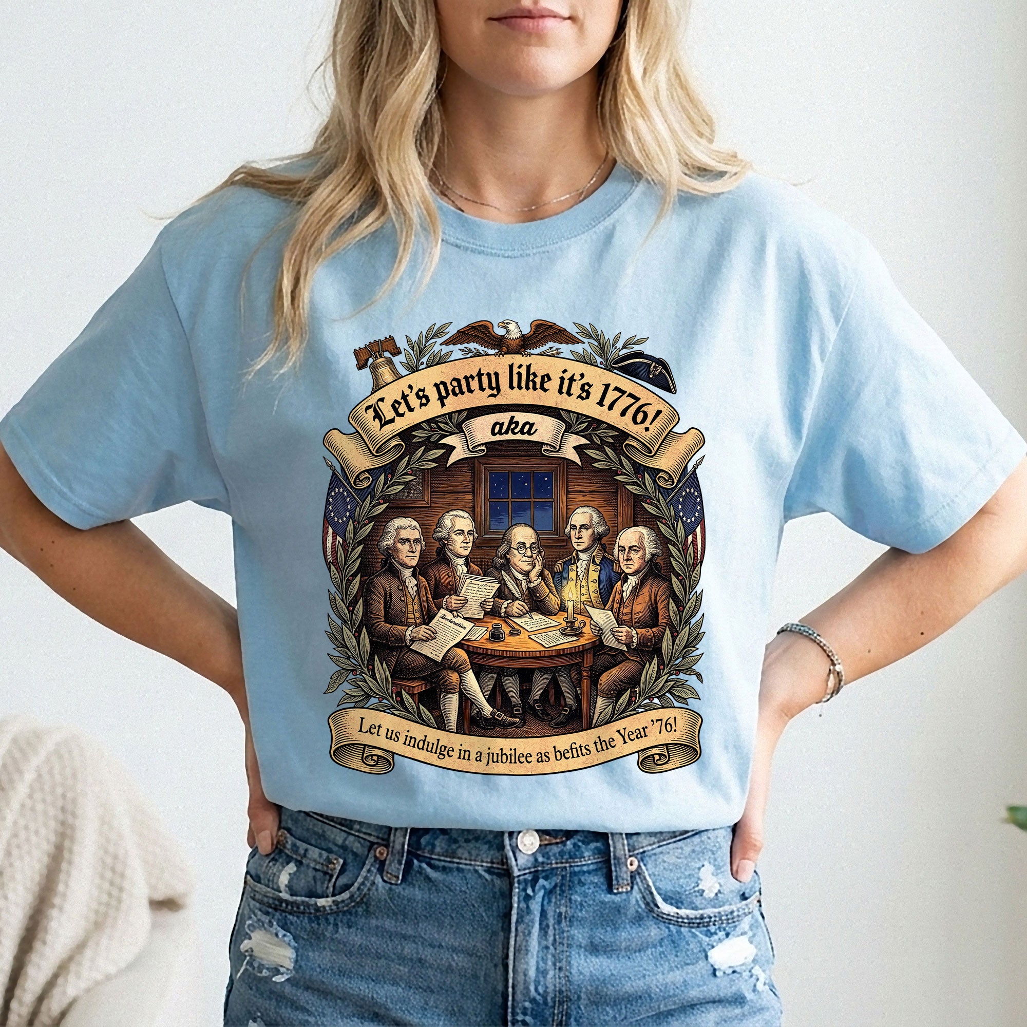 Celebrate America’s revolutionary spirit with this Let’s Party Like It’s 1776 vintage Founding Fathers patriotic USA unisex T-shirt. Featuring a classic retro illustration of the iconic Founding Fathers and the bold phrase “Let’s Party Like It’s 1776,” this comfortable tee is ideal for Independence Day celebrations, 250th USA anniversary events, Memorial Day, Fourth of July barbecues, or any patriotic gathering. Made from soft, breathable cotton-poly blend fabric, it offers a relaxed unisex fit for all-day wear. Perfect for history buffs, veterans, and proud Americans who love vintage-style apparel that honors the birth of the nation in 1776. Machine washable and durable for everyday use.