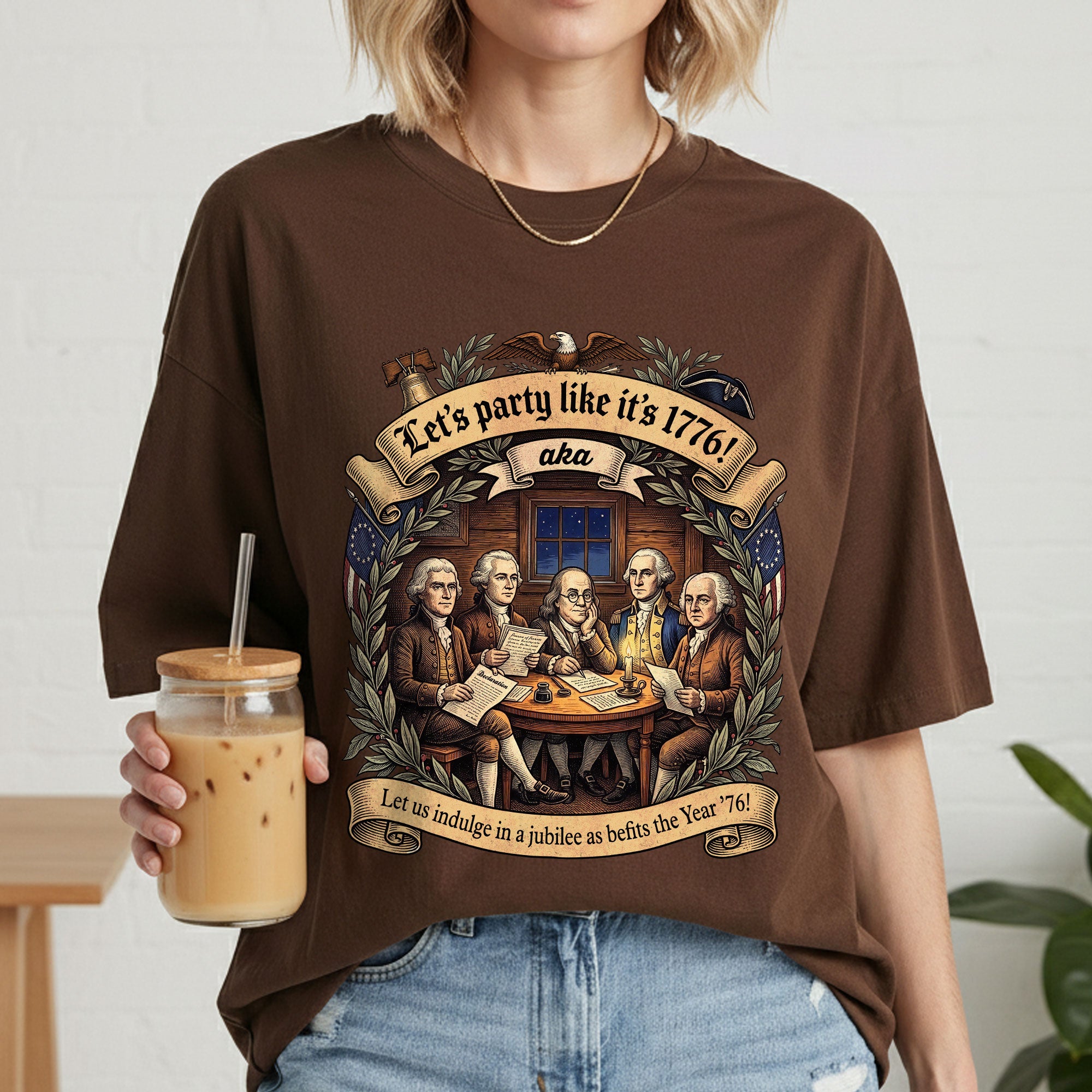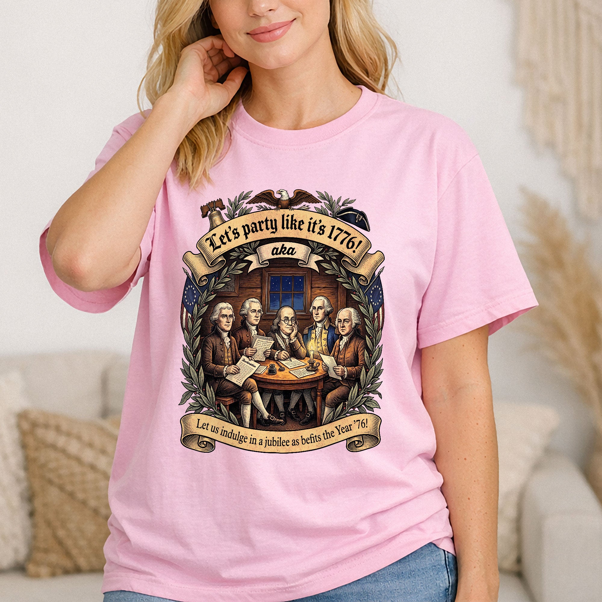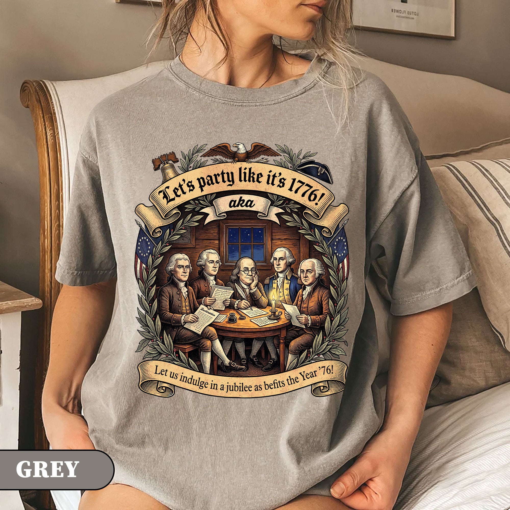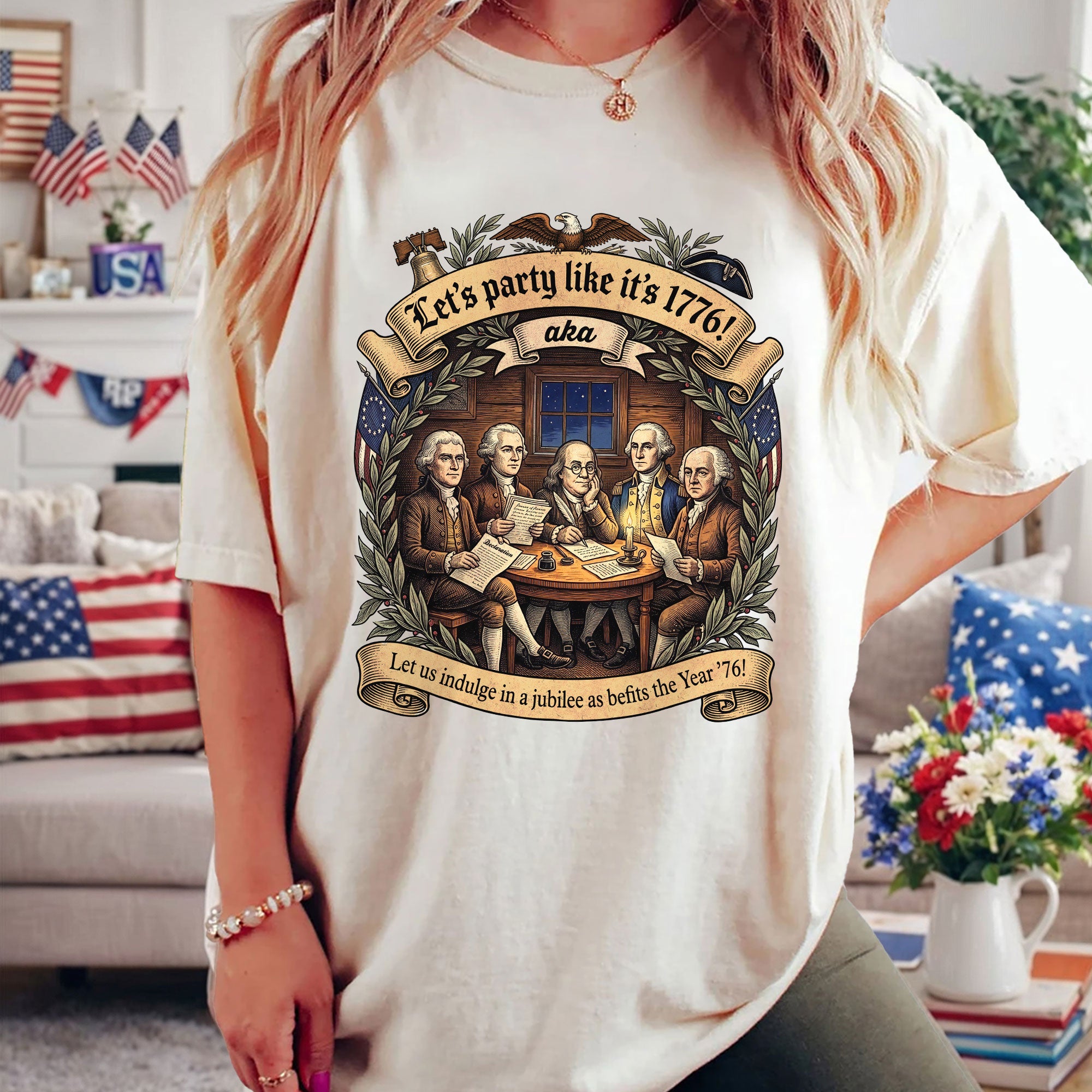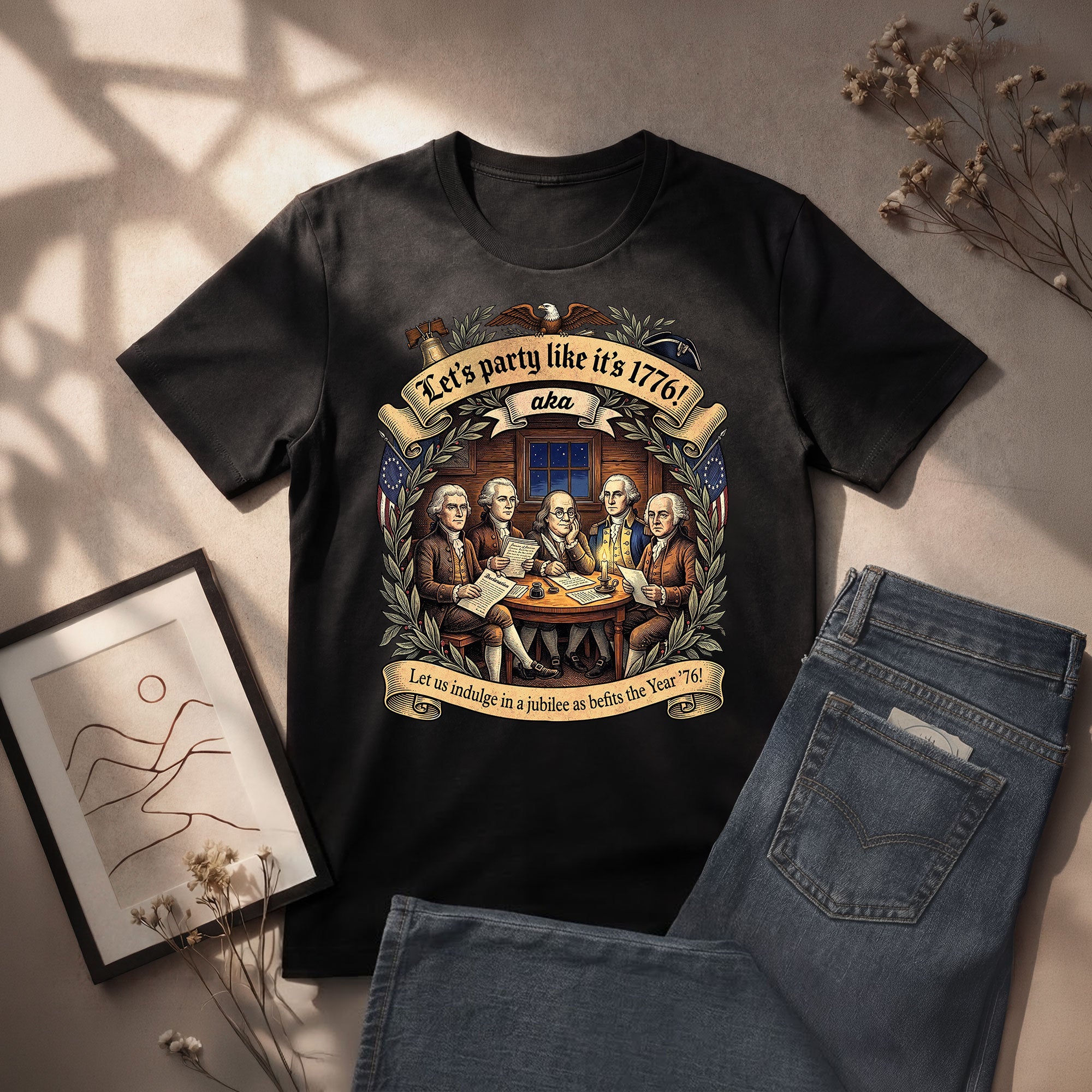 Celebrate America’s revolutionary spirit with this Let’s Party Like It’s 1776 vintage Founding Fathers patriotic USA unisex T-shirt. Featuring a classic retro illustration of the iconic Founding Fathers and the bold phrase “Let’s Party Like It’s 1776,” this comfortable tee is ideal for Independence Day celebrations, 250th USA anniversary events, Memorial Day, Fourth of July barbecues, or any patriotic gathering. Made from soft, breathable cotton-poly blend fabric, it offers a relaxed unisex fit for all-day wear. Perfect for history buffs, veterans, and proud Americans who love vintage-style apparel that honors the birth of the nation in 1776. Machine washable and durable for everyday use.