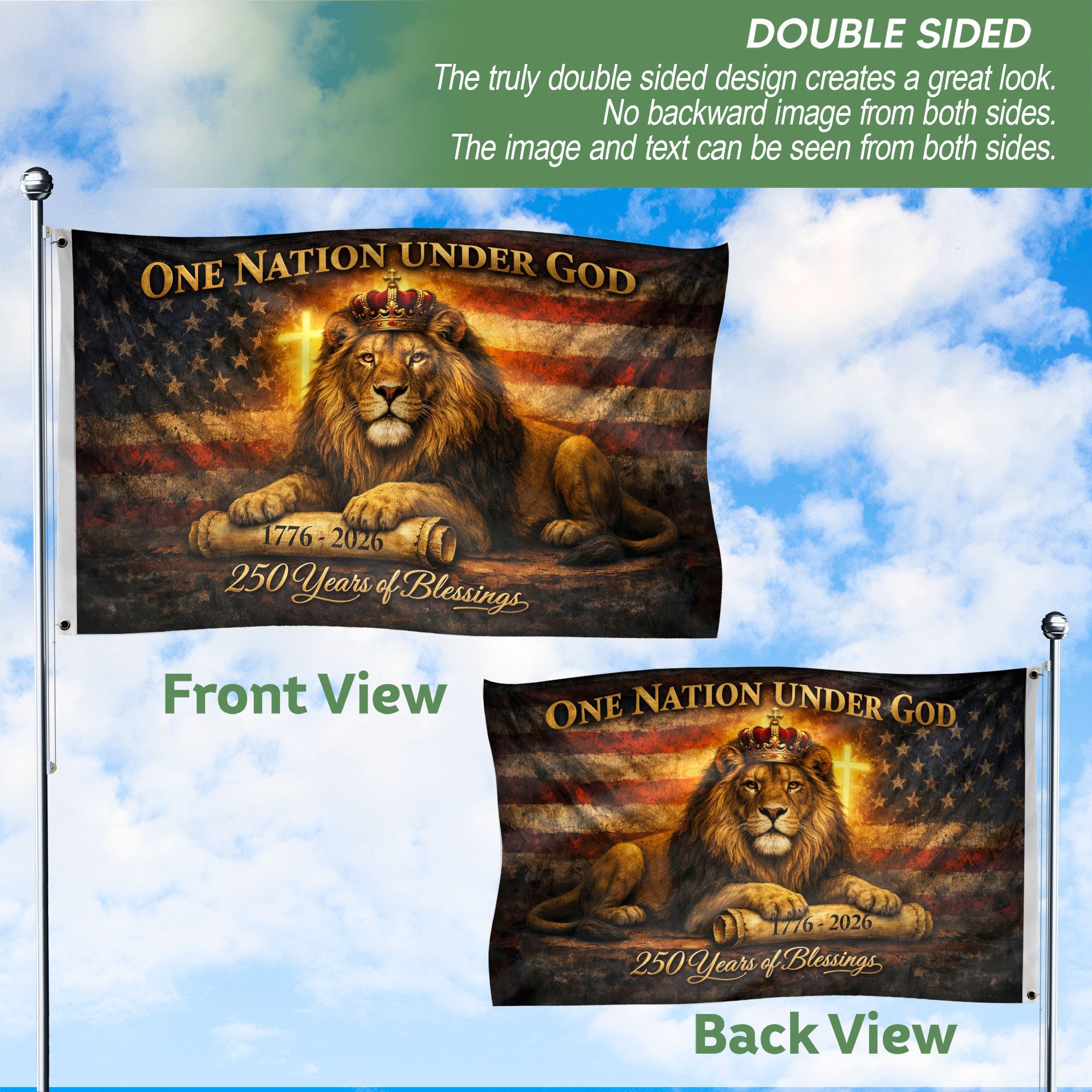 Celebrate 250 years of American resilience and blessings with the Lion of Judah American Heritage Flag, spanning 1776 to 2026. This double-sided patriotic banner prominently features the iconic Lion of Judah symbol alongside ‘One Nation Under God’ messaging, symbolizing the profound harmony of faith, liberty, and freedom that has shaped the United States. Made from high-quality, weather-resistant polyester fabric, it offers exceptional durability for indoor and outdoor use. Measuring standard flag size, it’s ideal for mounting on poles, walls, porches, or gardens. The vibrant, fade-resistant printing on both sides ensures bold colors and sharp details that withstand the elements over time. Perfect for Independence Day festivities, 250th anniversary commemorations, veterans’ events, historical displays, or everyday patriotic home decor. Display this banner to honor American heritage, spiritual pride, and the nation’s enduring journey.