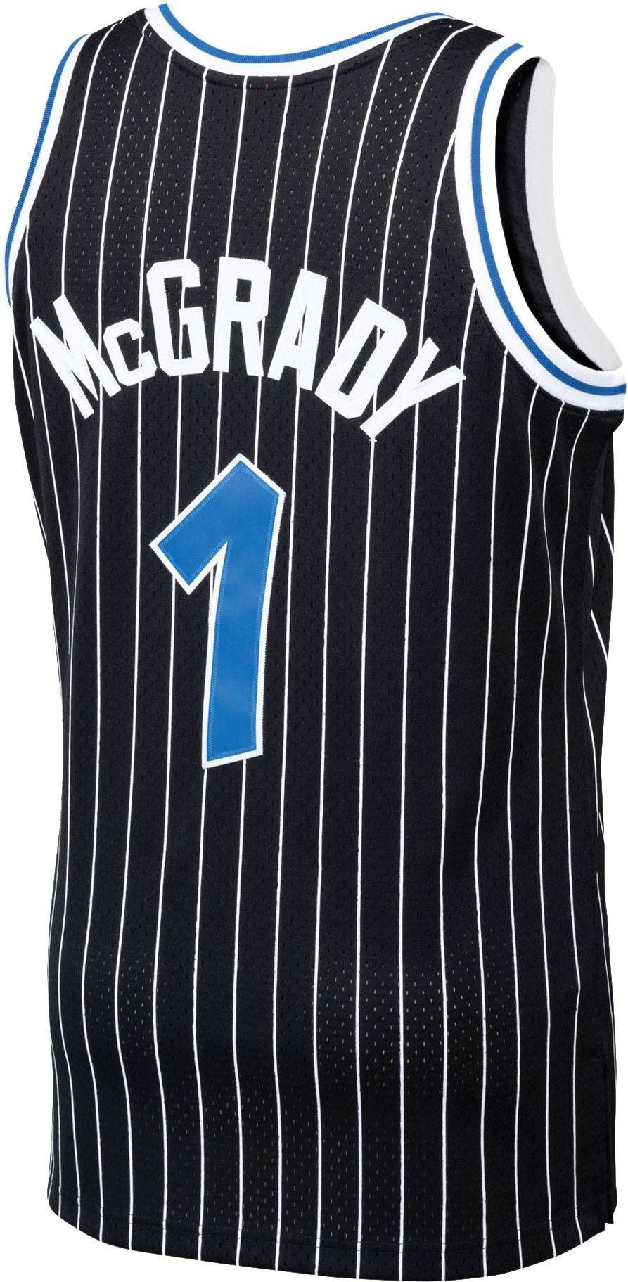 Experience the perfect blend of style and comfort with this Mitchell & Ness Men’s Orlando Magic Tracy McGrady #1 Swingman Black Jersey. Crafted from 100% polyester, this lightweight and breathable fabric ensures you stay cool and dry during workouts, games, or casual outings. The classic Swingman design features the iconic Tracy McGrady #1 and Orlando Magic graphics in a sleek black multicolor finish, offering a timeless look for basketball fans.