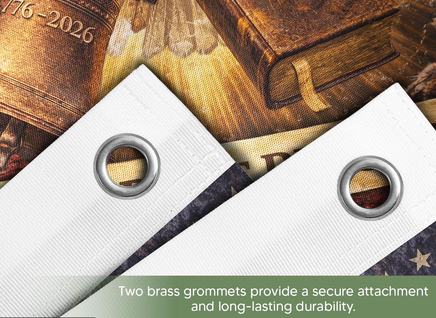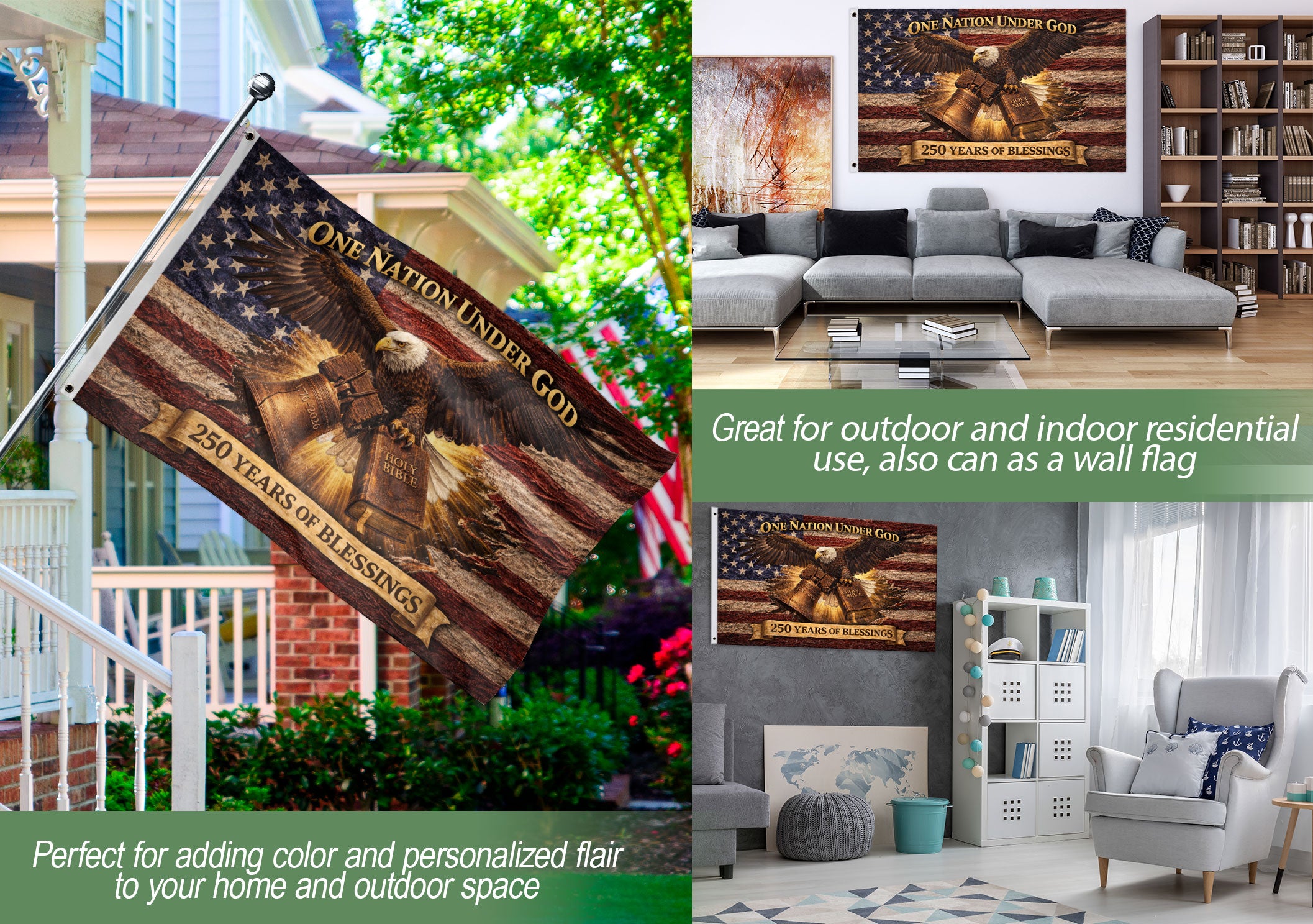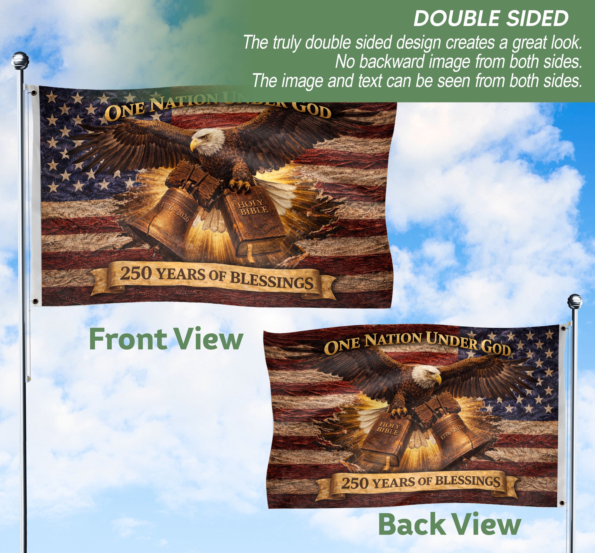 Celebrate 250 years of American independence from 1776 to 2026 with this striking patriotic Christian flag. The design features a majestic bald eagle soaring above a glowing Holy Bible and historic liberty bell, all set against a vintage American flag background. Bold text proclaims ‘One Nation Under God’ and ‘250 Years of Blessings,’ embodying faith, freedom, and national pride. Perfect for displaying at homes, churches, patriotic events, Fourth of July celebrations, or leading up to the 2026 semiquincentennial milestone. Crafted for durability and vibrant colors, this banner serves as a powerful symbol of America’s Christian heritage and enduring strength.