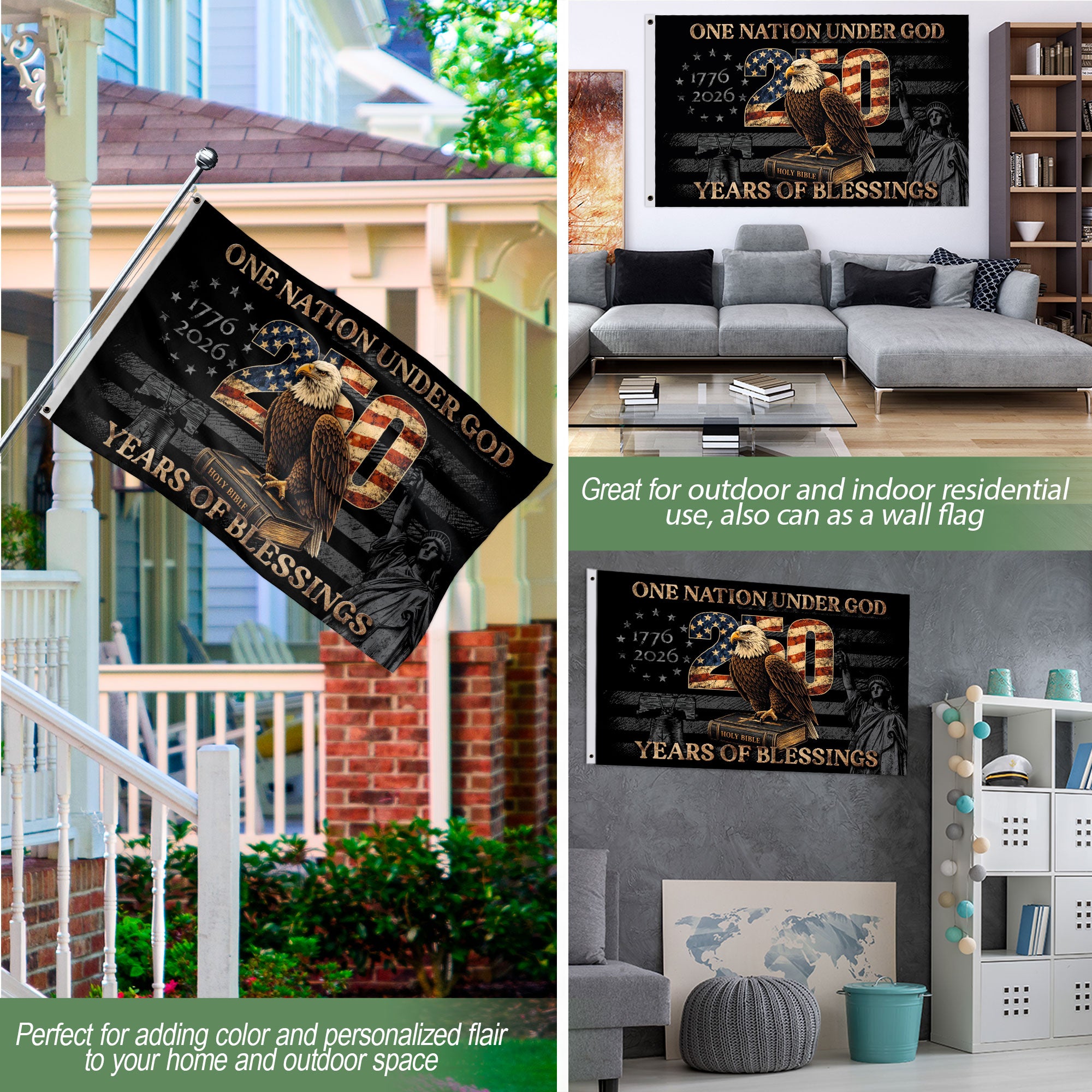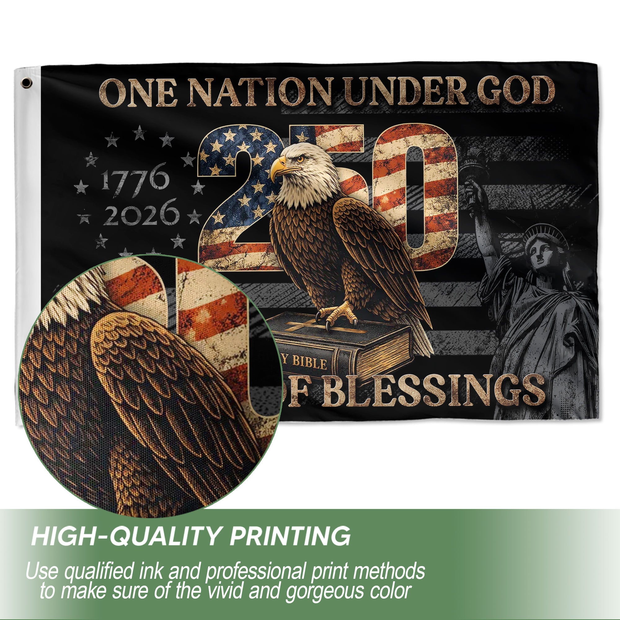 Celebrate 250 years of American history with the One Nation Under God Anniversary Flag, commemorating the period from 1776 to 2026. This double-sided patriotic banner showcases the enduring values of faith, freedom, and liberty that define the United States. Made from premium polyester, it offers exceptional durability, weather resistance, and vibrant colors that withstand outdoor elements. The bold graphics are printed on both sides for maximum visibility, making it ideal for hanging on poles, porches, walls, or fences. Perfect for Fourth of July parades, patriotic events, home decorations, semiquincentennial celebrations, or displaying national pride indoors or outdoors. Easy to install with reinforced edges and grommets, this USA flag banner captures the spirit of America’s founding principles and resilience through the ages.