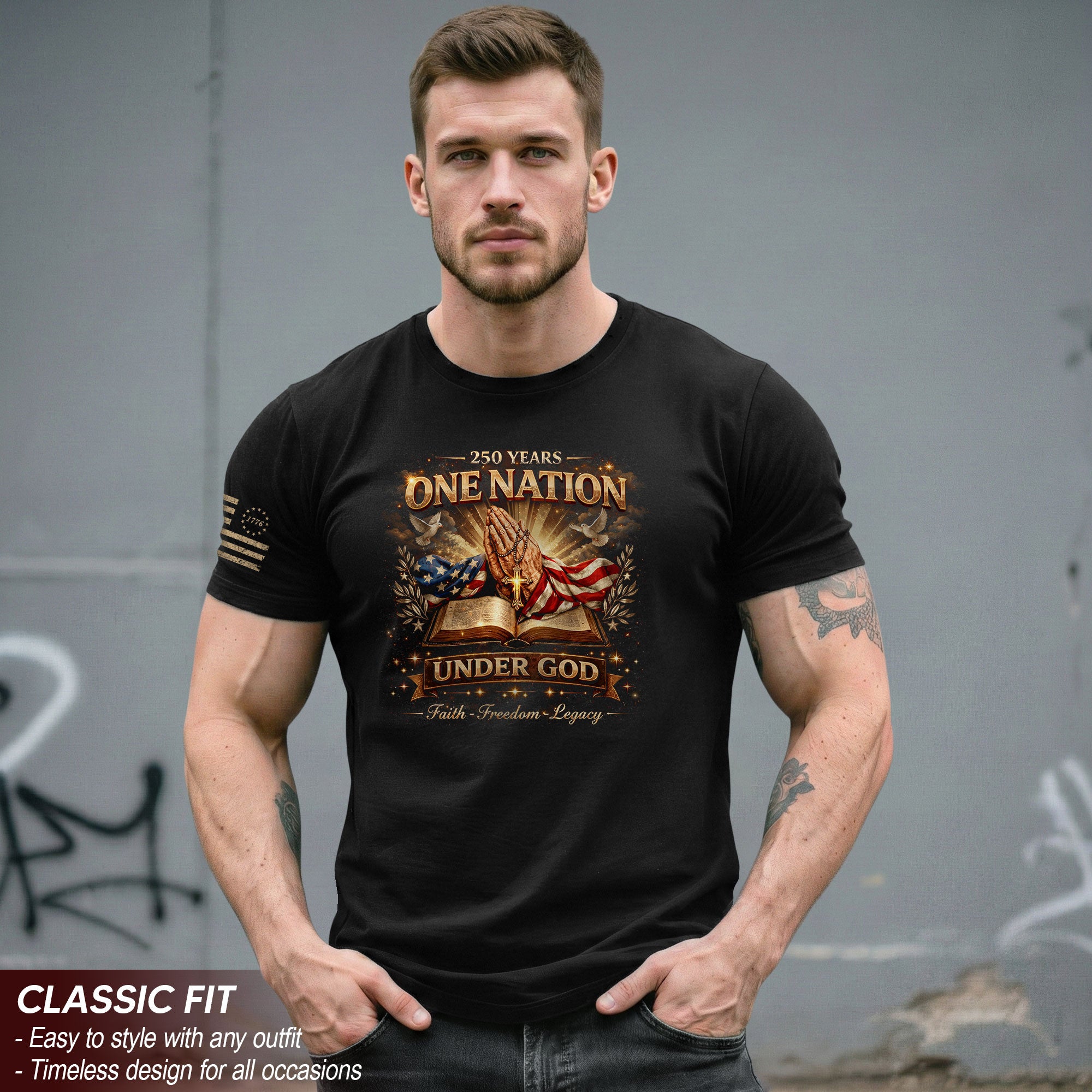 Celebrate America’s 250th birthday from 1776 to 2026 with this One Nation Under God T-shirt. Featuring iconic praying hands with patriotic accents in red, white, and blue, it honors the legacy of faith, freedom, unity, and the enduring American spirit. Crafted from soft, breathable cotton for all-day comfort, this unisex tee is perfect for Independence Day celebrations, veterans’ events, patriotic gatherings, or everyday wear expressing national pride. Available in multiple sizes, it’s a timeless piece of merchandise for anyone cherishing the nation’s founding principles and history.