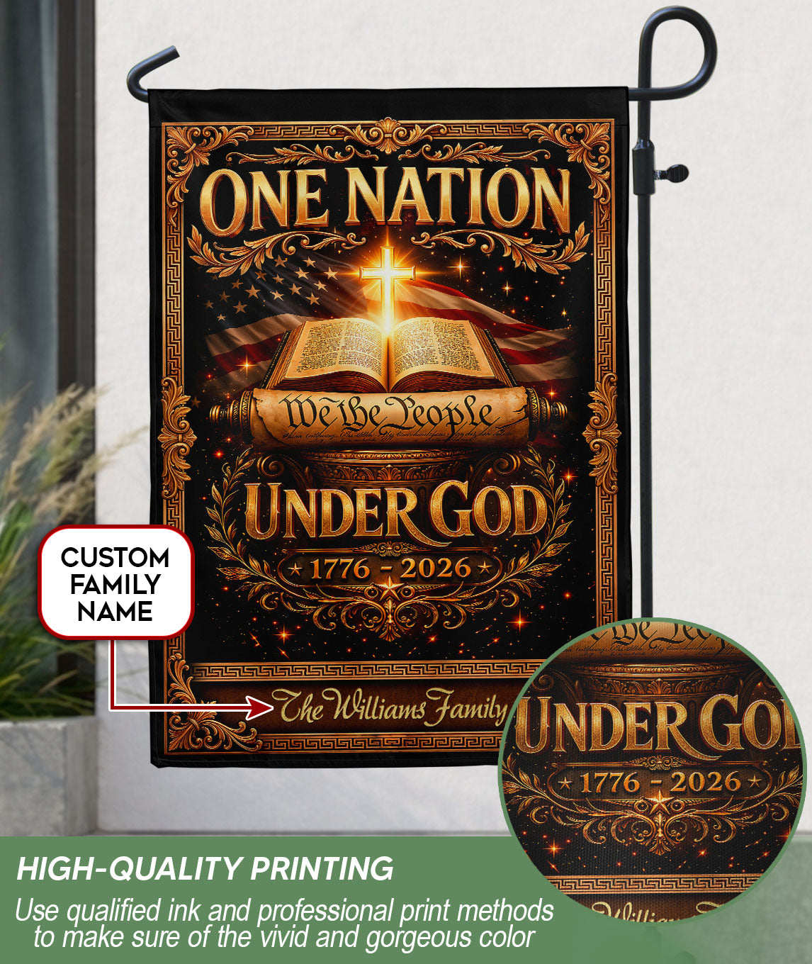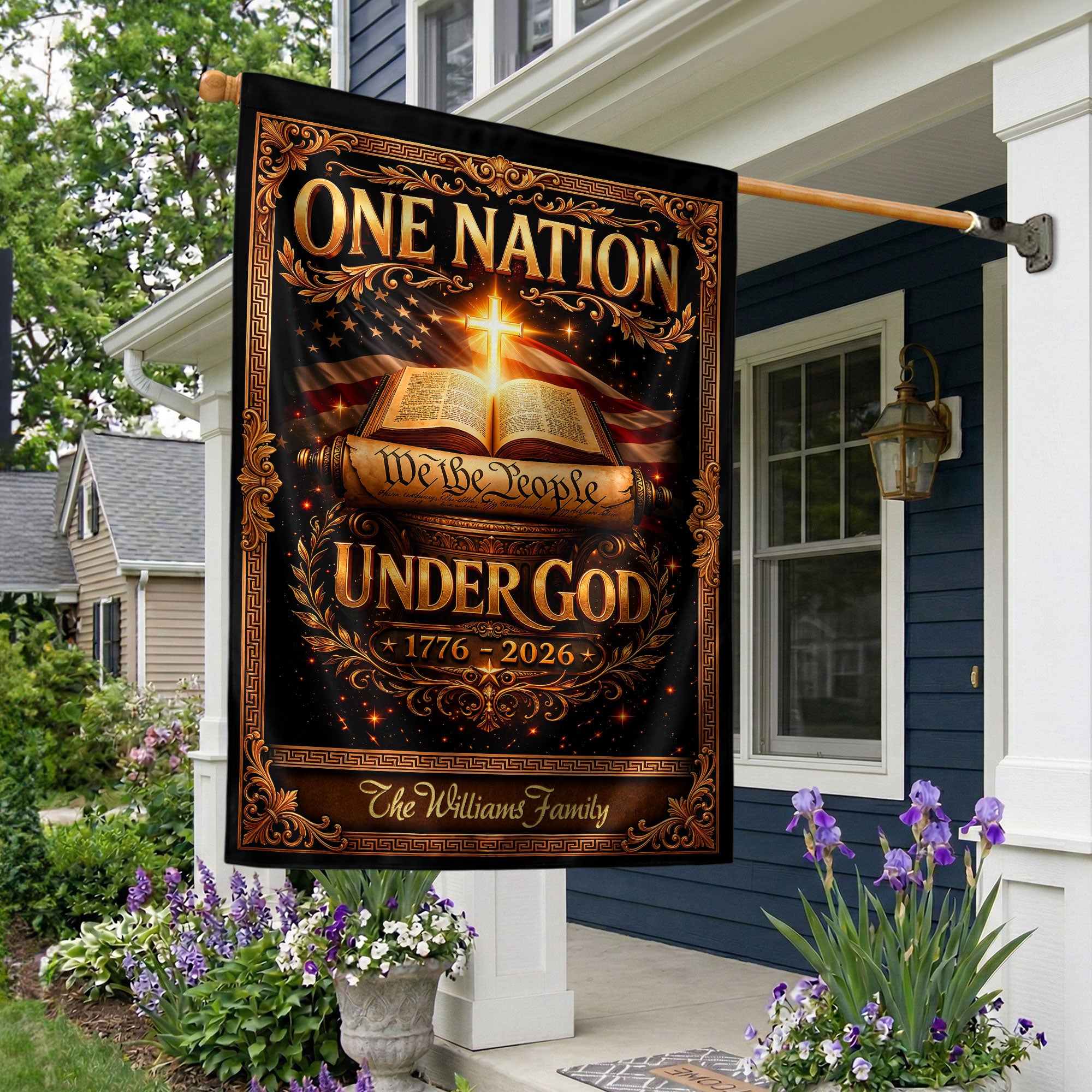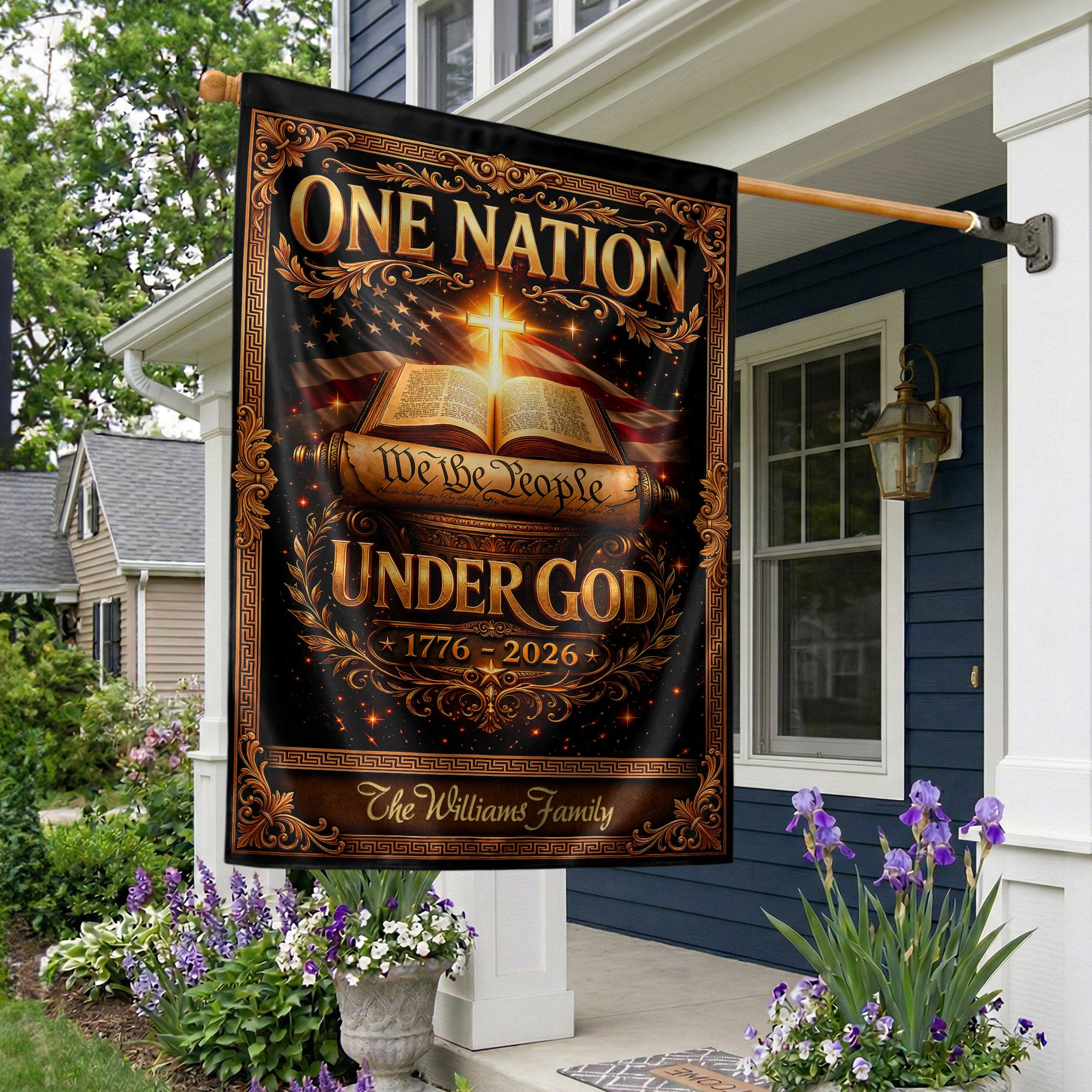 Celebrate America’s 250th anniversary from 1776 to 2026 with this custom family name garden flag. The design proudly features ‘One Nation Under God,’ the Bible, a Christian cross, and ‘We the People’ to honor the nation’s spiritual heritage and historical journey. Crafted for outdoor display, this personalized garden flag adds patriotic pride to your yard, porch, or garden bed. Ideal for families, history enthusiasts, and faith-based celebrations. Customize with your family name for a unique commemorative piece that withstands weather and serves as a meaningful gift.