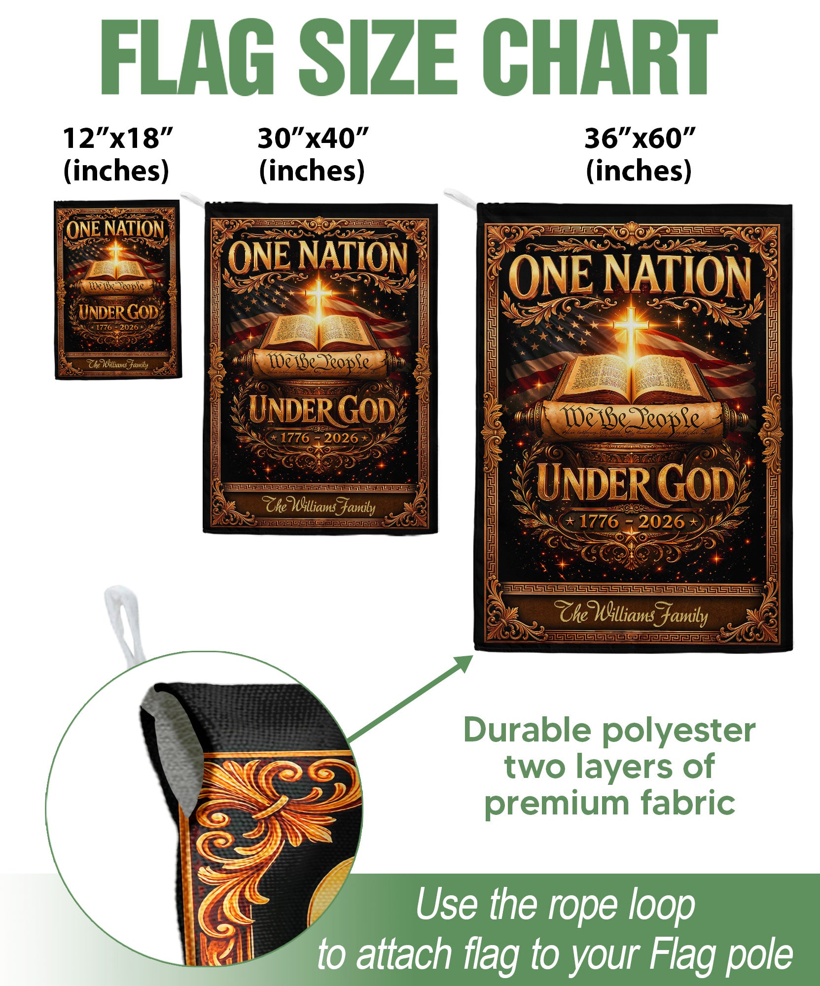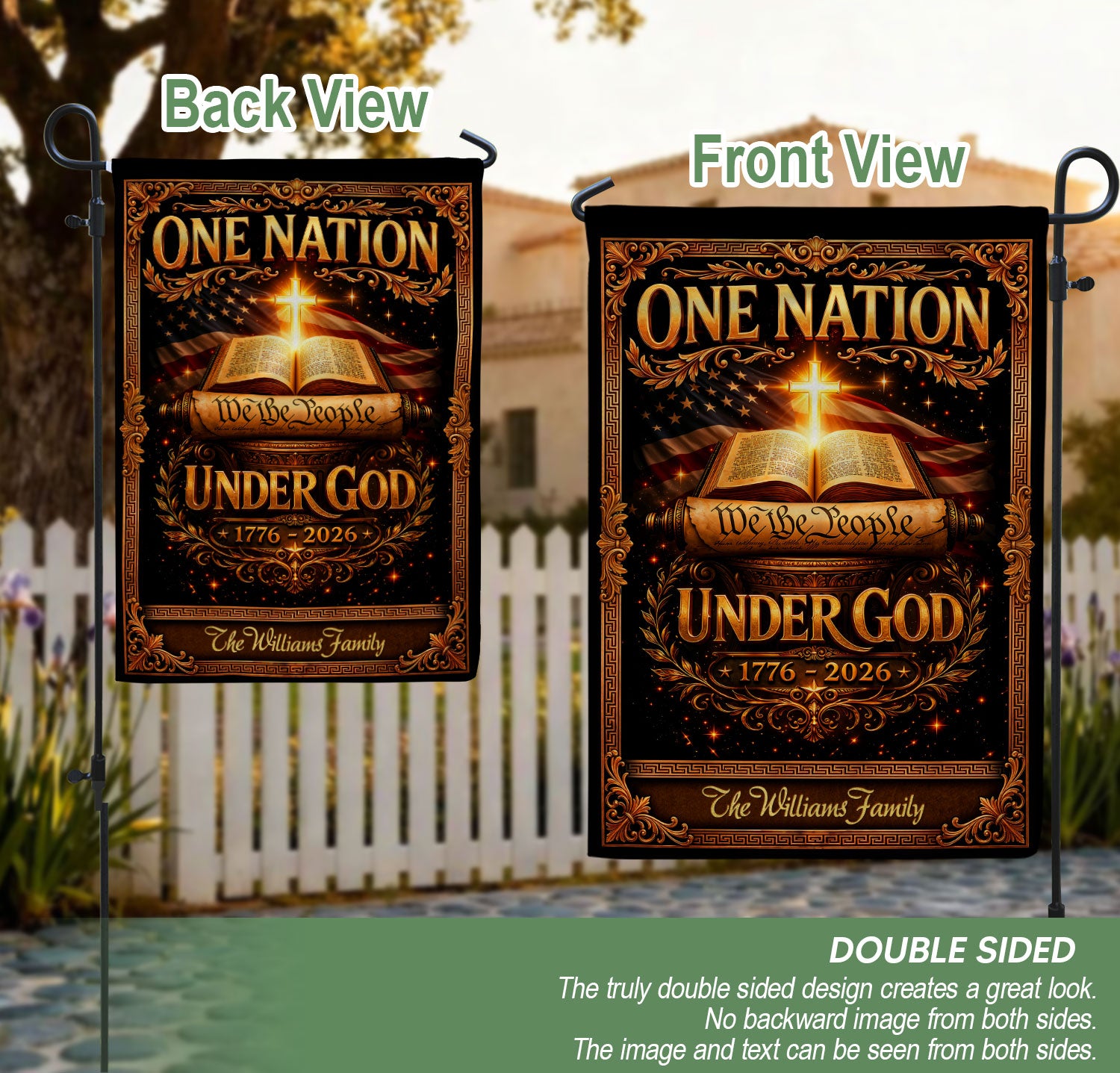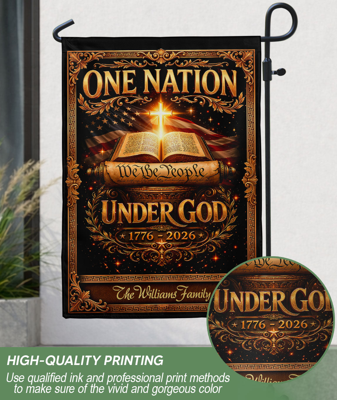 Celebrate America’s 250th anniversary from 1776 to 2026 with this custom family name garden flag. The design proudly features ‘One Nation Under God,’ the Bible, a Christian cross, and ‘We the People’ to honor the nation’s spiritual heritage and historical journey. Crafted for outdoor display, this personalized garden flag adds patriotic pride to your yard, porch, or garden bed. Ideal for families, history enthusiasts, and faith-based celebrations. Customize with your family name for a unique commemorative piece that withstands weather and serves as a meaningful gift.