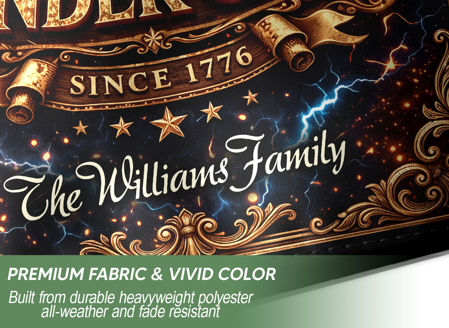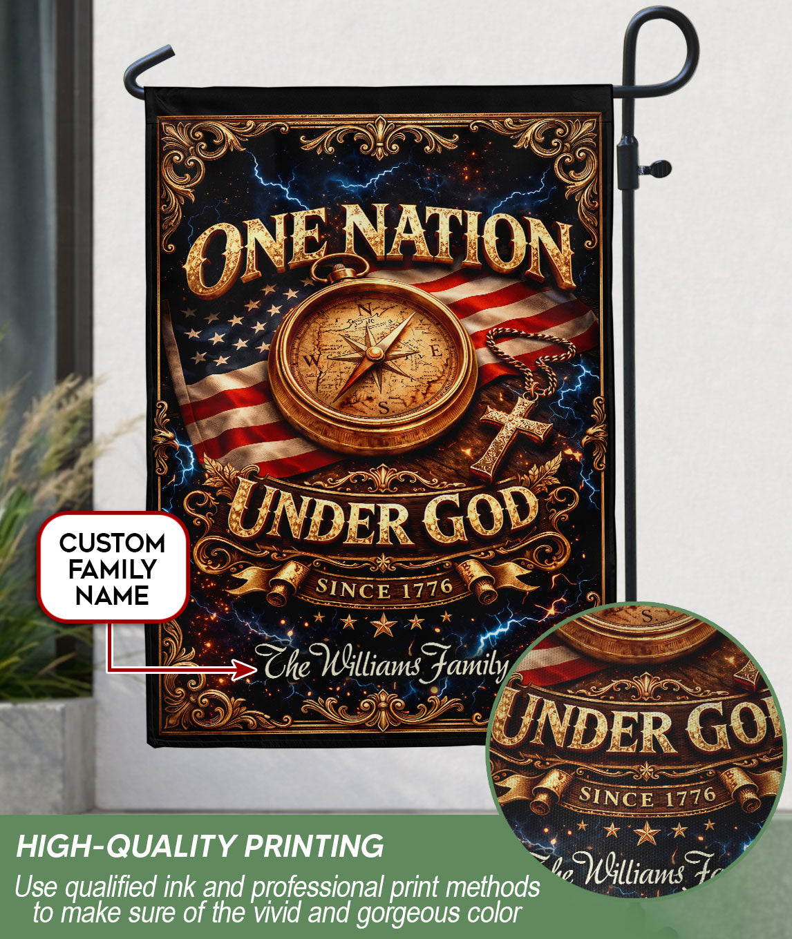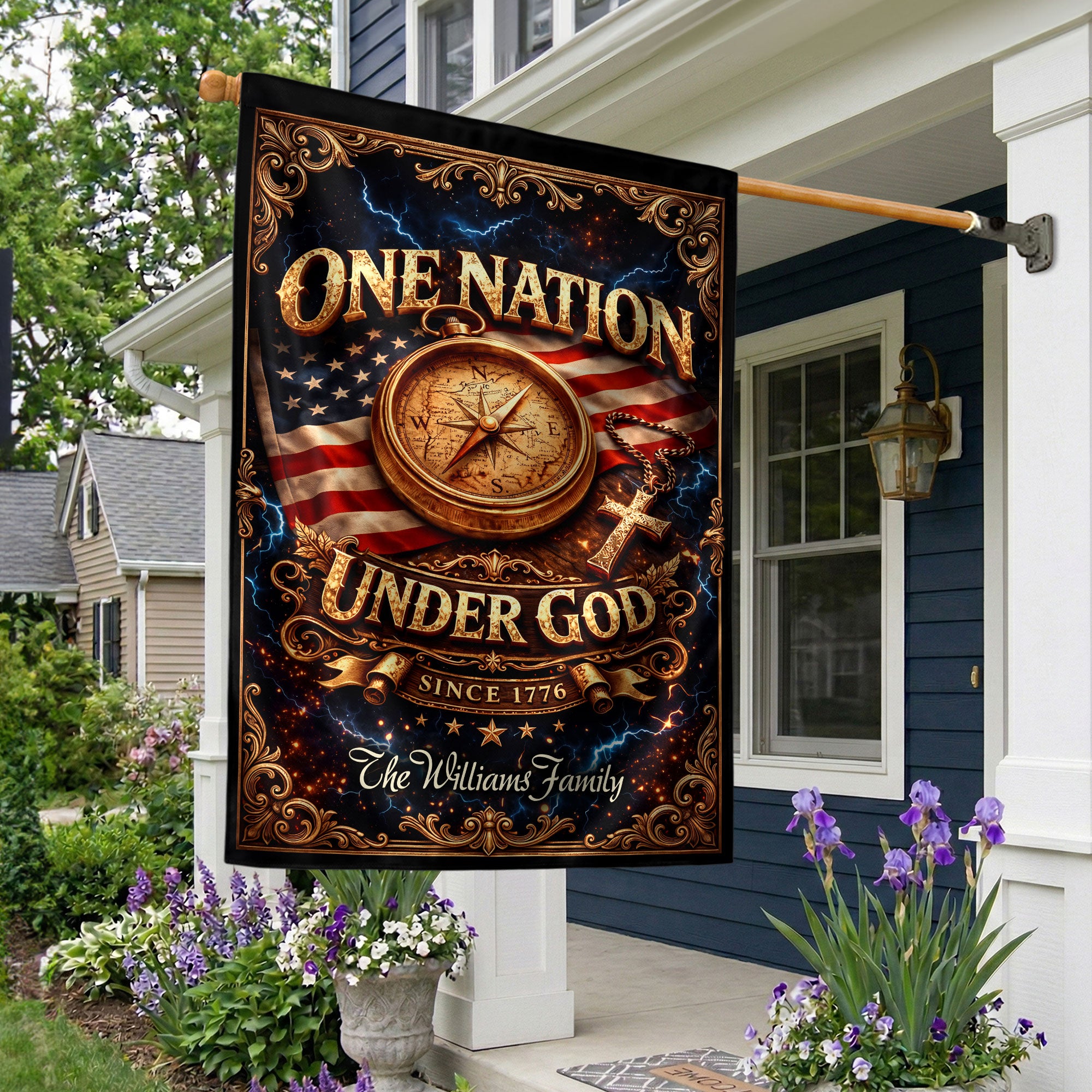 Celebrate America’s 250th anniversary from 1776 to 2026 with this custom family name garden flag. The design features ‘One Nation Under God’ text, a compass rose, Christian cross, and the iconic USA flag, symbolizing faith, freedom, and national heritage. Made for outdoor display, this durable garden flag adds patriotic pride to your yard, porch, or garden bed. Personalize it with your family name for a unique touch that honors your lineage during this historic milestone. Ideal as a family gift, home decor, or commemorative piece for Independence Day celebrations, historical events, or everyday display. Weather-resistant material ensures long-lasting vibrancy in gardens, patios, or entryways.