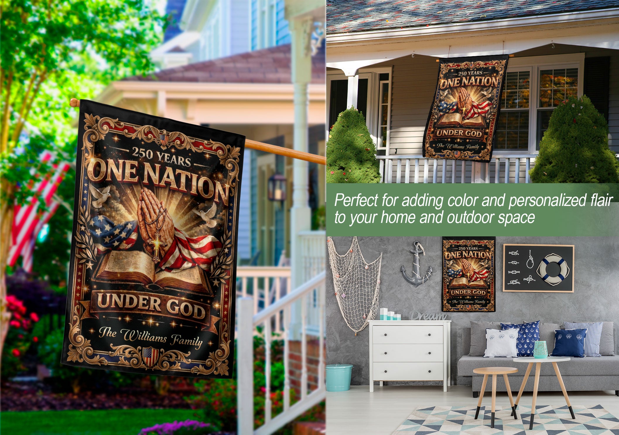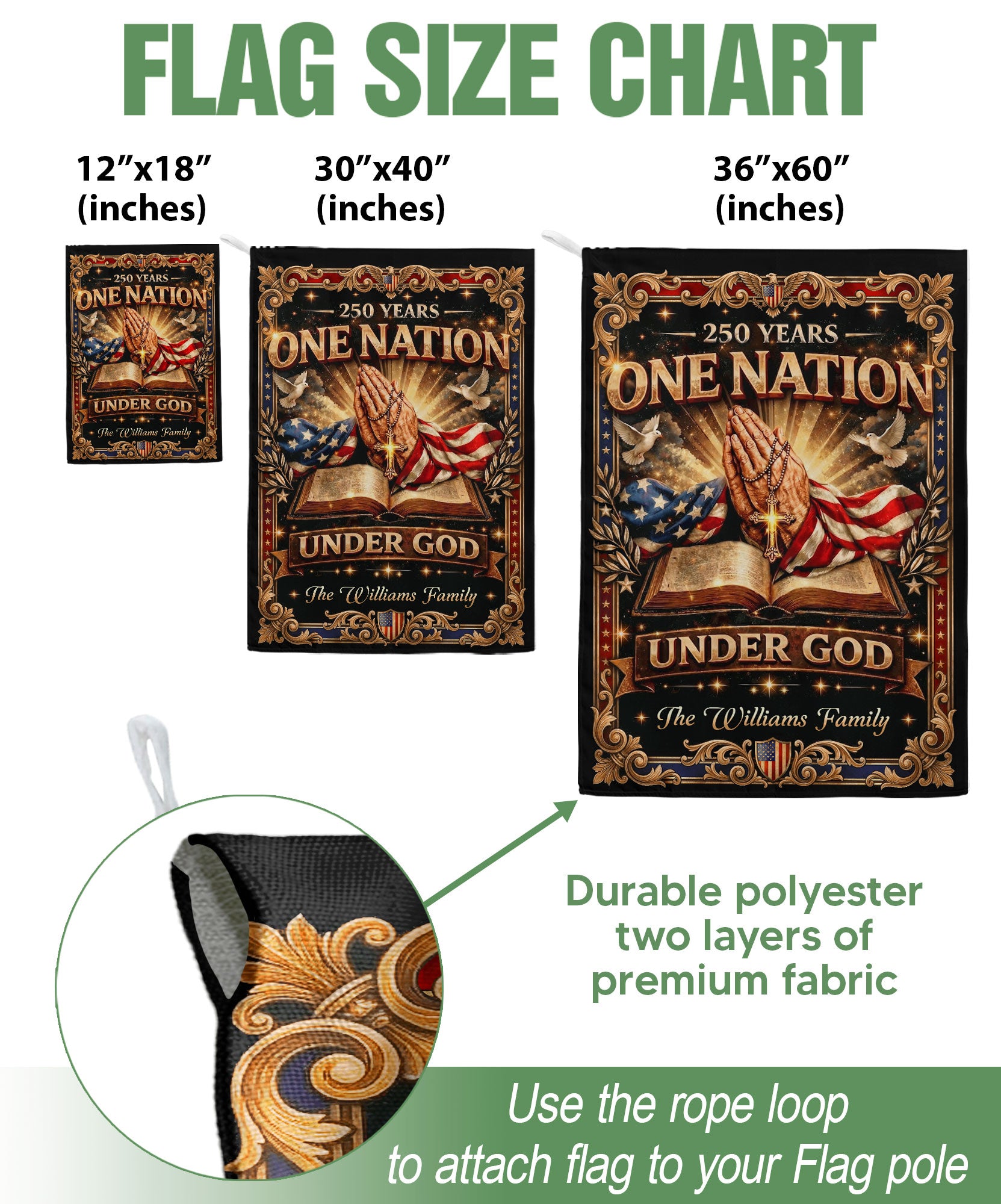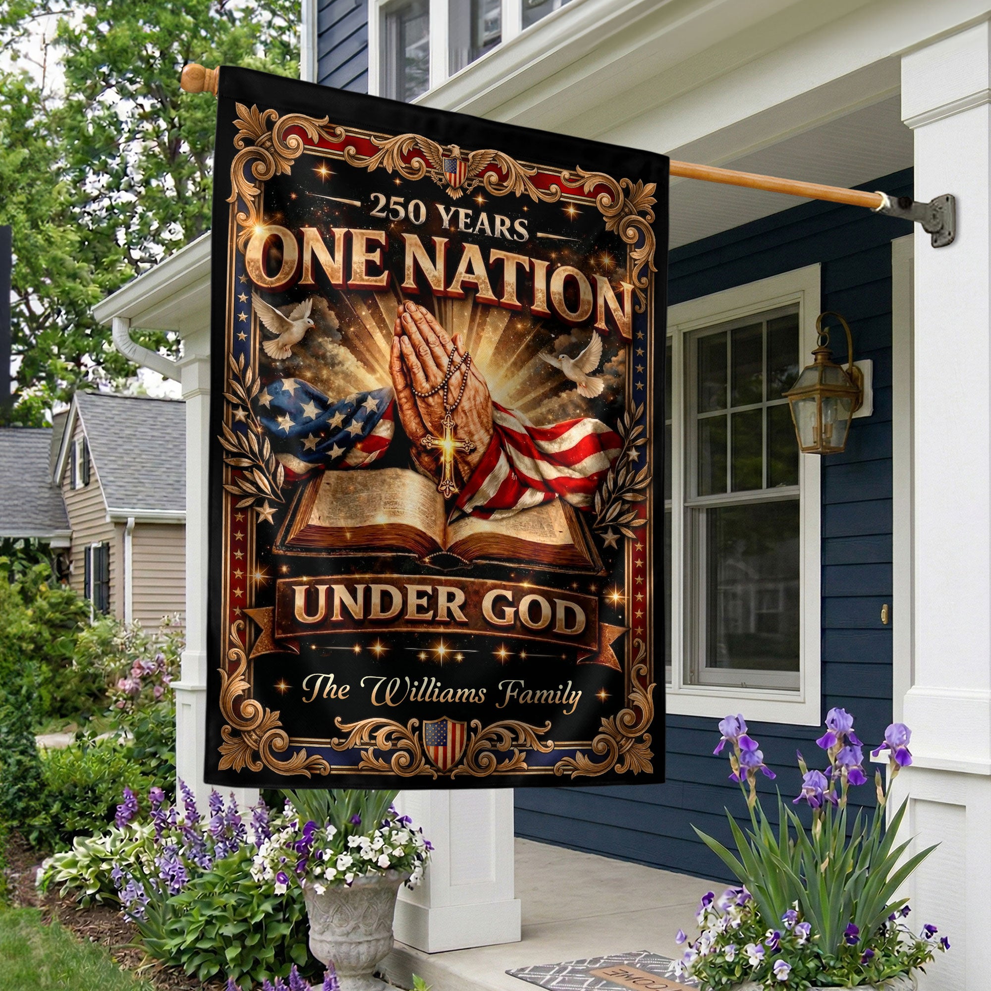 Celebrate America’s 250th anniversary from 1776 to 2026 with this custom family name garden flag. Featuring iconic praying hands, an open Bible, a prominent cross, and the inspiring ‘One Nation Under God’ inscription, this flag honors the nation’s spiritual heritage and historic journey. Personalized with your family name, it’s crafted for durability to withstand outdoor conditions, making it ideal for gardens, porches, patios, or yards. Perfect for patriots, history enthusiasts, or as a meaningful gift for family gatherings, Independence Day, or commemorative events. Easy to display on standard garden flag poles (not included). Show your faith and pride in this limited-edition design.