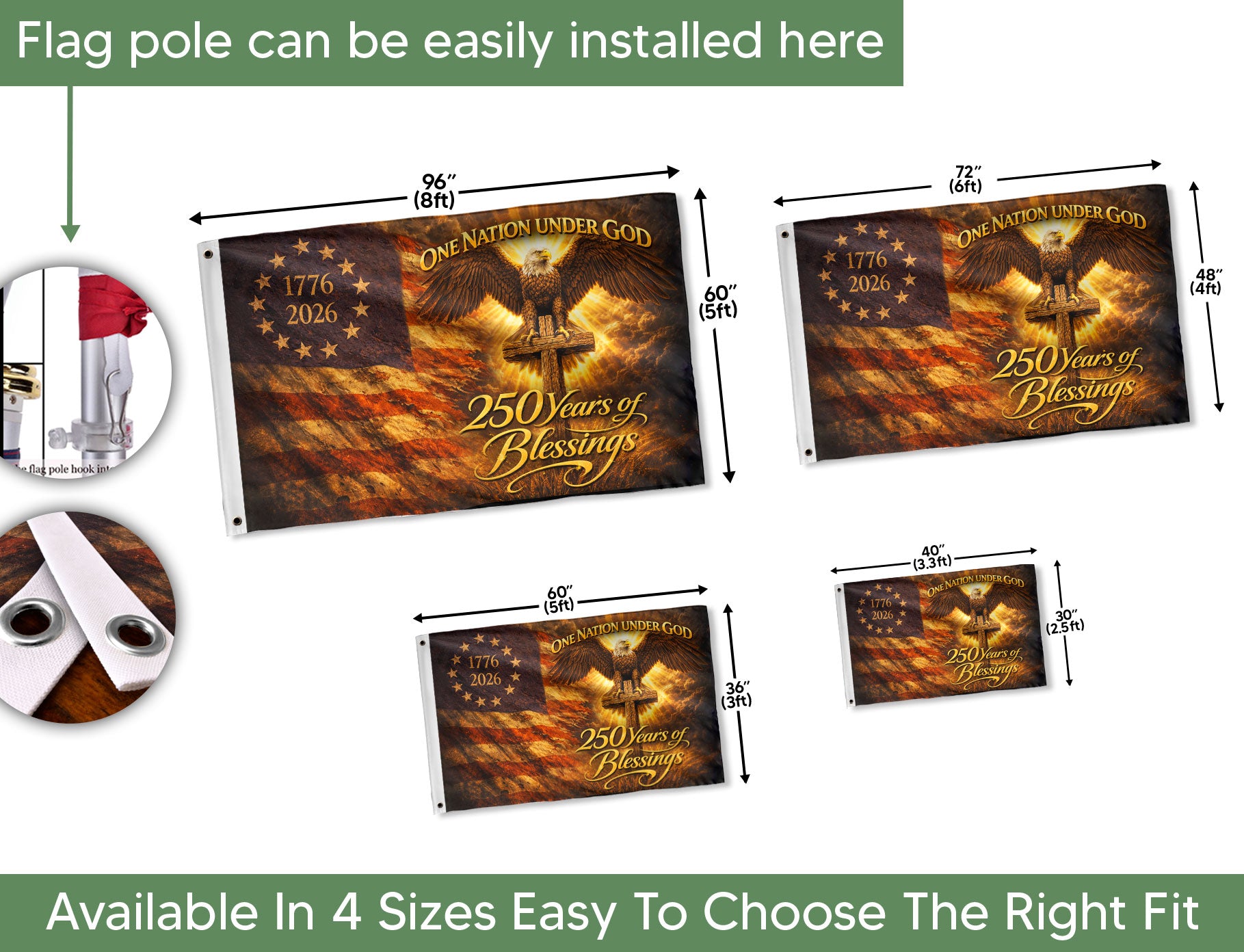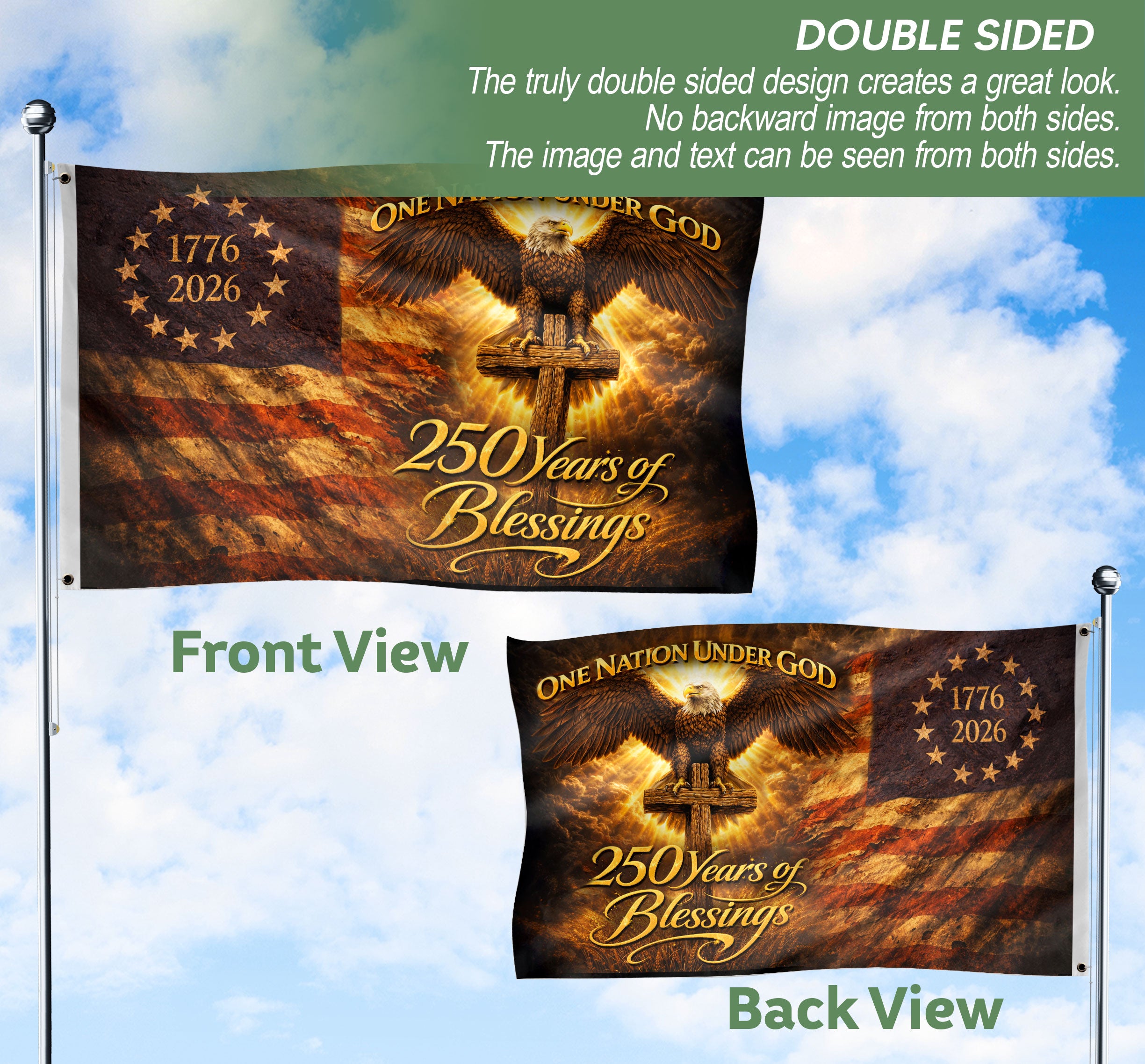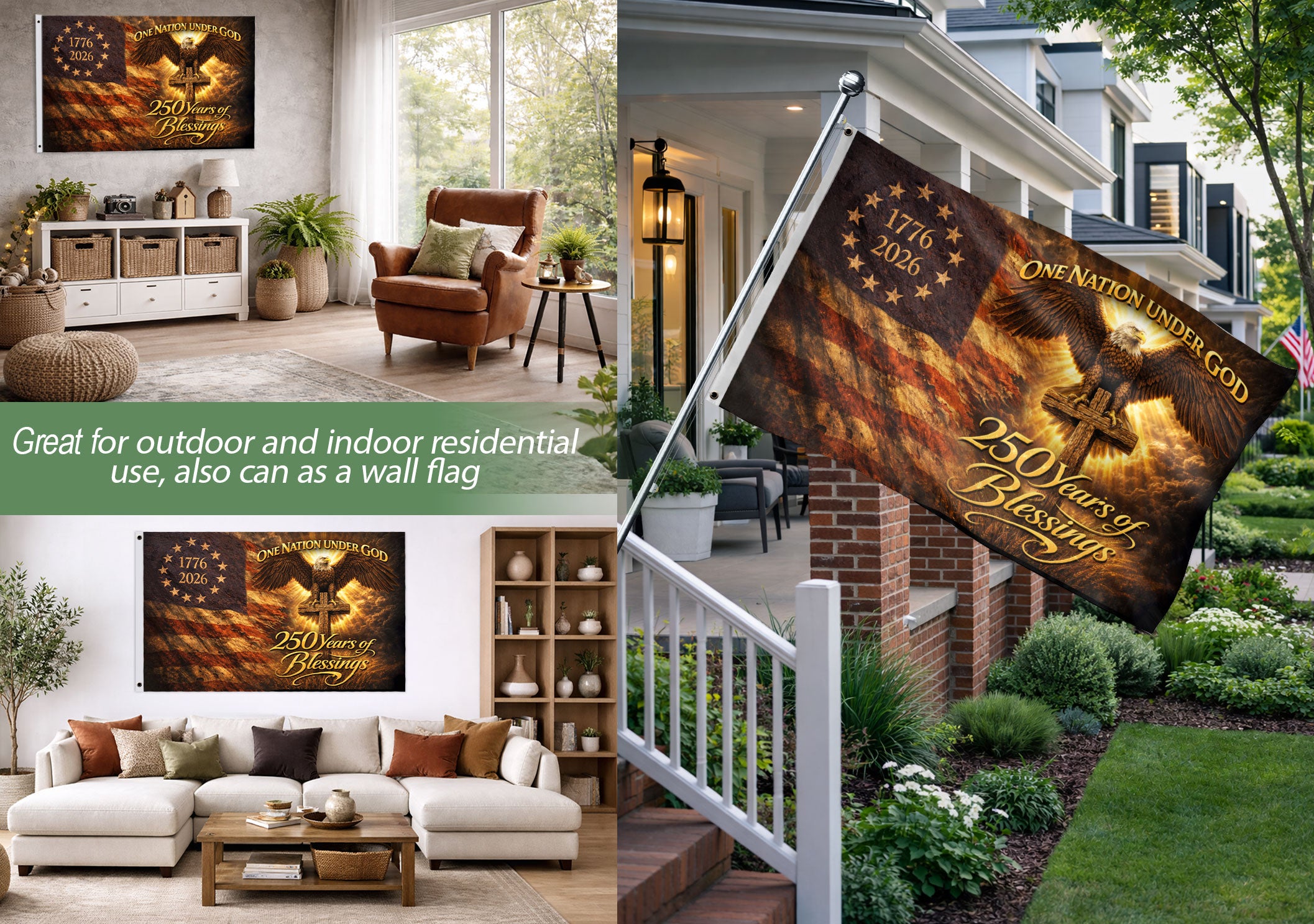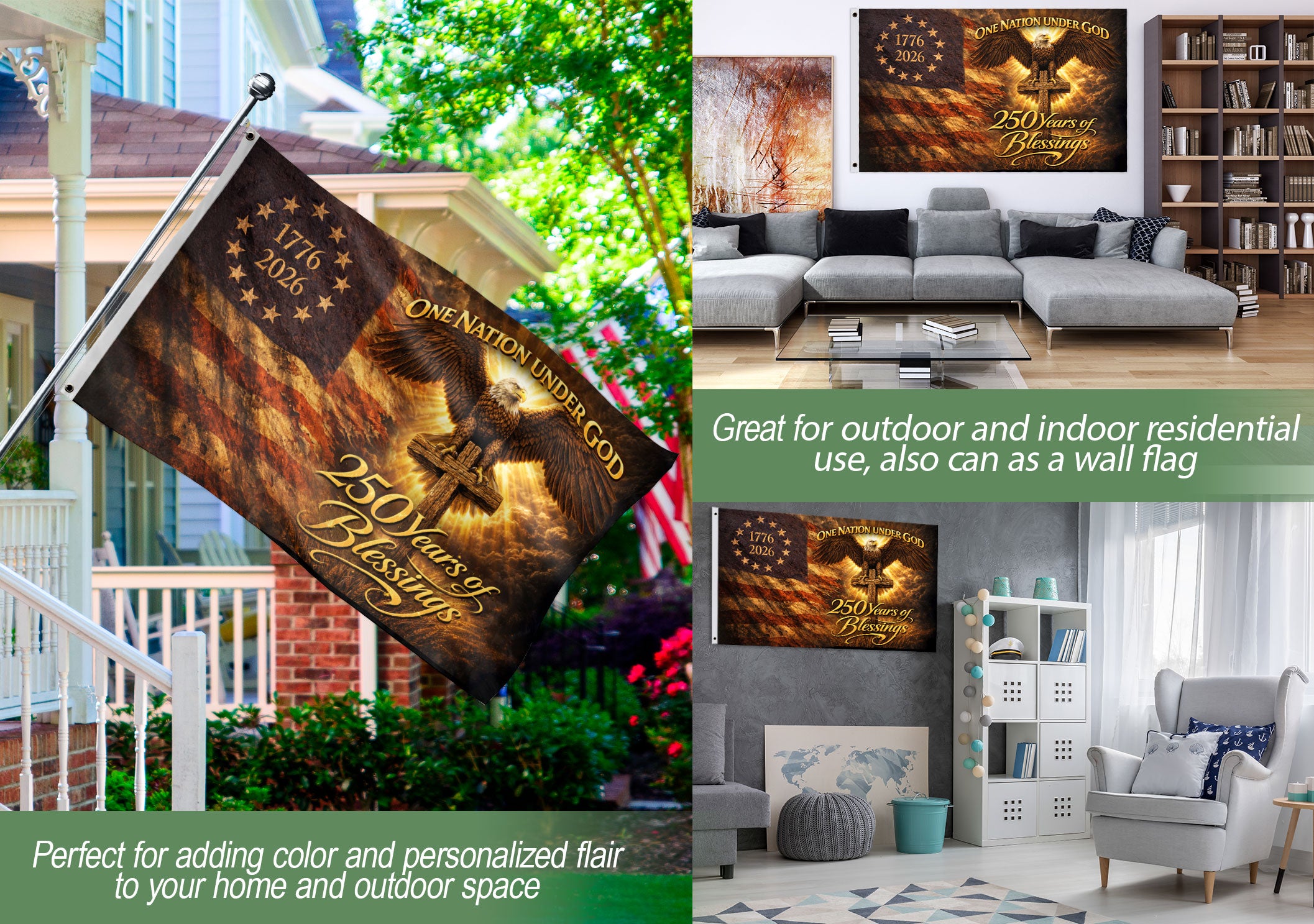 Celebrate faith, freedom, and American pride with this Patriotic Christian House Flag. Featuring a majestic eagle perched on a cross under the bold text ‘One Nation Under God,’ set against a vintage American flag background. It commemorates the journey from 1776 to 2026, ideal for the USA 250th anniversary. Perfect for displaying on your porch, yard, or home to showcase your Christian values and patriotism. Durable design suitable for outdoor use, bringing blessings and inspiration to your decor. High-quality printed flag that withstands weather while maintaining vibrant colors and details.