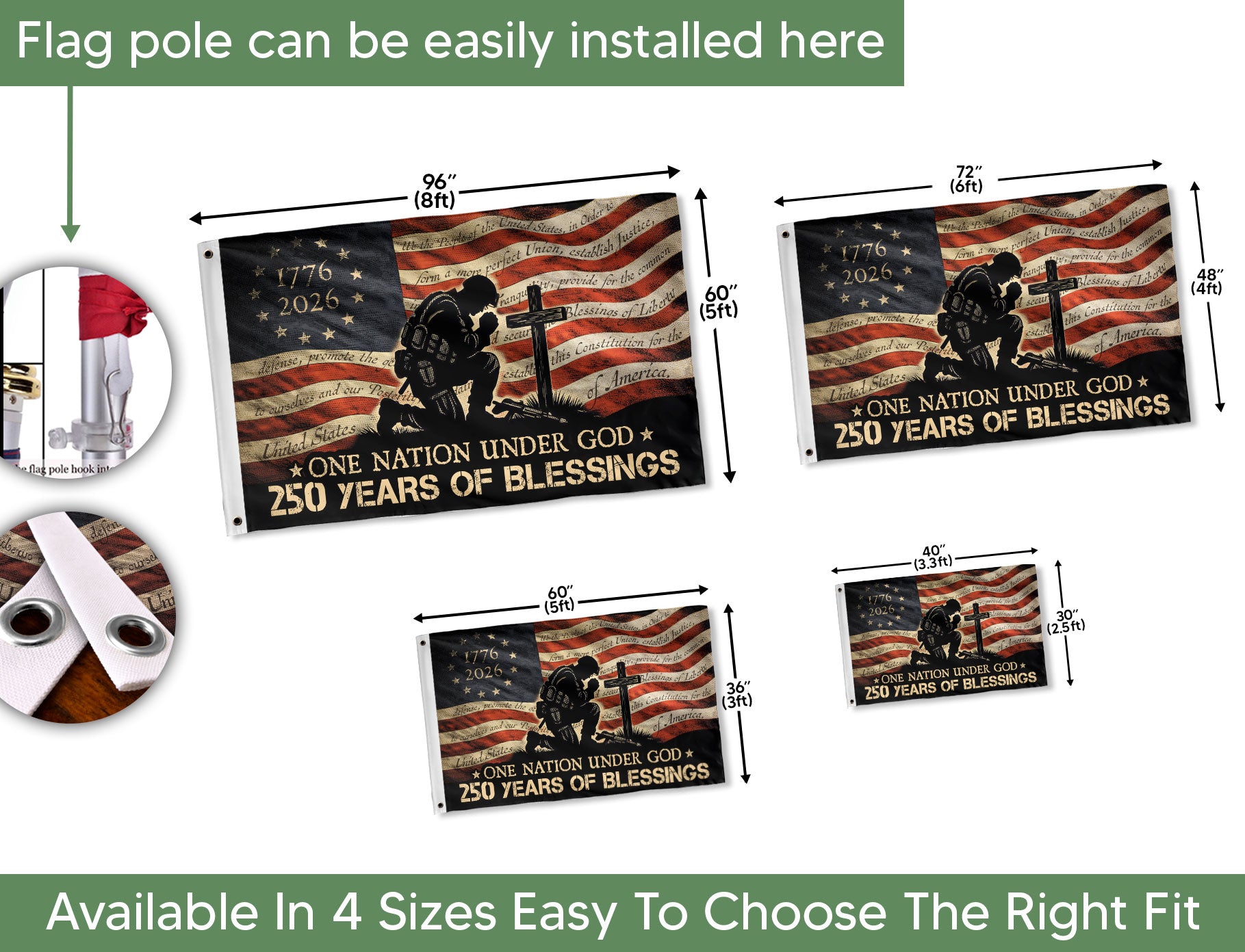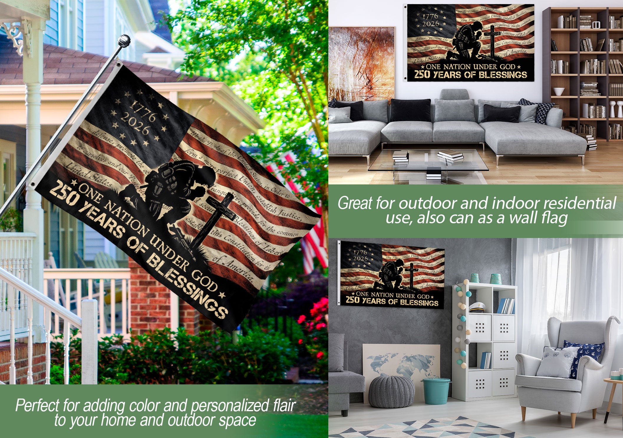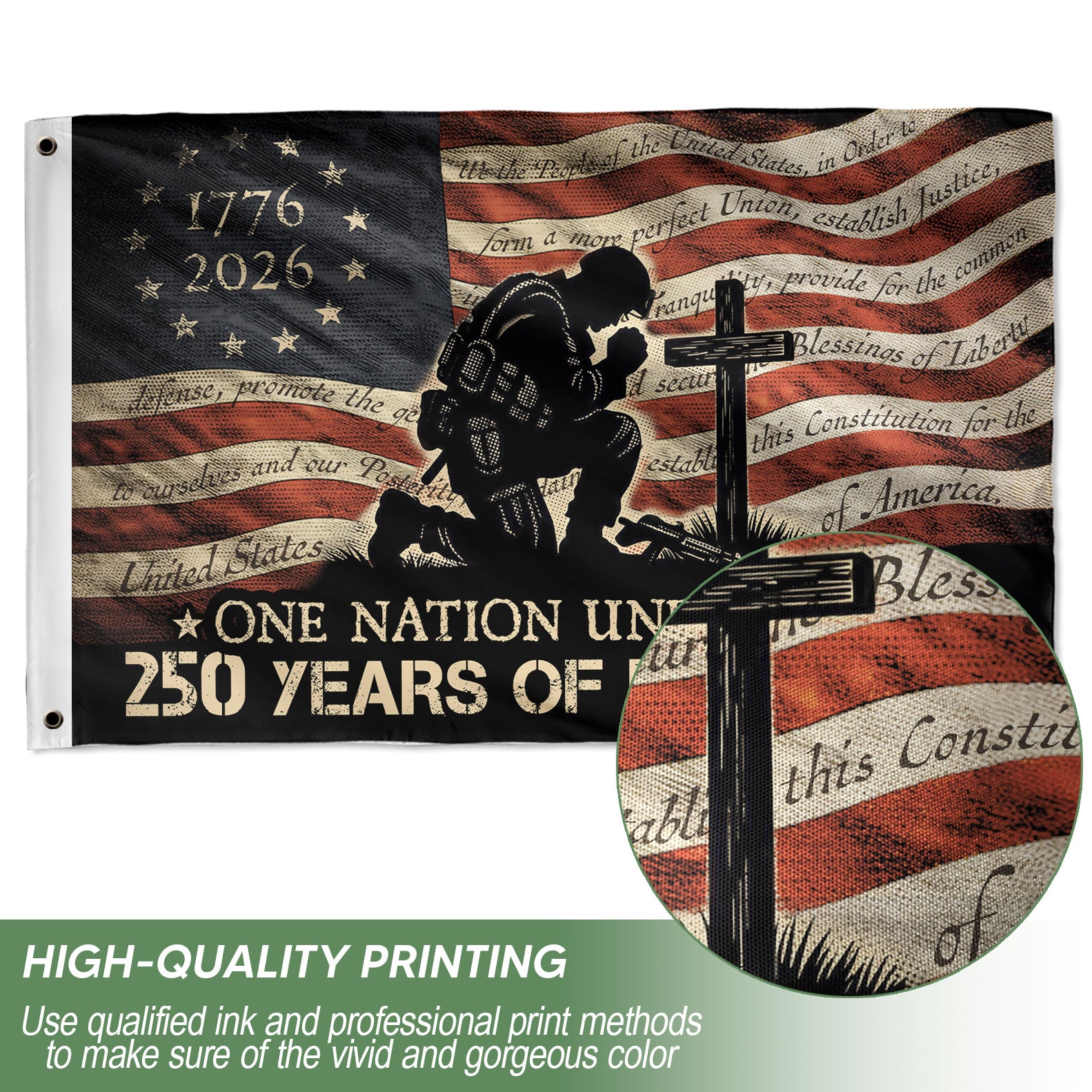 Display your faith, patriotism, and gratitude with this Patriotic Christian House Flag. Featuring a powerful image of a kneeling soldier in prayer at the cross, accompanied by the inspiring message ‘One Nation Under God’ and ‘250 Years of Blessings,’ this flag honors military sacrifice, American freedom, and divine providence. Crafted for outdoor durability, it’s perfect for homes, porches, gardens, or patriotic displays during holidays like Fourth of July, Memorial Day, or Veterans Day. The vibrant design combines red, white, and blue colors with religious symbolism, making it a meaningful addition to any Christian or veteran household. Easy to hang with standard house flag poles (not included), weather-resistant fabric ensures long-lasting beauty through seasons.