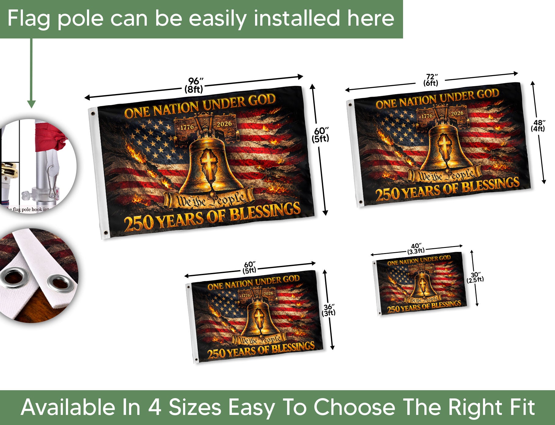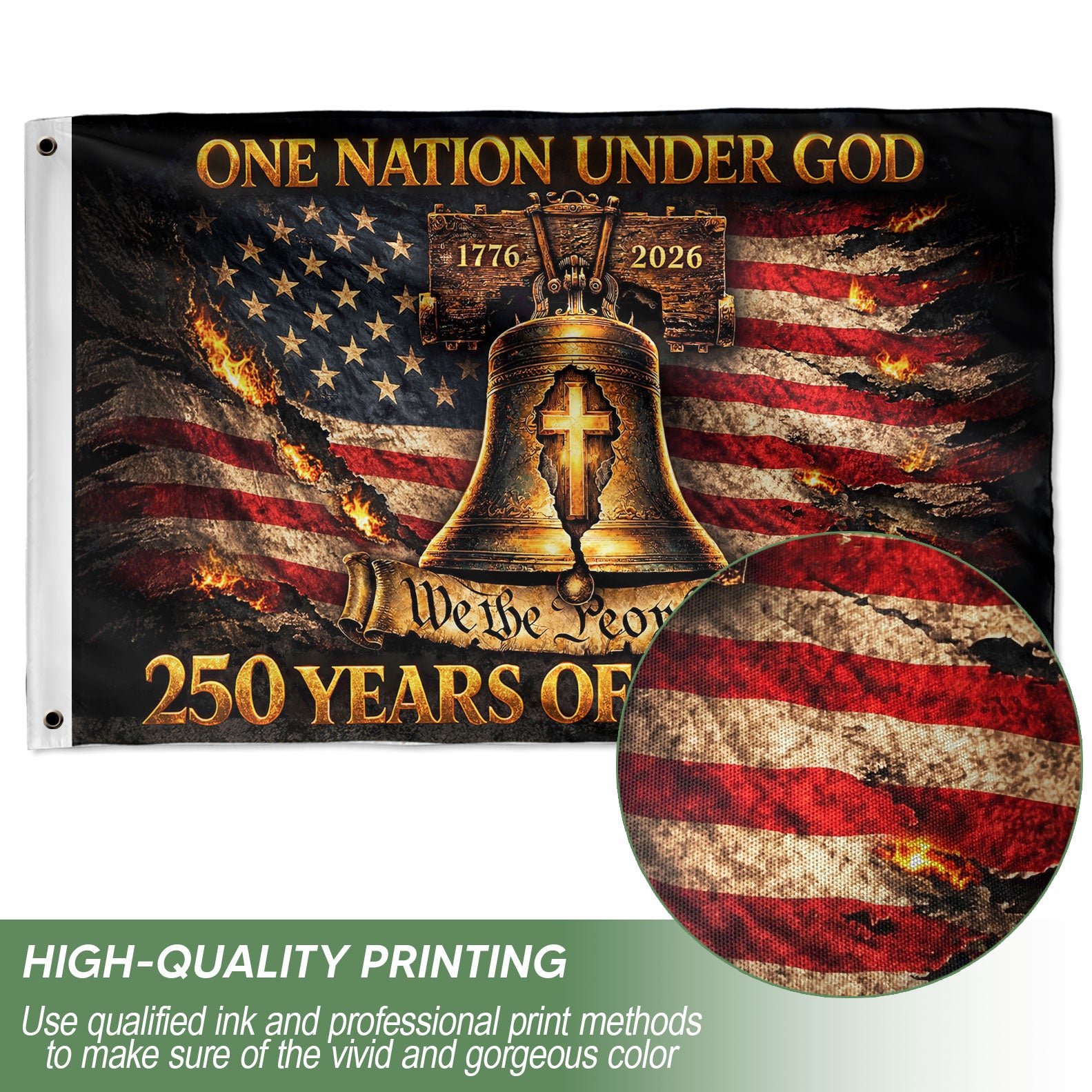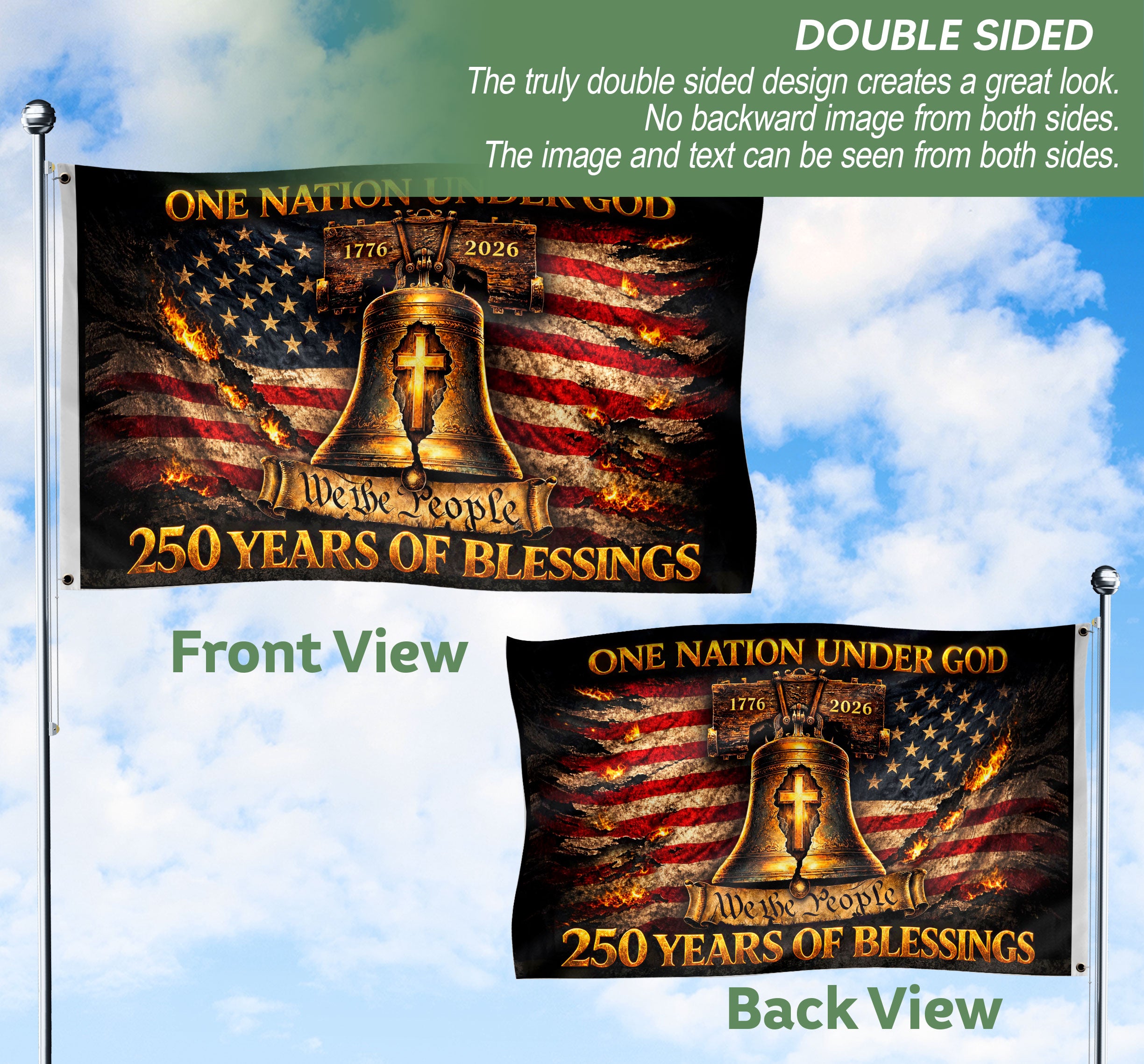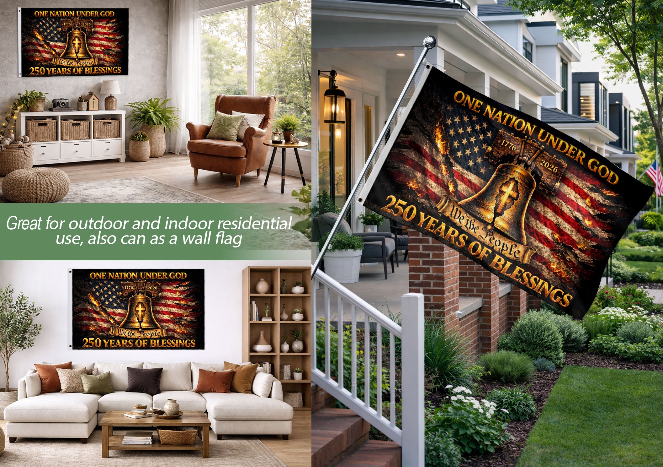Celebrate faith, freedom, and American heritage with this Patriotic Christian House Flag. Featuring a striking Liberty Bell cross design, it proudly displays the timeless messages ‘One Nation Under God’ and ‘We The People.’ Commemorating the historic period from 1776 to 2026, this bold house flag is perfect for displaying on your porch, yard, or home entrance. Crafted for durability and vibrant outdoor use, it honors national pride and Christian values. Ideal for patriots, history enthusiasts, and those who cherish the nation’s founding principles. Easy to hang and weather-resistant, making it a meaningful addition to any outdoor space during holidays, Independence Day, or year-round.