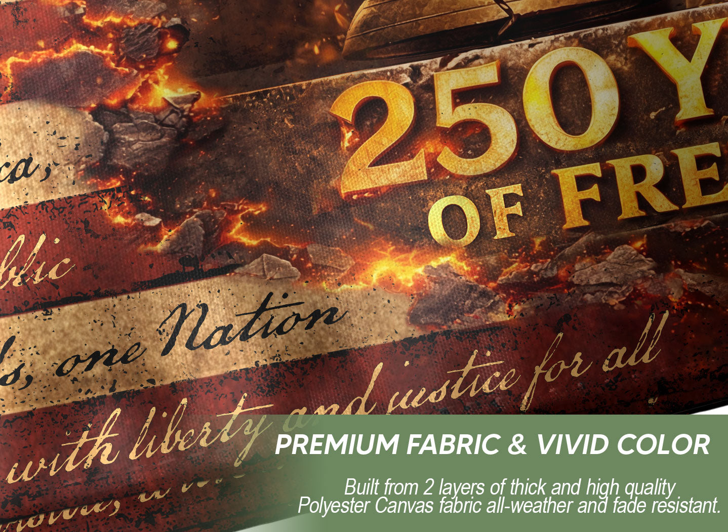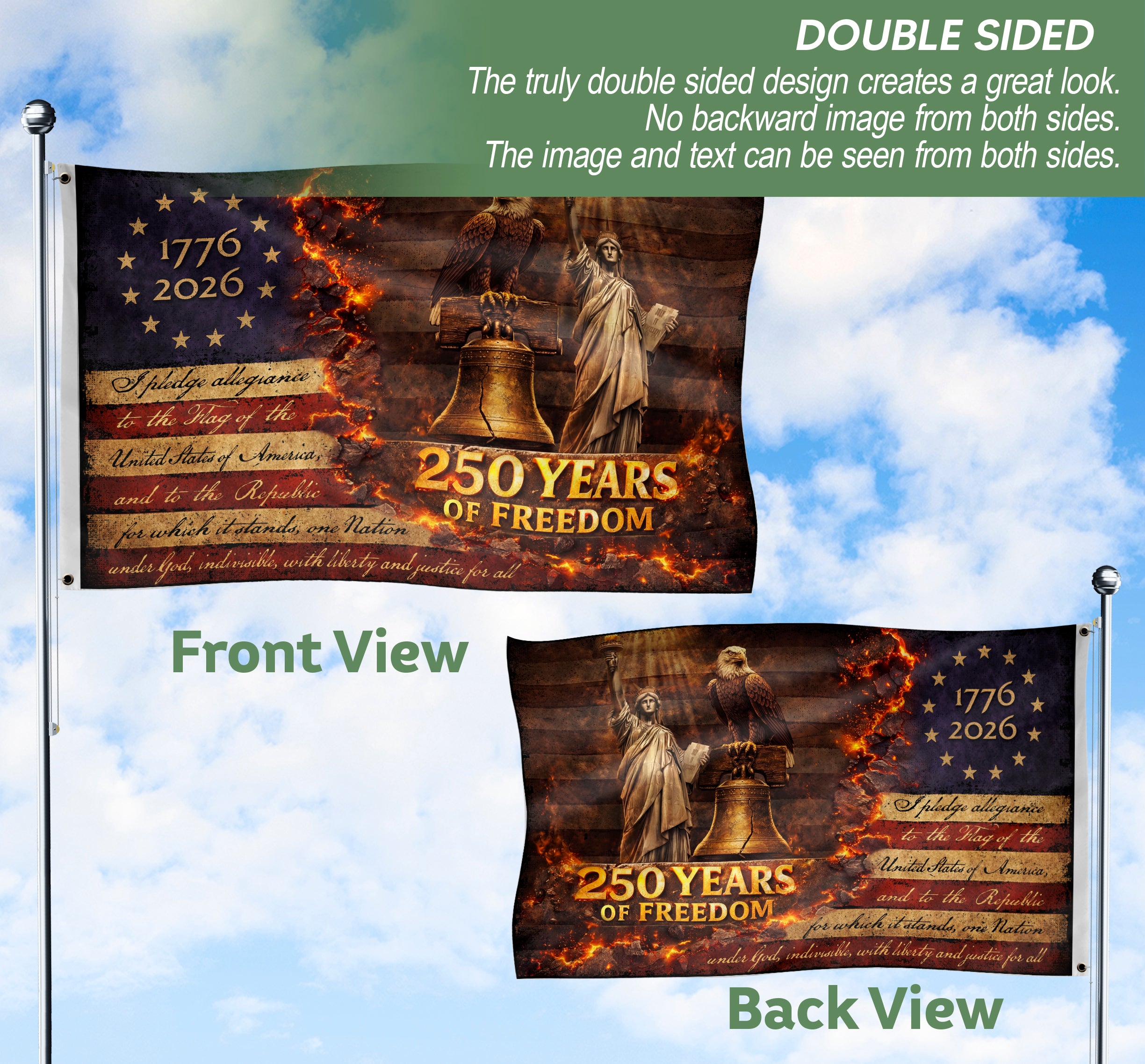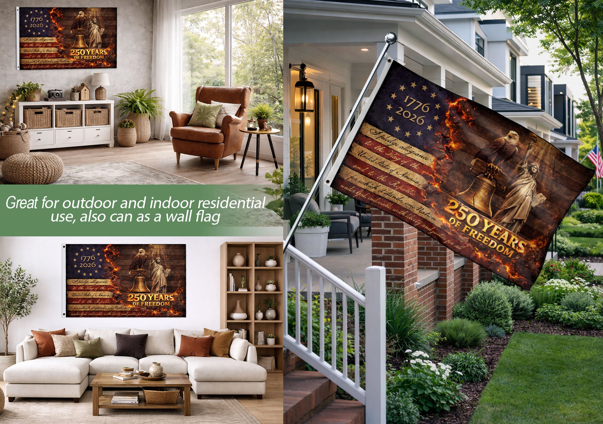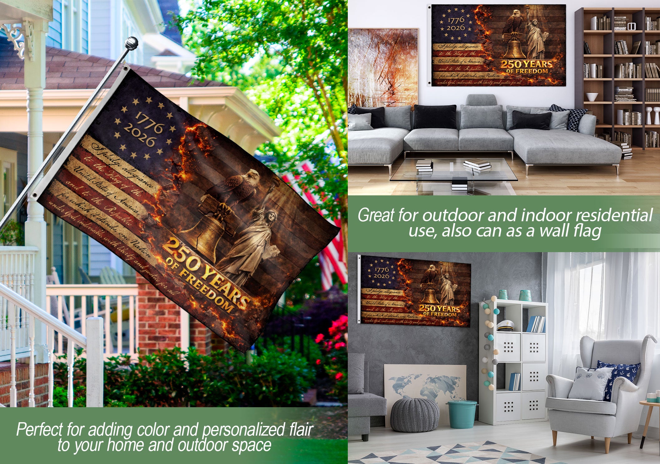 Celebrate America’s 250 years of freedom with this striking patriotic house flag. Featuring a powerful eagle, iconic Liberty Bell, and majestic Statue of Liberty in a dramatic vintage design, this flag captures the essence of national pride and historical strength. Crafted for outdoor durability, it’s perfect for displaying on your home, porch, or yard during holidays, Independence Day, or any time you want to show your patriotic spirit. The bold imagery and high-quality construction ensure it withstands weather while making a bold statement about liberty and heritage.