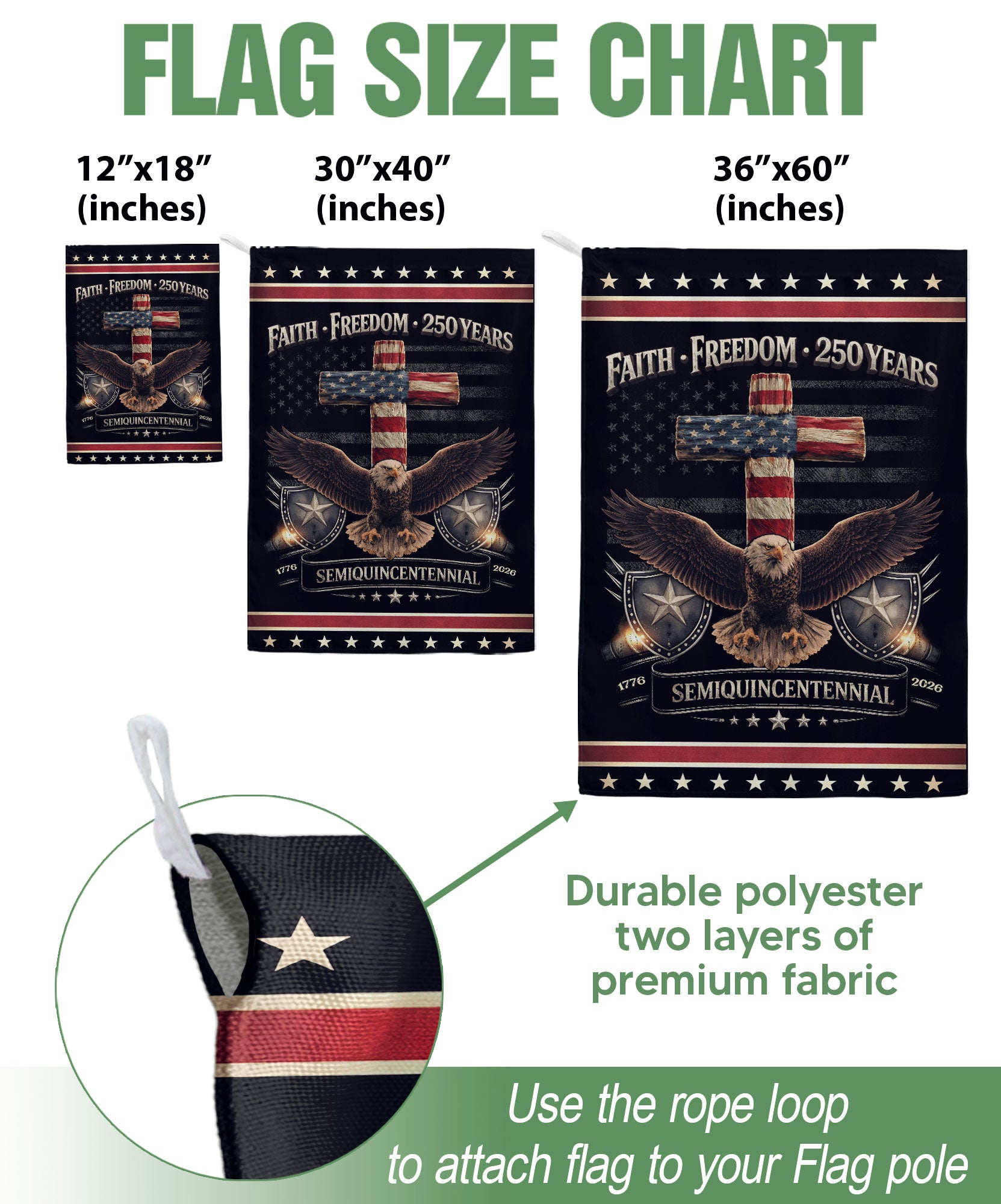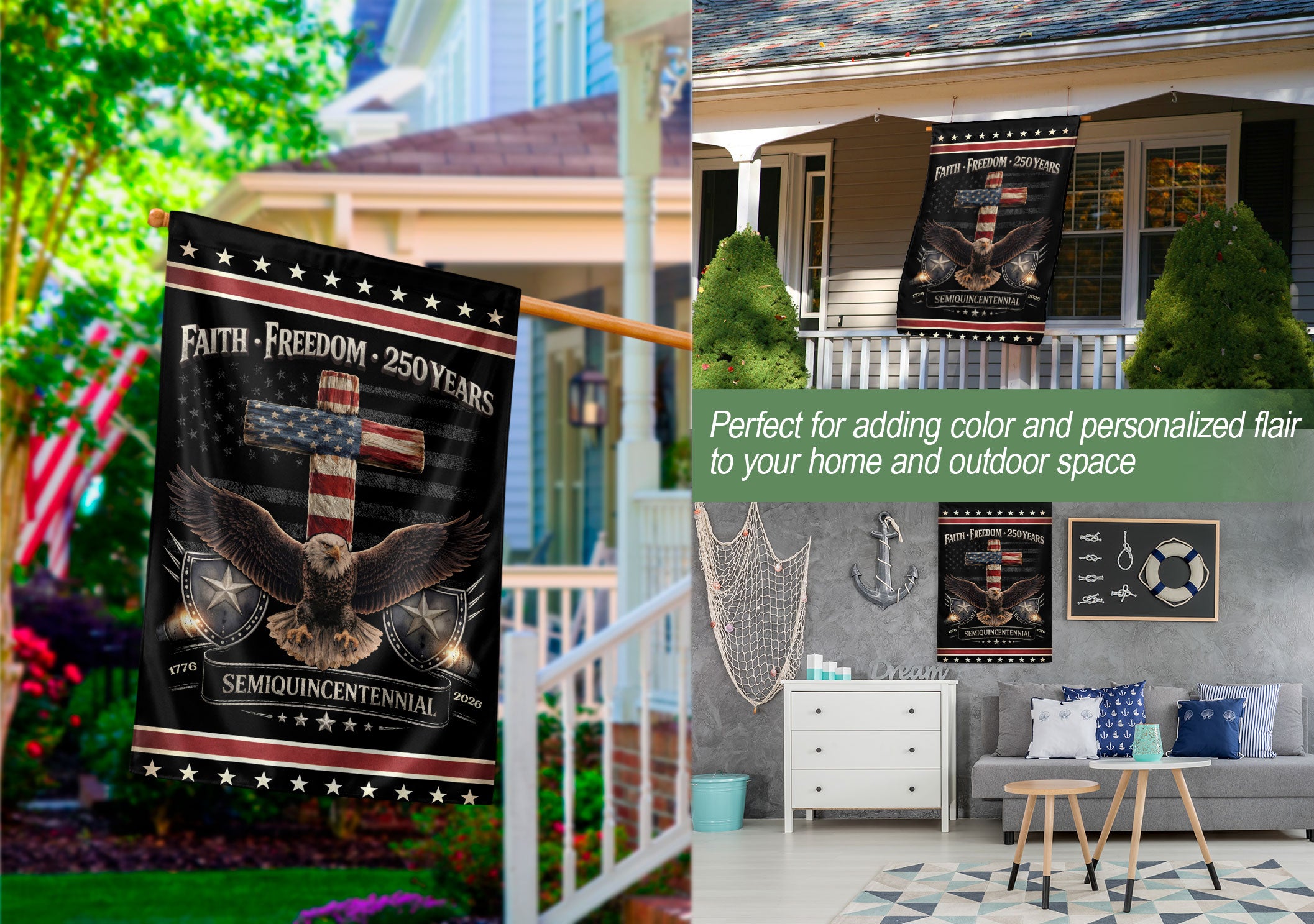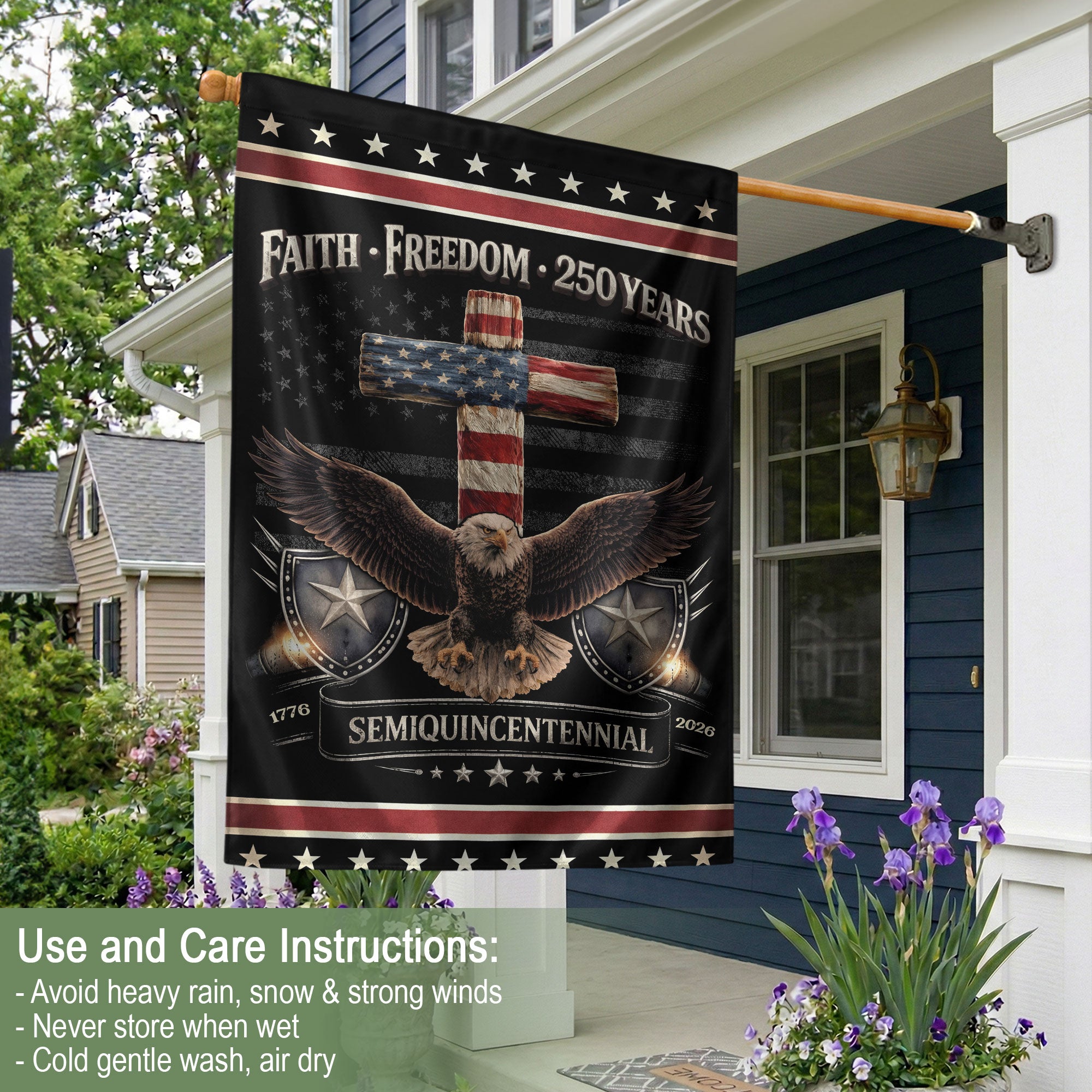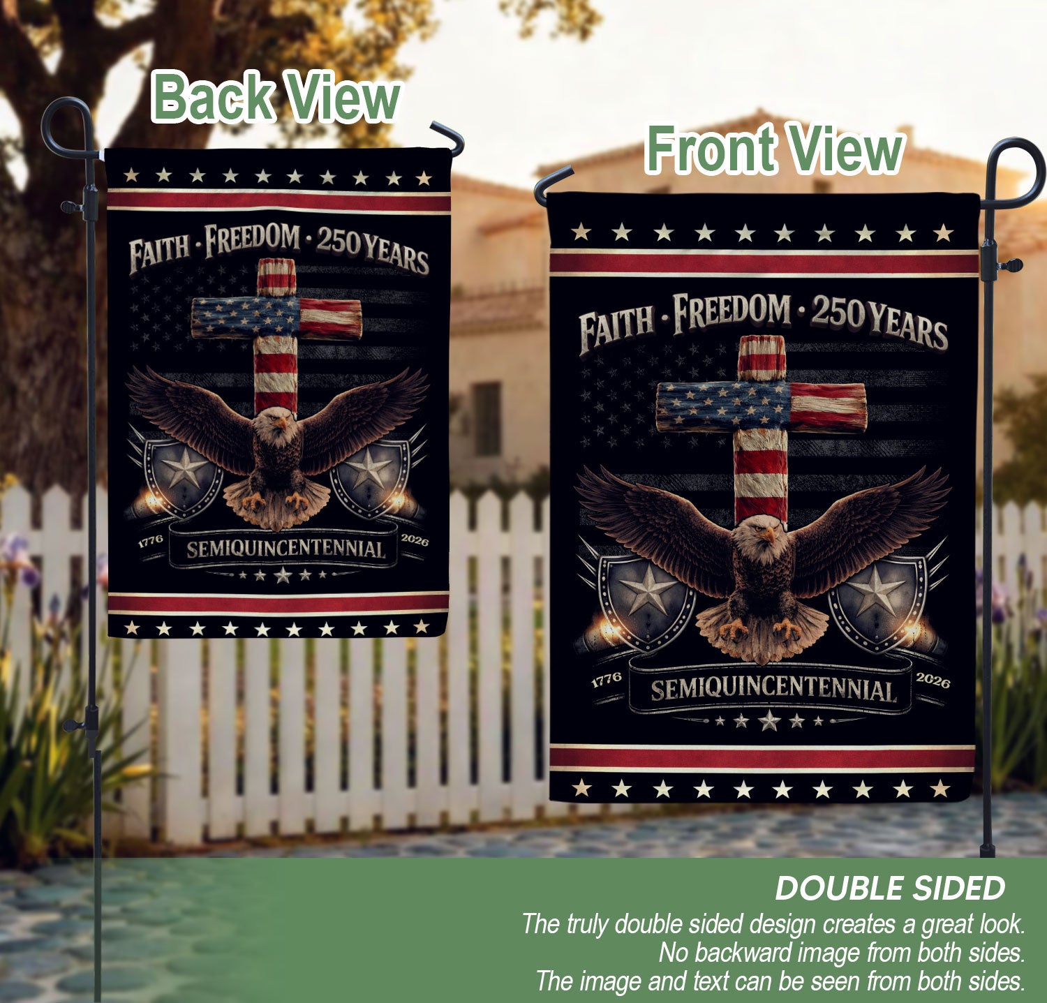 Celebrate the 250th anniversary of the United States with this patriotic double-sided garden flag featuring the bold message ‘One Nation Under God.’ The striking design showcases a powerful eagle and cross symbolizing courage, faith, freedom, and the enduring promise of liberty. Perfect for yard decor, garden stakes, porches, or patios, this durable flag stands proudly to honor American heritage and ‘We The People’ spirit. Ideal for Independence Day, Memorial Day, Fourth of July, or everyday display of faith and patriotism. Easy to install on standard garden flag poles (not included). Weather-resistant fabric ensures long-lasting vibrancy outdoors.
