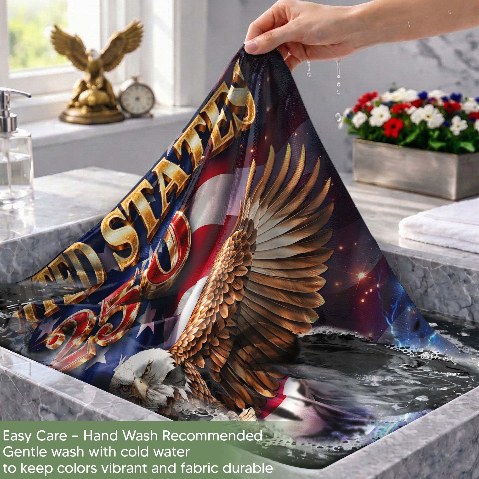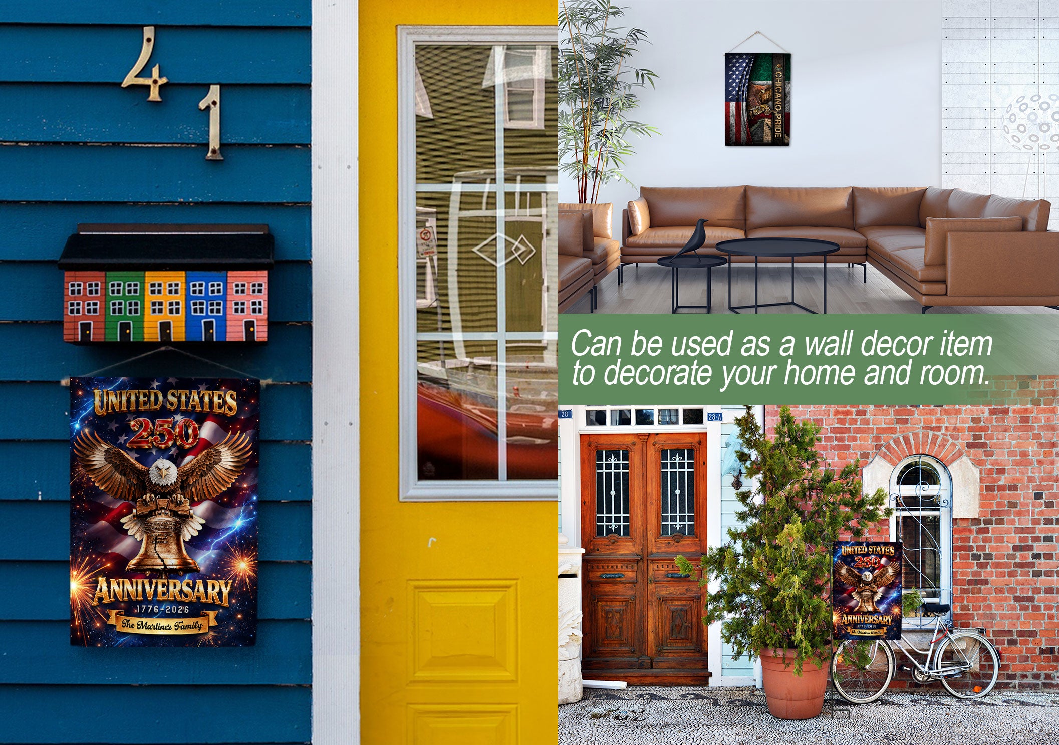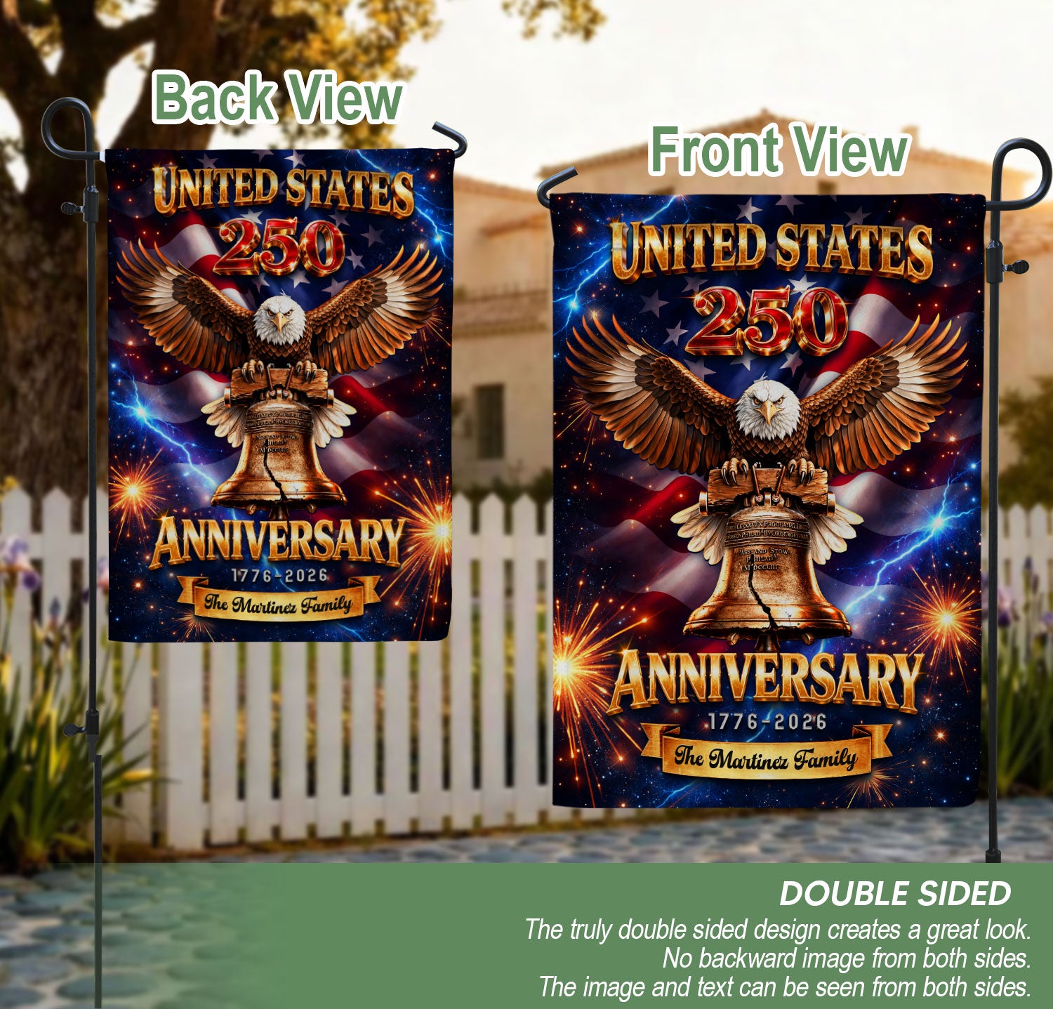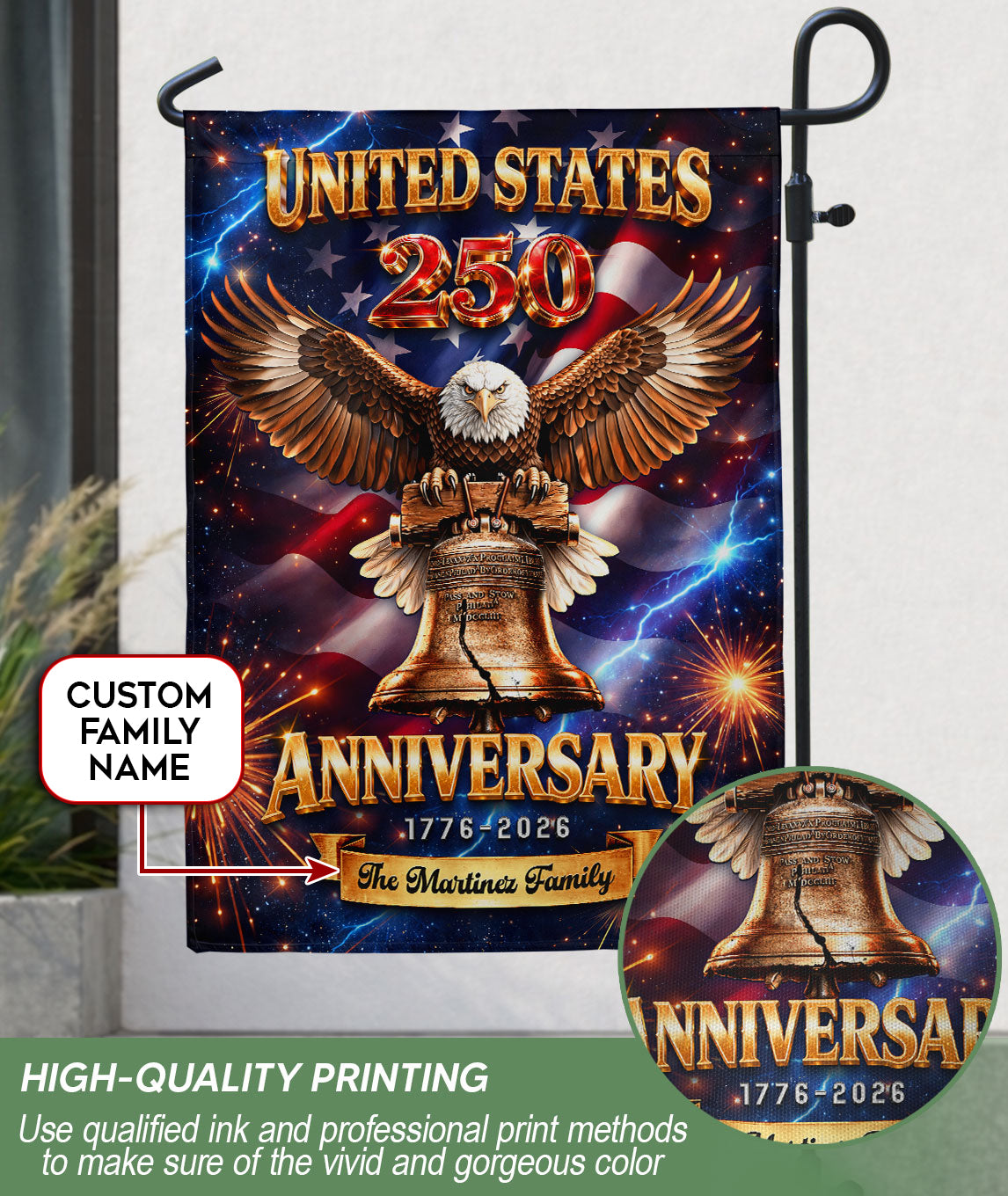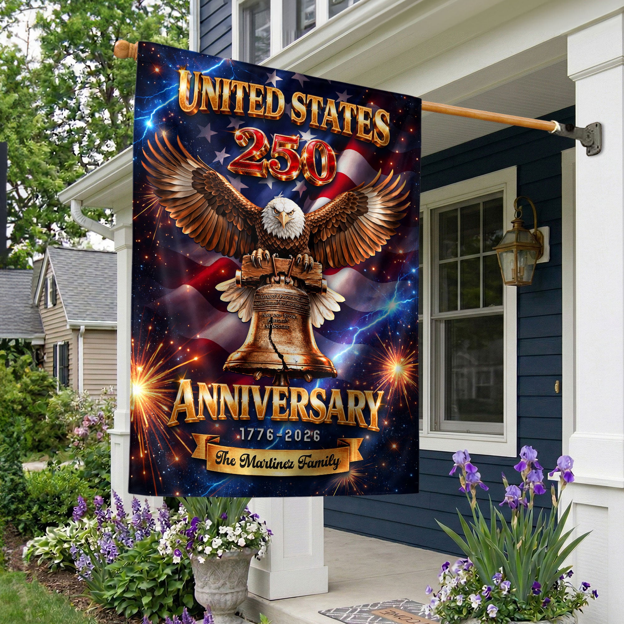 Celebrate America’s 250th anniversary from 1776 to 2026 with this personalized garden flag. Customize it with your family name for a unique patriotic display. The design features a majestic eagle, the iconic Liberty Bell, and vibrant fireworks symbolizing freedom and national pride. Made from durable, weather-resistant fabric, this double-sided garden flag measures standard size for easy setup in your yard, garden, or porch. Perfect for Independence Day celebrations, historical commemorations, or as a thoughtful gift for family and friends. Show your American spirit with this high-quality, custom-printed flag that withstands outdoor conditions year-round.