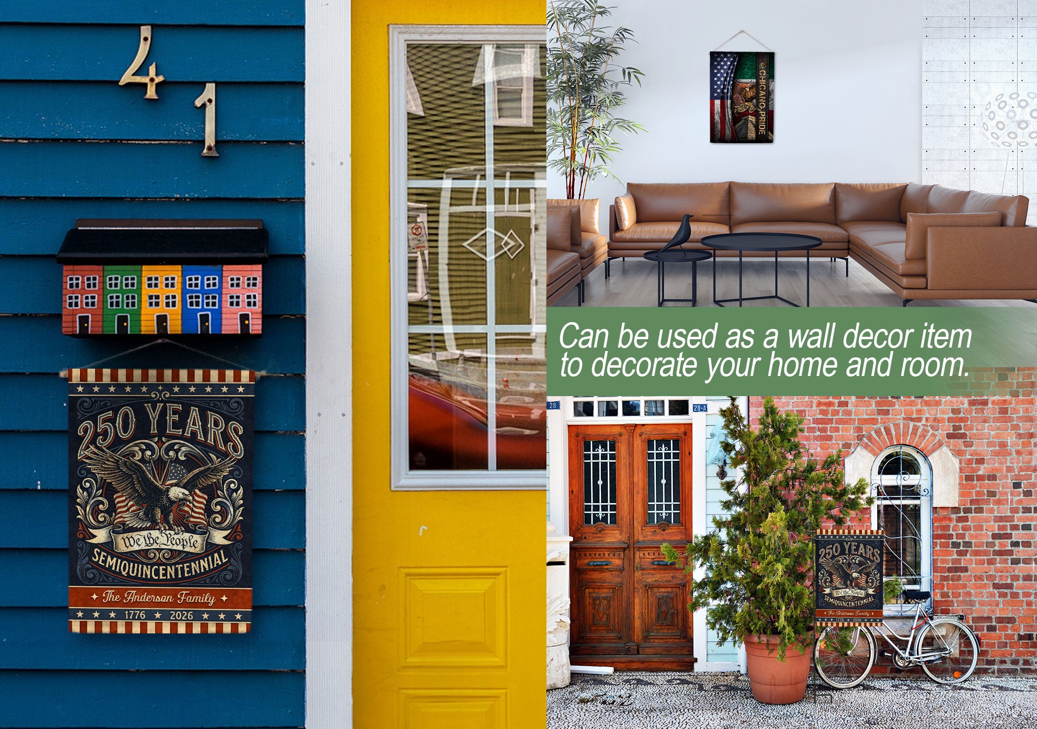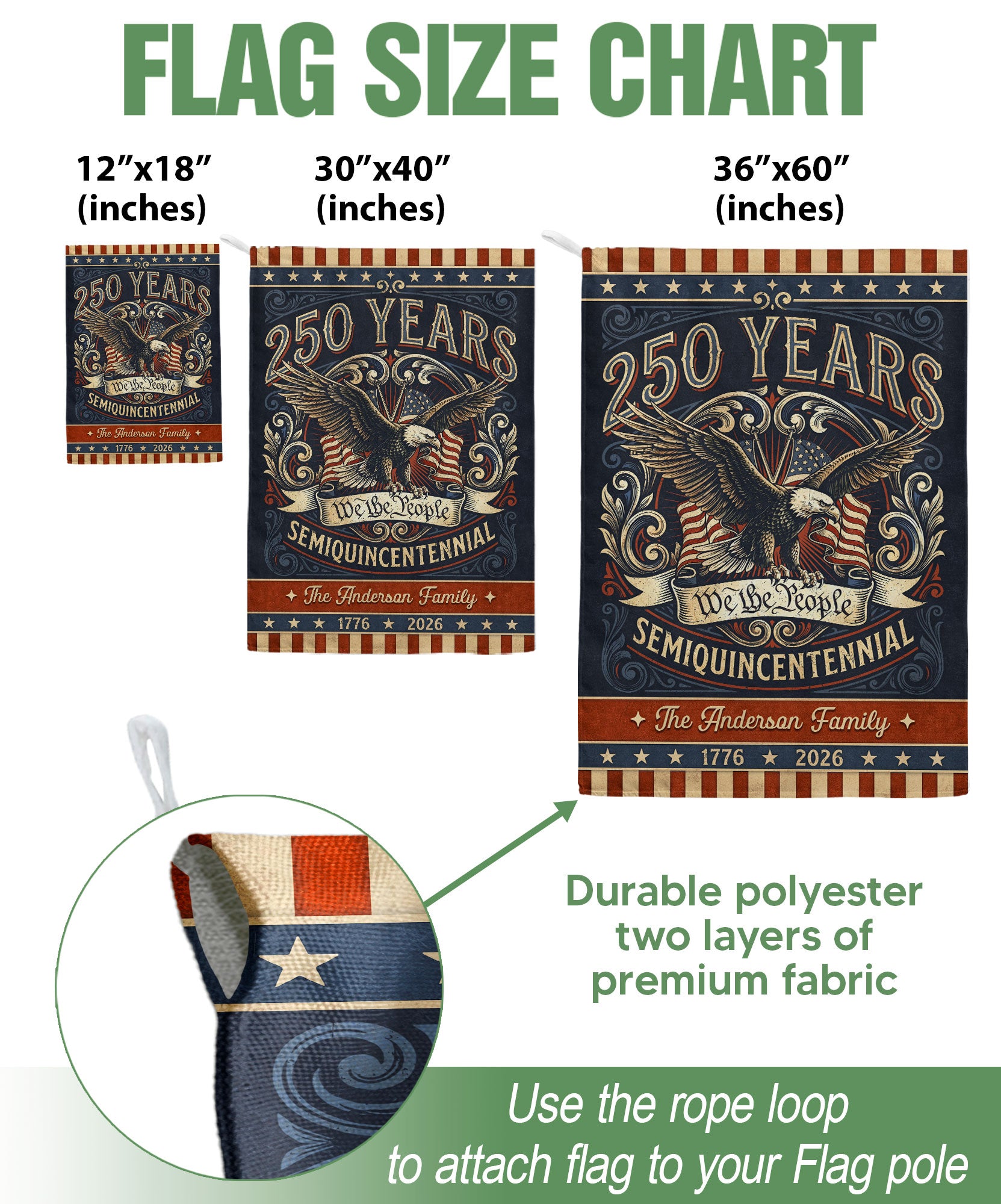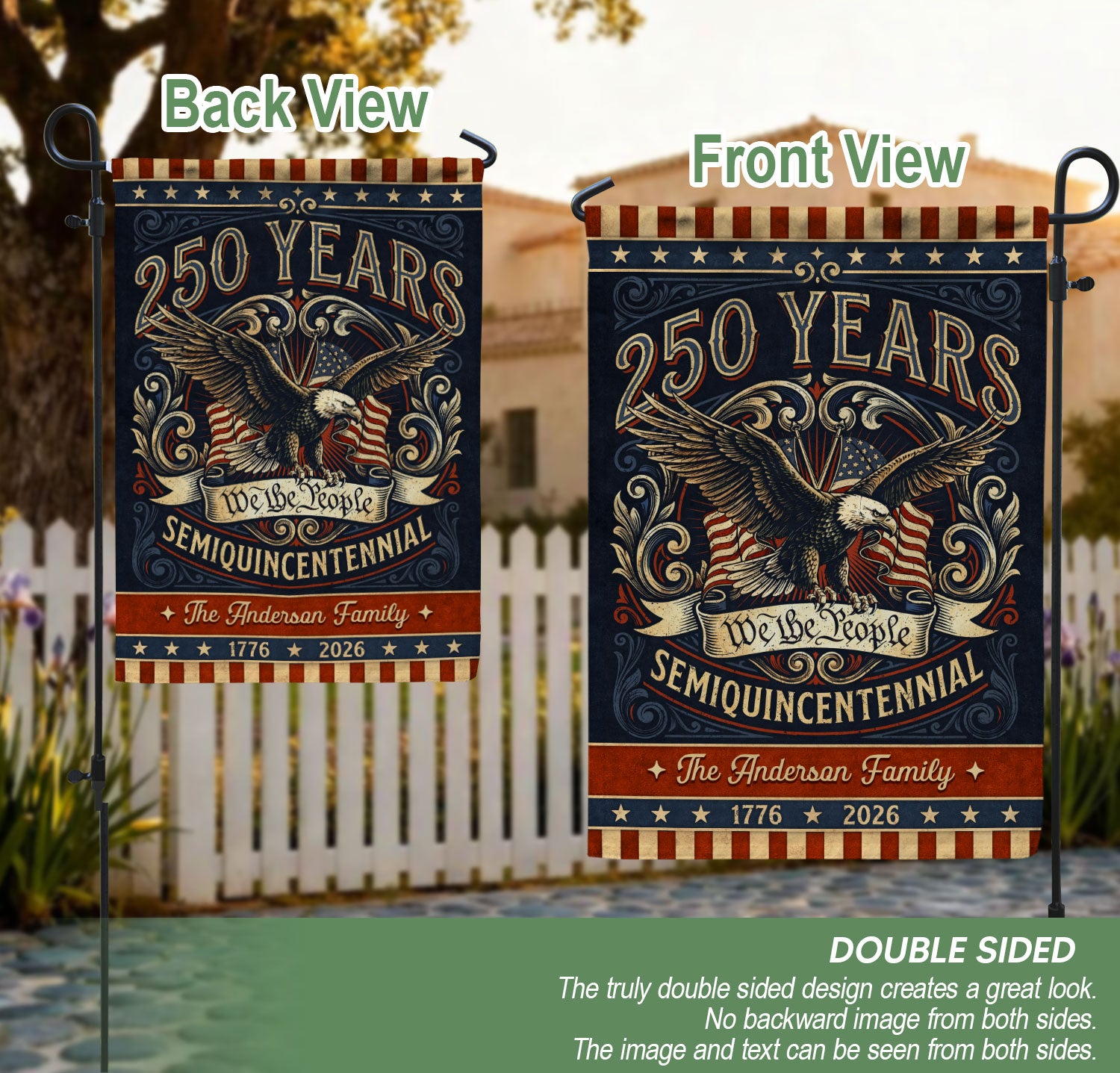 Celebrate America’s 250th anniversary with this personalized garden flag featuring a bold eagle, ‘We the People’ scroll, and vintage American flag accents. Customizable with your family name, it honors the journey from 1776 to 2026 and the spirit of liberty. Perfect for gardens, porches, or patios to display patriotism. Durable weather-resistant fabric ensures long-lasting vibrancy. Ideal for historic milestone commemorations, family gatherings, Independence Day, or as a thoughtful personalized gift for patriots. Easy to install with a standard garden flag pole (not included). Show your pride in the USA’s enduring legacy.