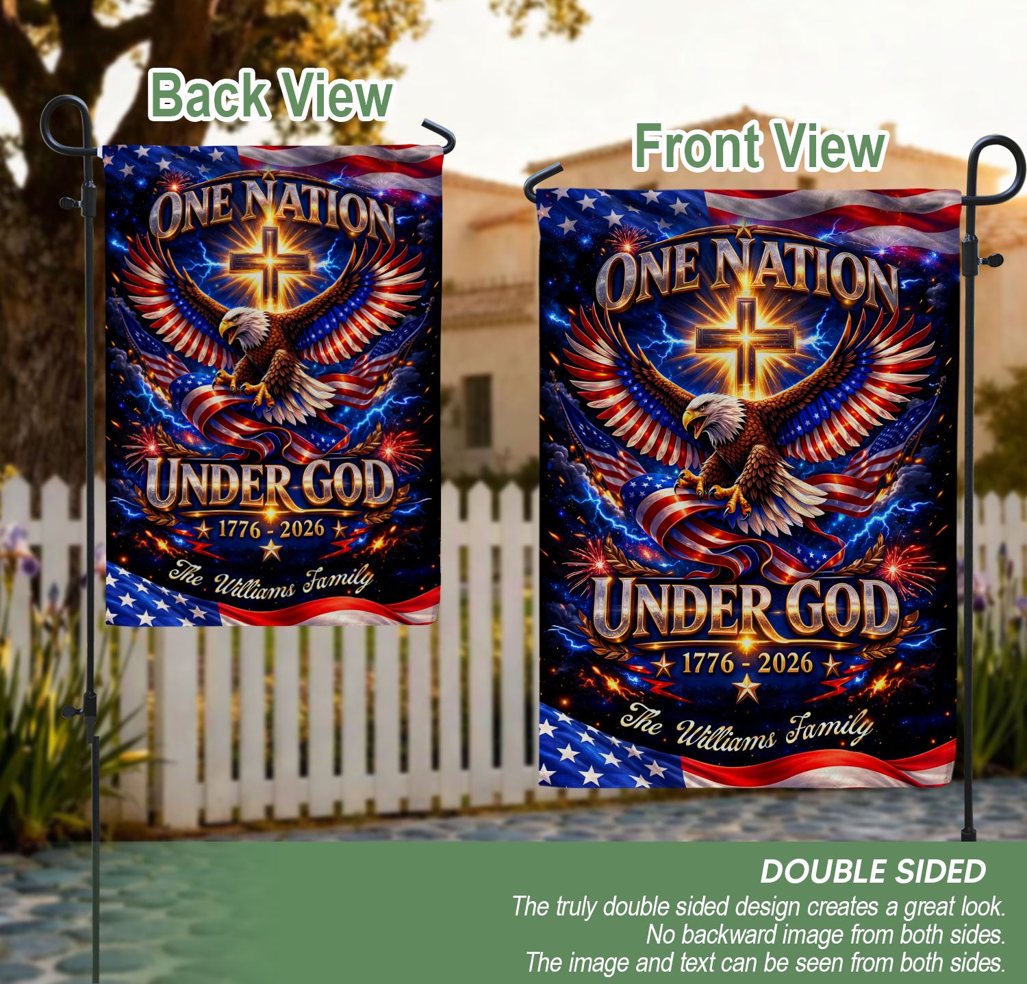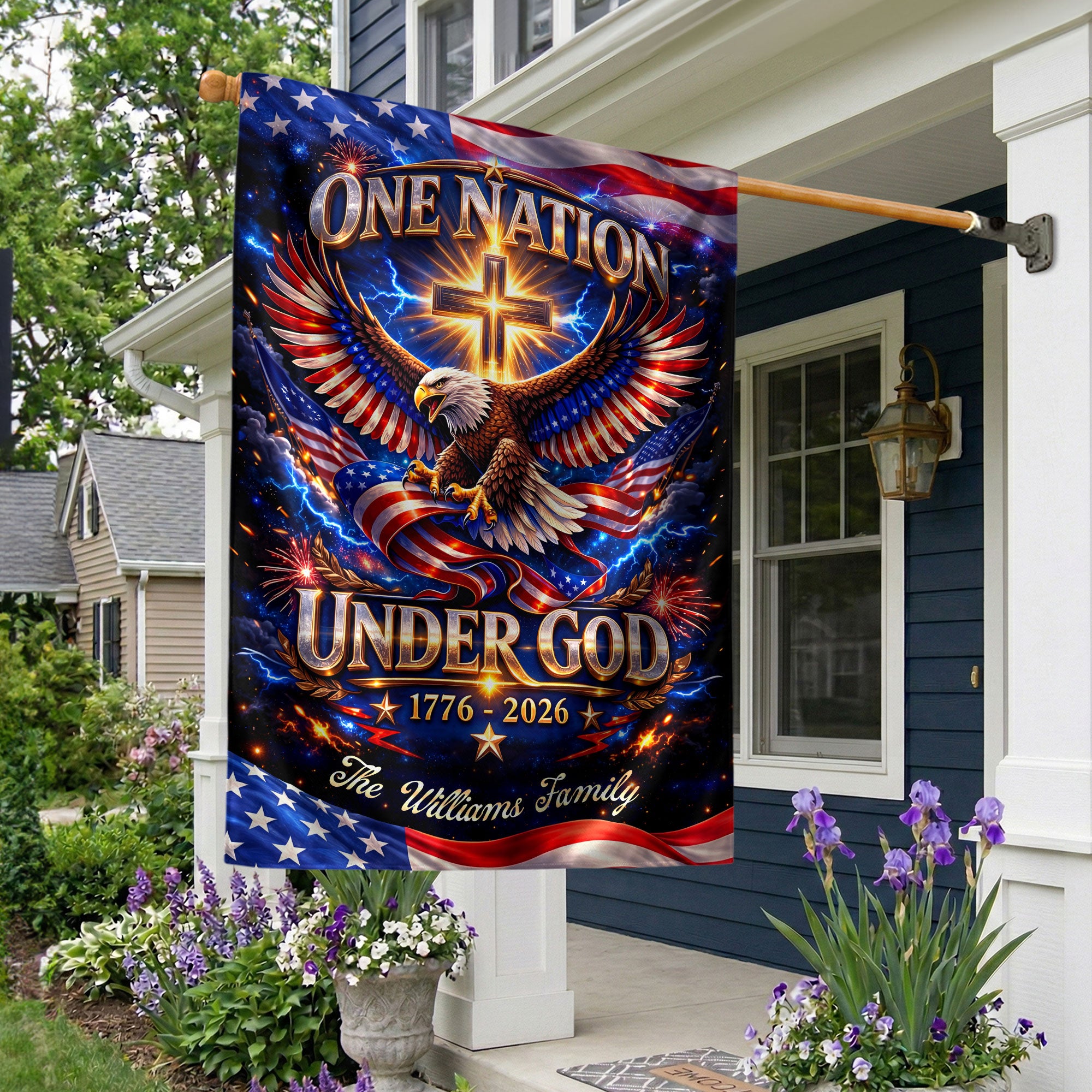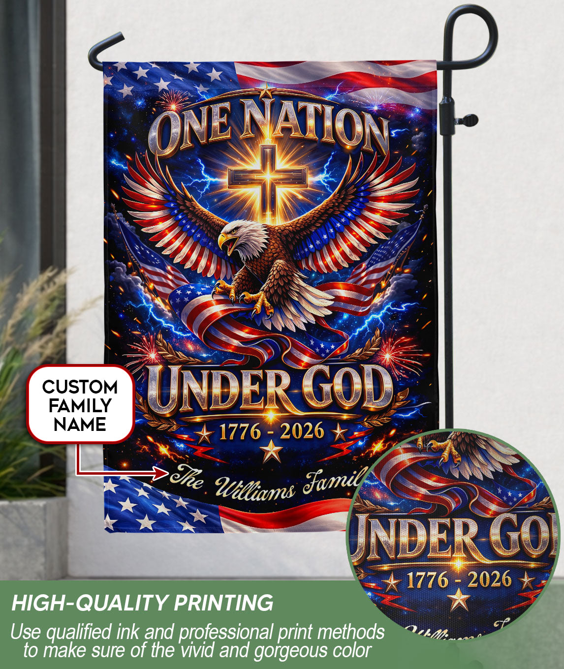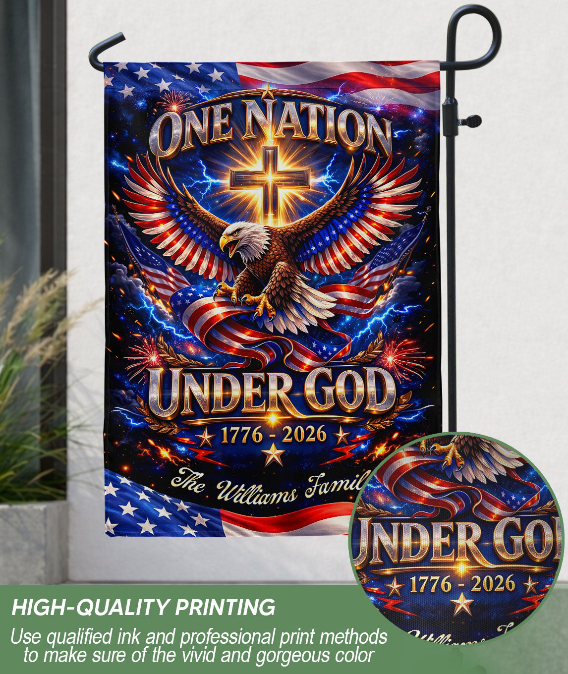 Celebrate America’s 250-year milestone from 1776 to 2026 with this personalized Faith & Freedom garden flag. Customize it with your family name for a unique tribute to the nation’s history and values. The striking design features a majestic eagle soaring above a prominent cross, accompanied by the inspiring text ‘One Nation Under God.’ Crafted from durable, weather-resistant fabric, this garden flag is perfect for displaying in your yard, garden, or patio to honor patriotism, faith, and freedom. Ideal as a commemorative piece for the semiquincentennial or a thoughtful personalized gift for family gatherings, holidays, or patriotic events. Easy to install with a standard garden flag pole (not included), it adds a proud, custom touch to your outdoor space year-round.