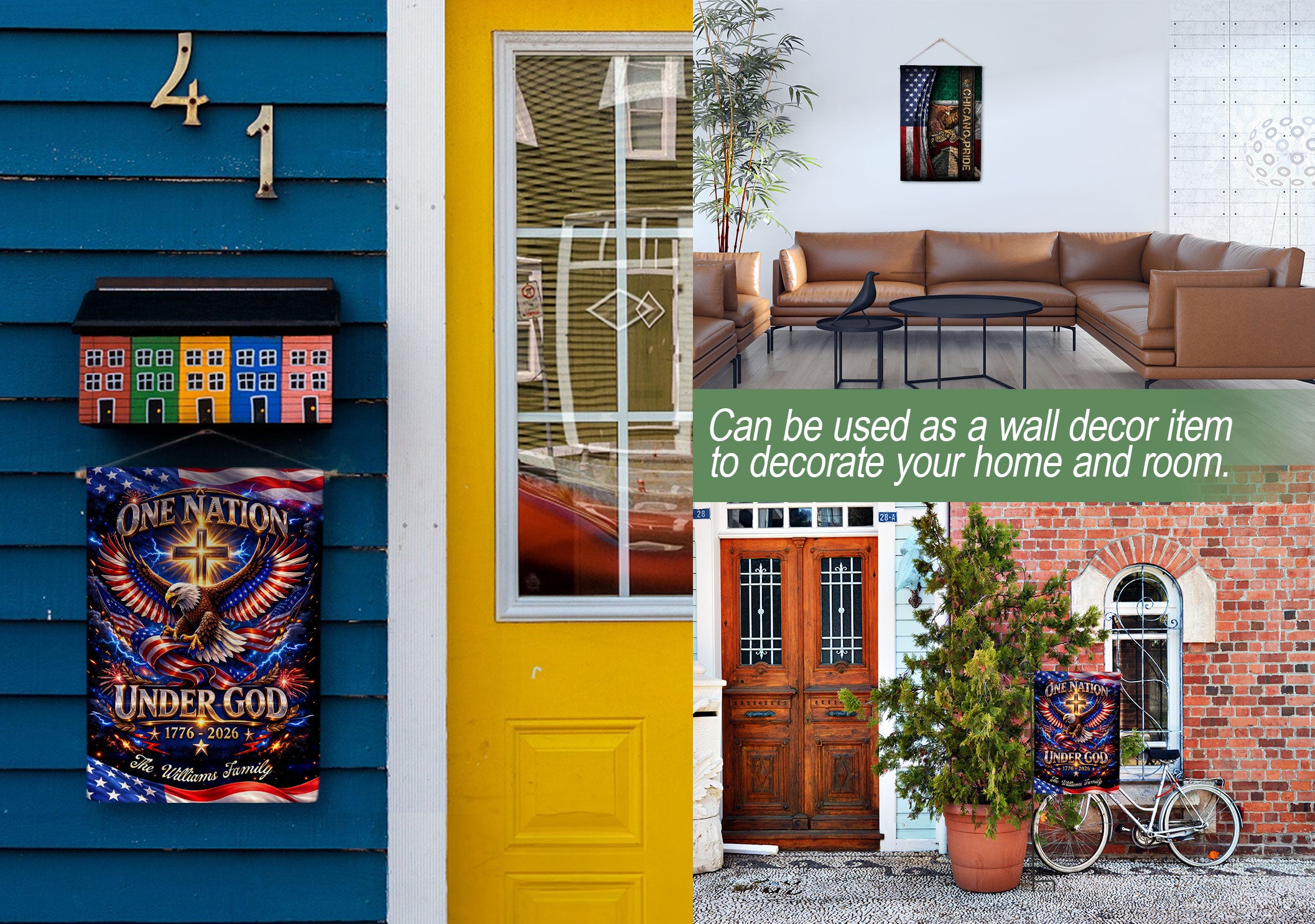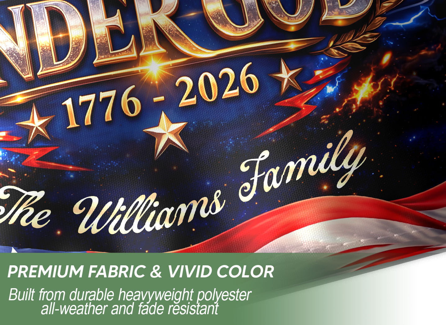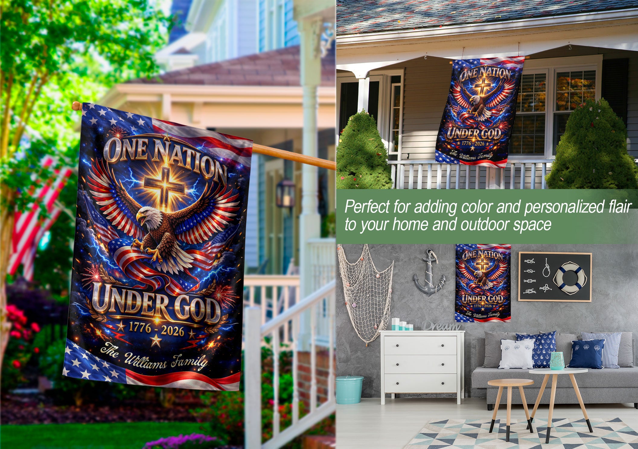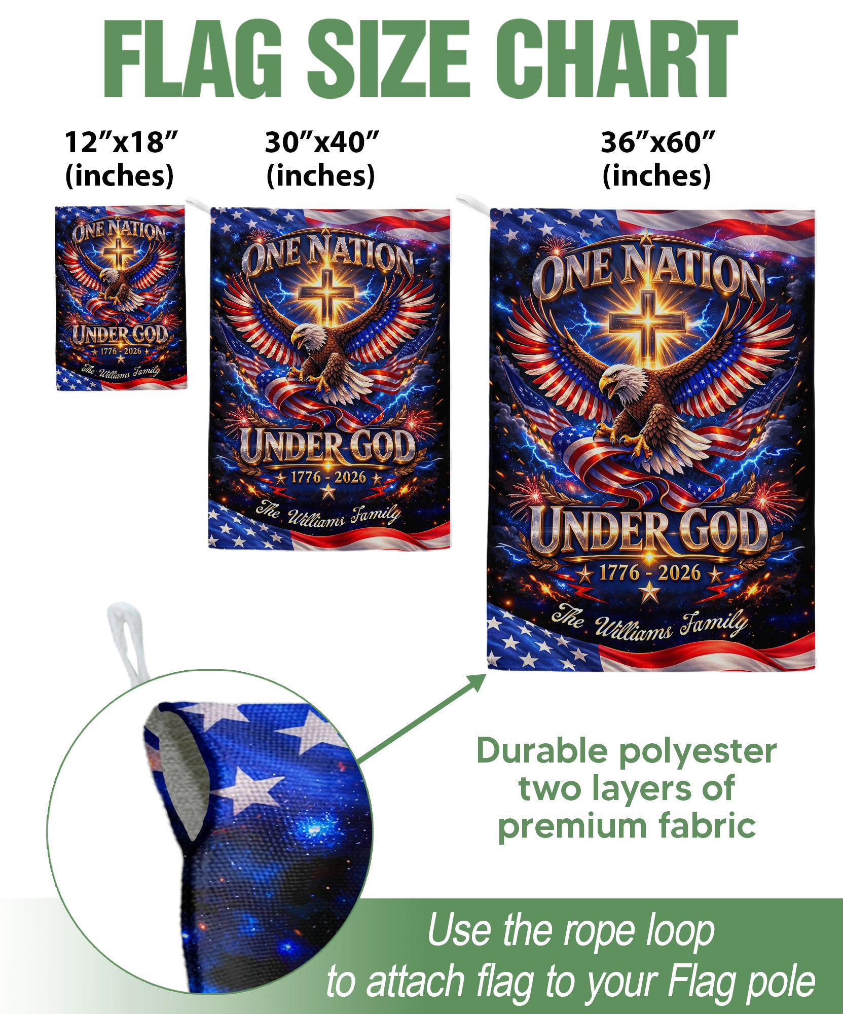 Celebrate America’s 250-year milestone from 1776 to 2026 with this personalized Faith & Freedom garden flag. Customize it with your family name for a unique tribute to the nation’s history and values. The striking design features a majestic eagle soaring above a prominent cross, accompanied by the inspiring text ‘One Nation Under God.’ Crafted from durable, weather-resistant fabric, this garden flag is perfect for displaying in your yard, garden, or patio to honor patriotism, faith, and freedom. Ideal as a commemorative piece for the semiquincentennial or a thoughtful personalized gift for family gatherings, holidays, or patriotic events. Easy to install with a standard garden flag pole (not included), it adds a proud, custom touch to your outdoor space year-round.