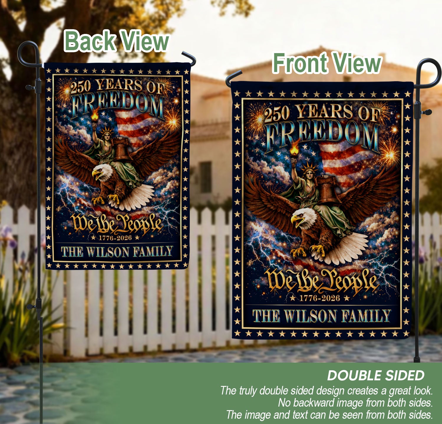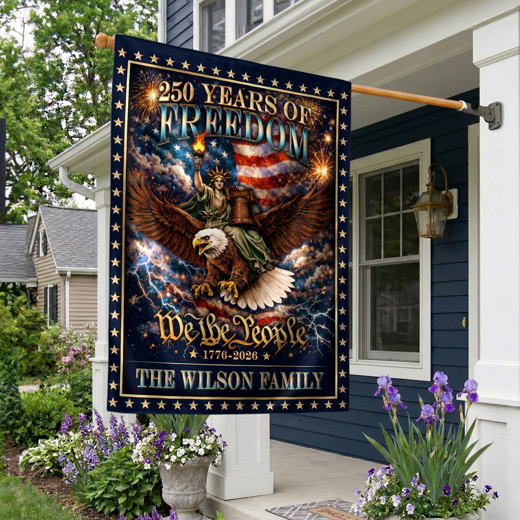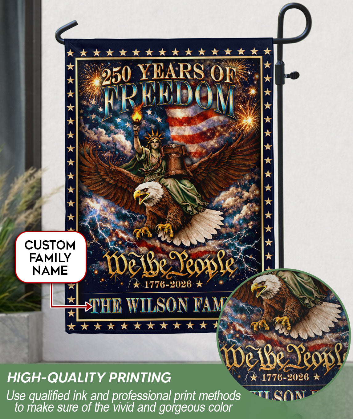 Celebrate 250 years of American heritage with this personalized patriotic garden flag. Customize it with your family name to honor the milestone from 1776 to 2026. The design features the iconic Statue of Liberty holding her torch, a majestic eagle, the historic Liberty Bell, and the timeless ‘We the People’ inscription. Crafted for outdoor display, this durable garden flag is perfect for lawns, gardens, porches, or patios. Show your patriotism during Independence Day, Memorial Day, Fourth of July celebrations, or year-round. Weather-resistant material ensures it stands up to the elements while proudly displaying your love for American history and freedom.