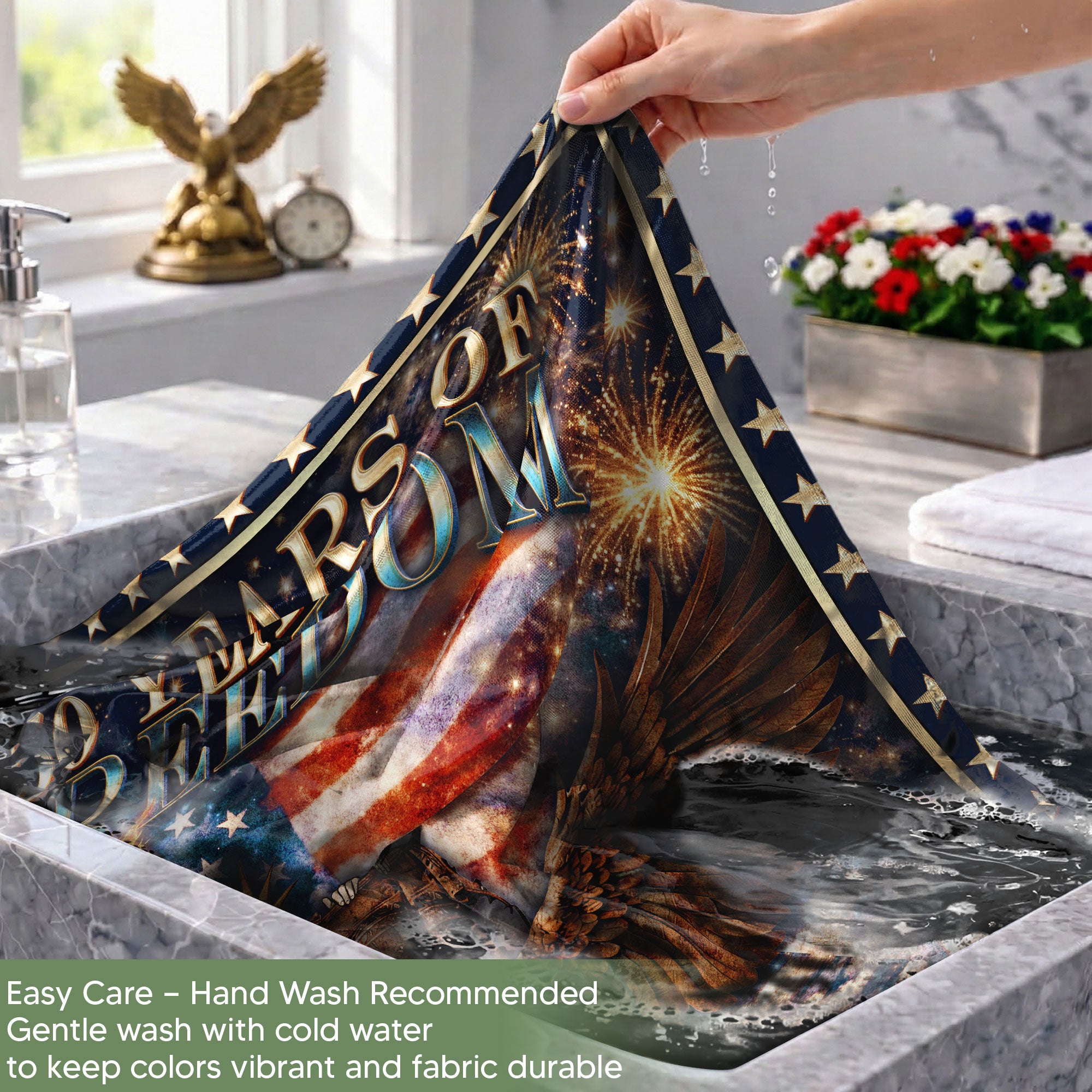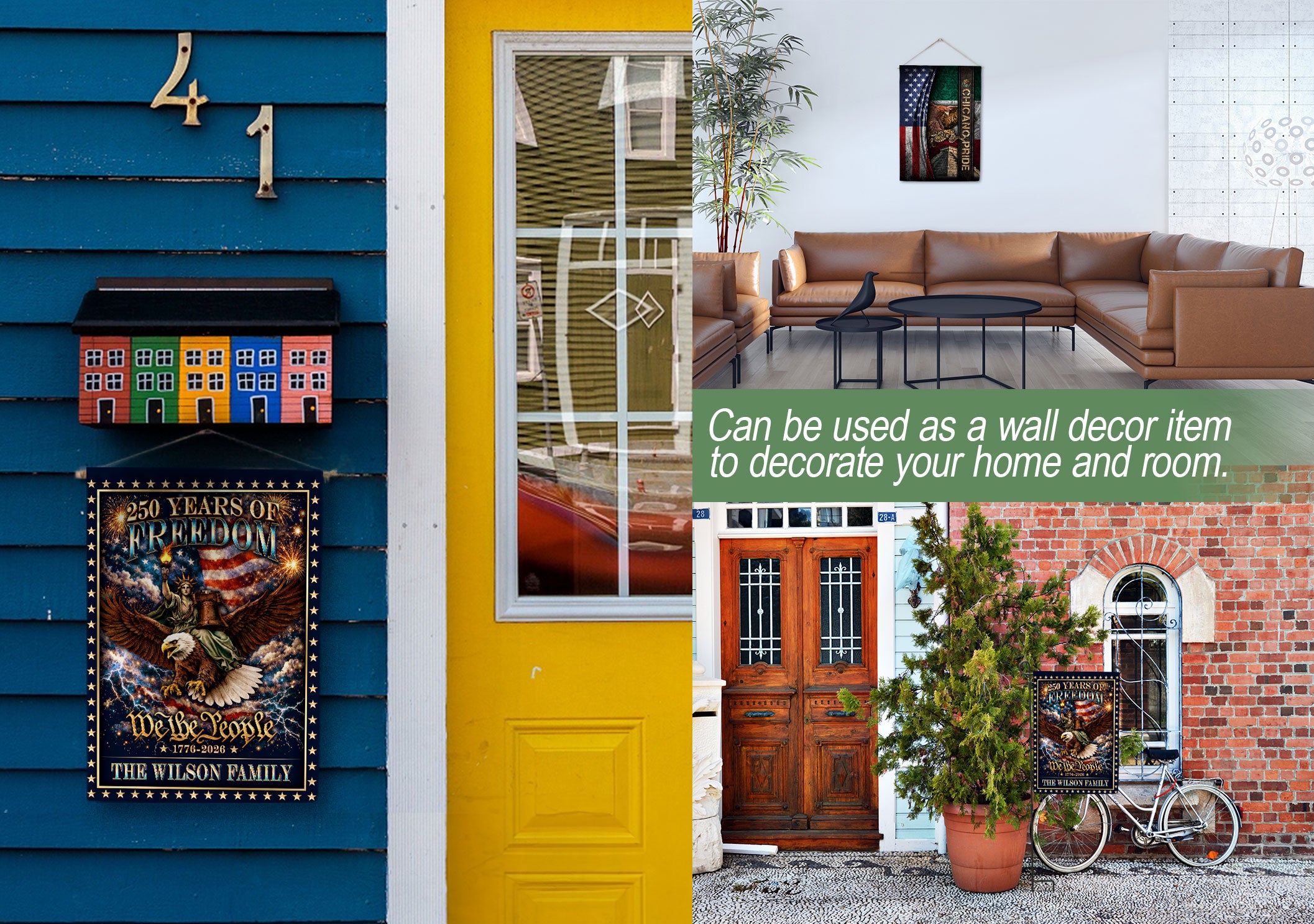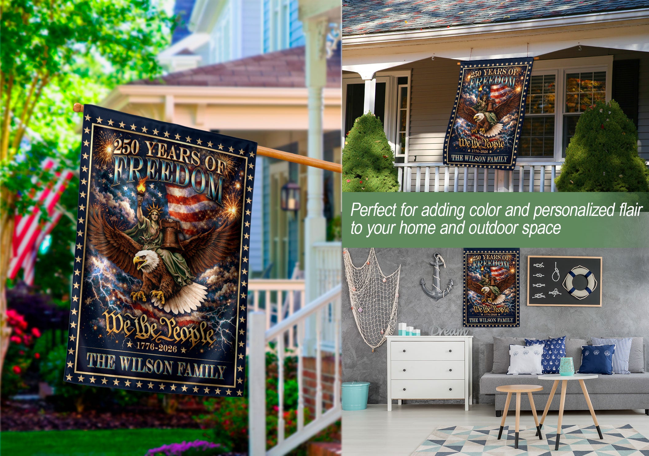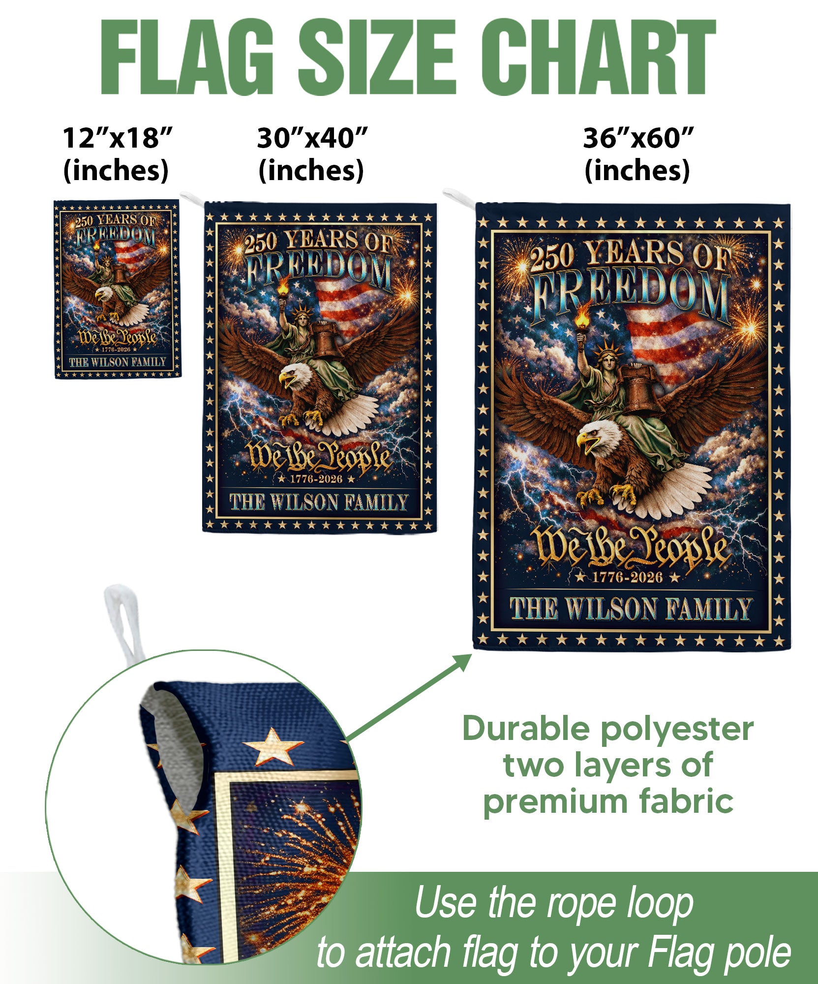 Celebrate 250 years of American heritage with this personalized patriotic garden flag. Customize it with your family name to honor the milestone from 1776 to 2026. The design features the iconic Statue of Liberty holding her torch, a majestic eagle, the historic Liberty Bell, and the timeless ‘We the People’ inscription. Crafted for outdoor display, this durable garden flag is perfect for lawns, gardens, porches, or patios. Show your patriotism during Independence Day, Memorial Day, Fourth of July celebrations, or year-round. Weather-resistant material ensures it stands up to the elements while proudly displaying your love for American history and freedom.