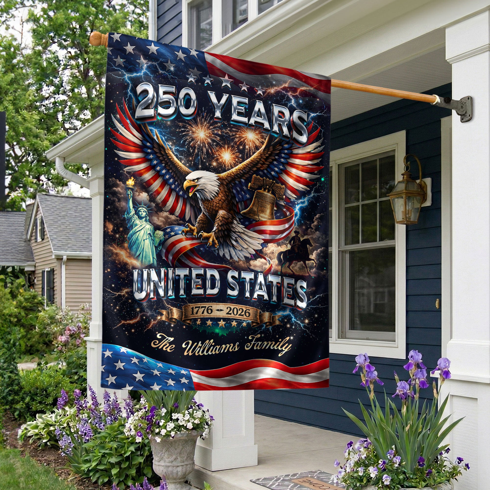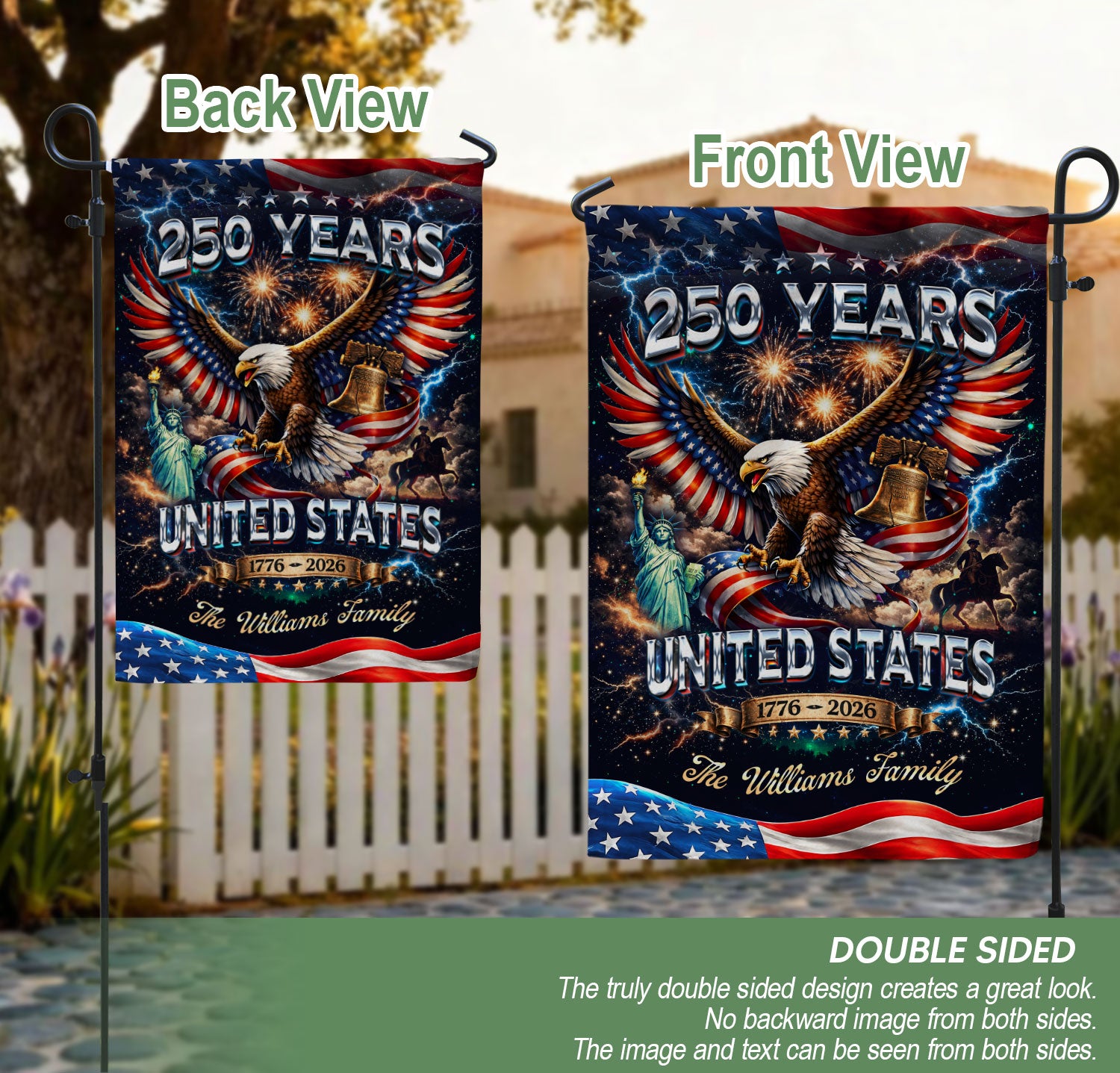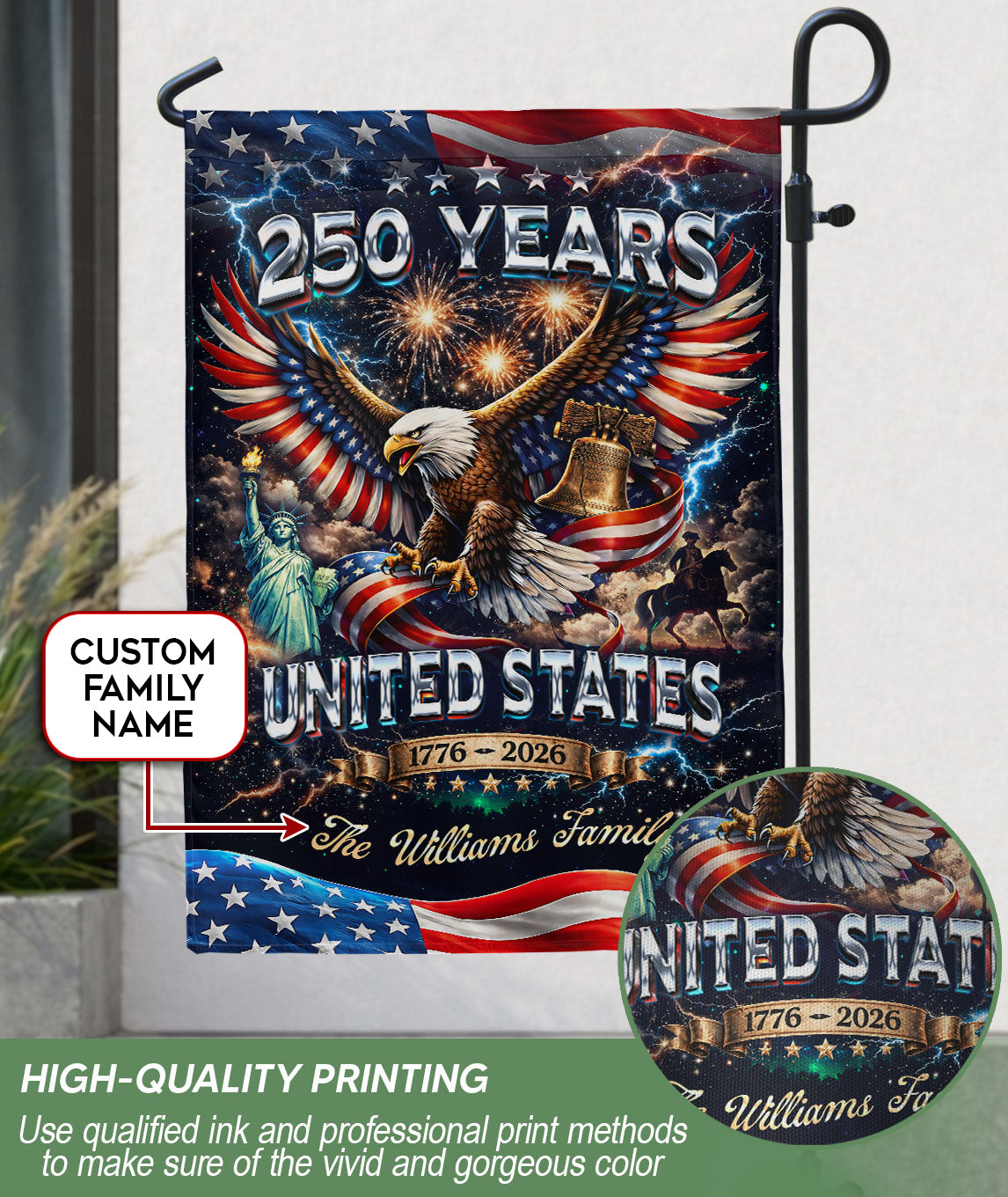 Celebrate America’s 250th anniversary from 1776 to 2026 with this personalized garden flag. Customize it with your family name for a unique patriotic display. The design features a majestic eagle, the iconic Liberty Bell, the Statue of Liberty, and vibrant fireworks against a starry background, capturing the spirit of freedom and history. Made from durable, weather-resistant polyester fabric, this double-sided garden flag measures approximately 12.5 x 18 inches, perfect for your front yard, porch, garden, or mailbox. Easy to install with a standard garden flag pole (sold separately). Ideal for Independence Day celebrations, Memorial Day, Fourth of July, or as a thoughtful gift for family and friends honoring this historic milestone. Show your American pride with this high-quality, custom-printed flag that withstands outdoor conditions year-round.