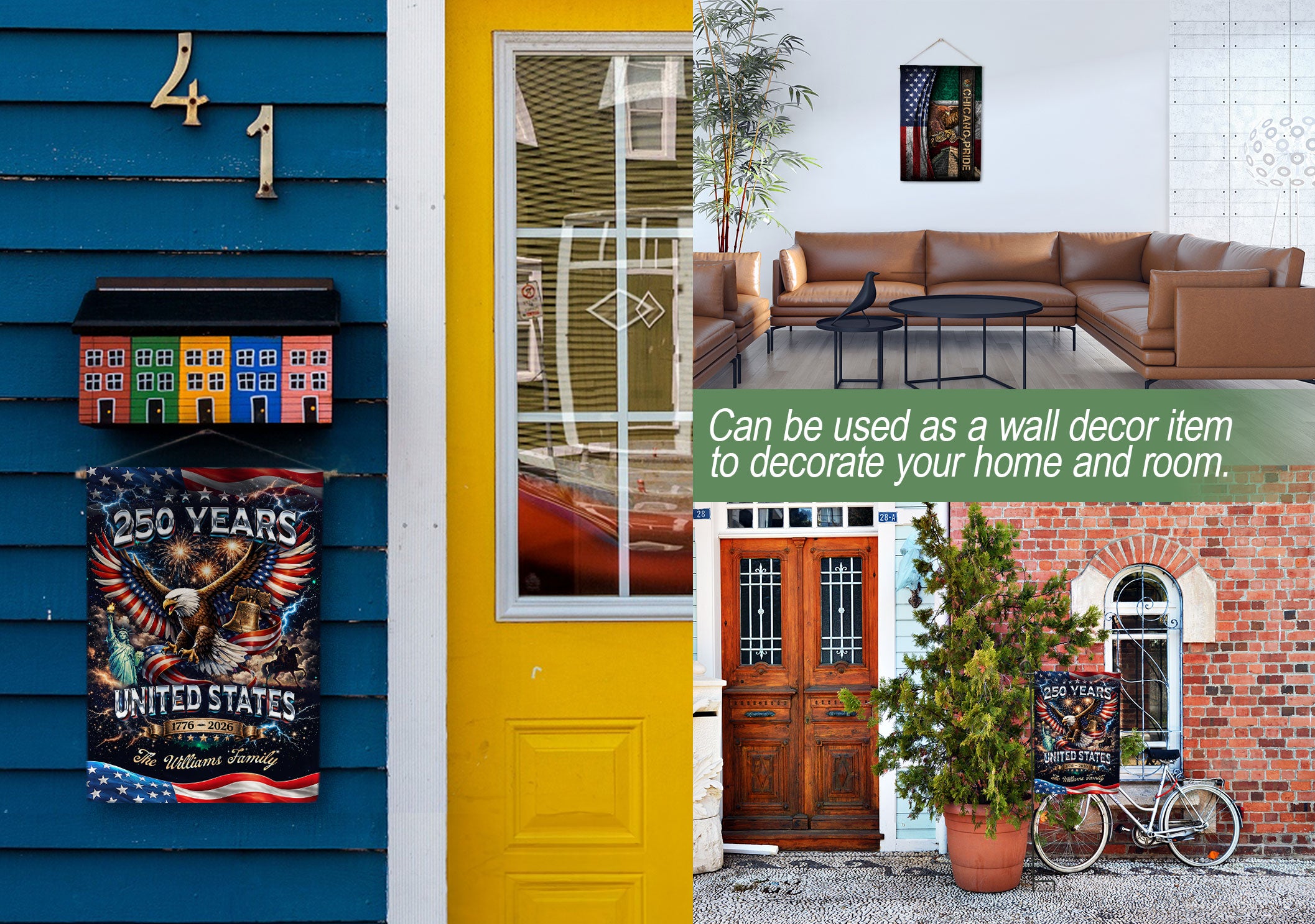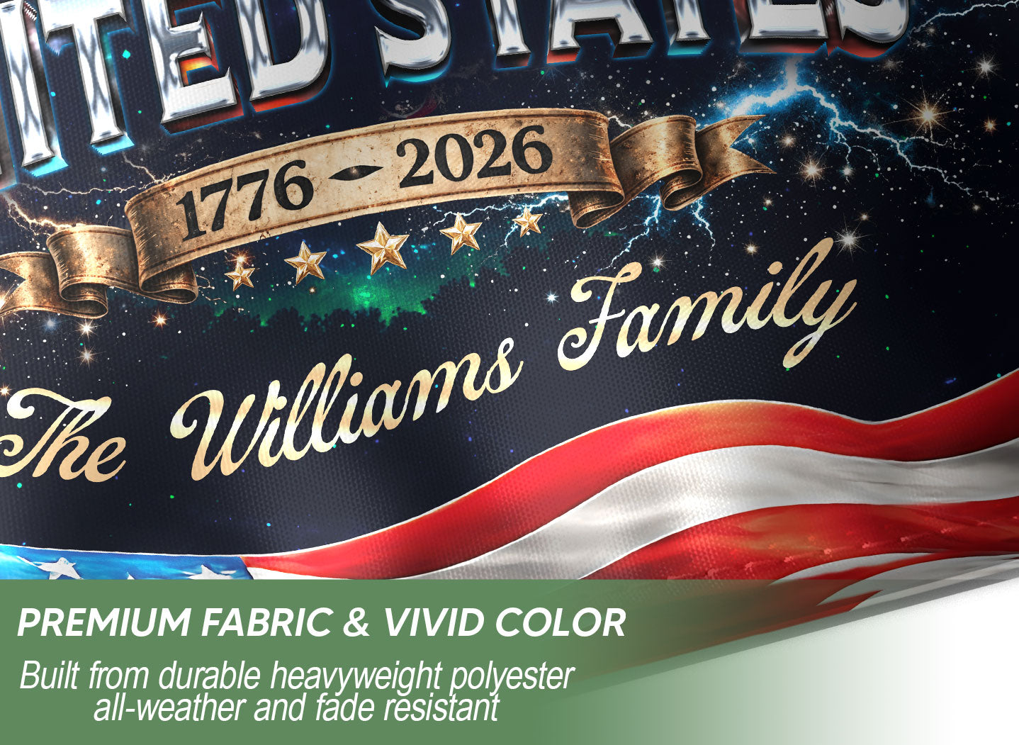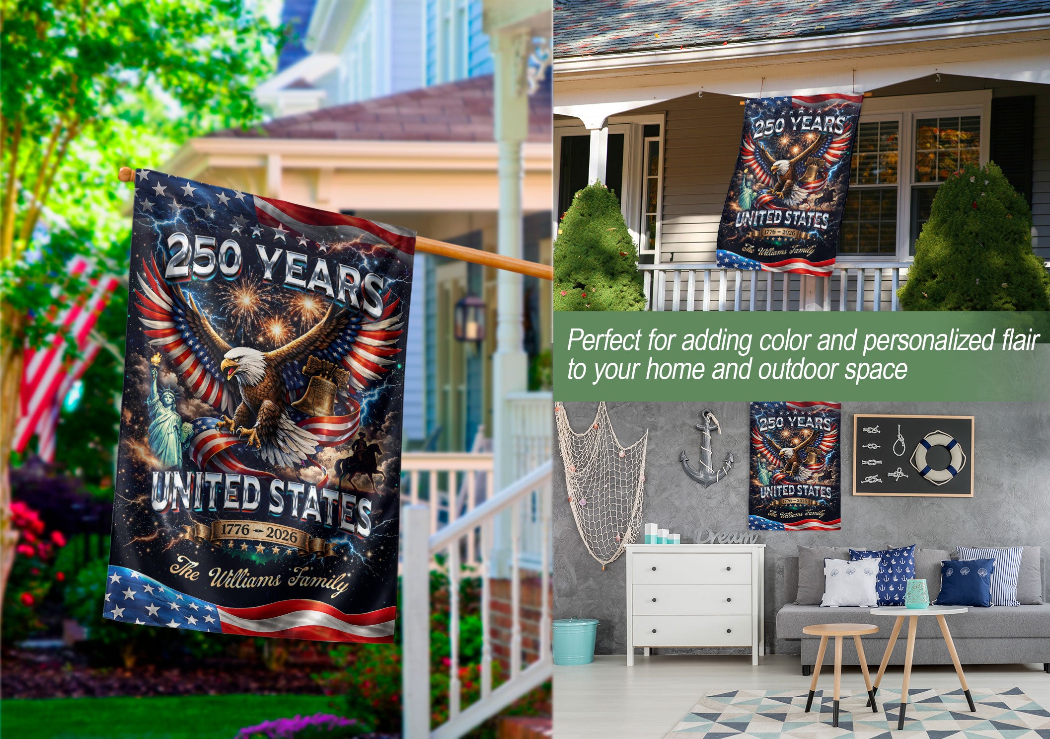 Celebrate America’s 250th anniversary from 1776 to 2026 with this personalized garden flag. Customize it with your family name for a unique patriotic display. The design features a majestic eagle, the iconic Liberty Bell, the Statue of Liberty, and vibrant fireworks against a starry background, capturing the spirit of freedom and history. Made from durable, weather-resistant polyester fabric, this double-sided garden flag measures approximately 12.5 x 18 inches, perfect for your front yard, porch, garden, or mailbox. Easy to install with a standard garden flag pole (sold separately). Ideal for Independence Day celebrations, Memorial Day, Fourth of July, or as a thoughtful gift for family and friends honoring this historic milestone. Show your American pride with this high-quality, custom-printed flag that withstands outdoor conditions year-round.