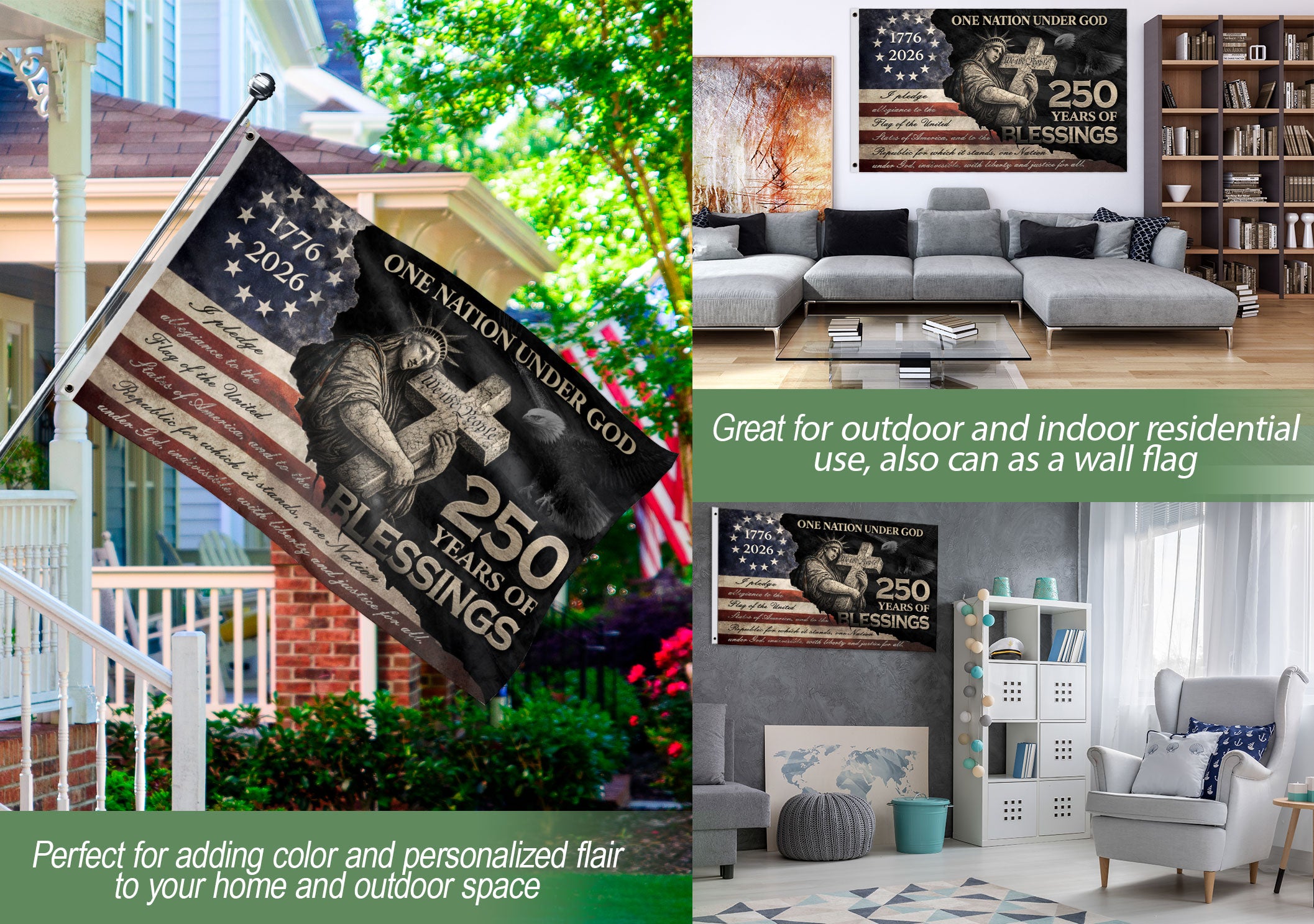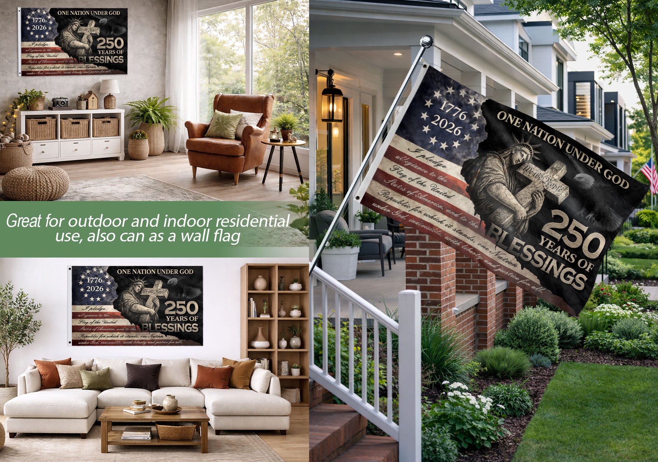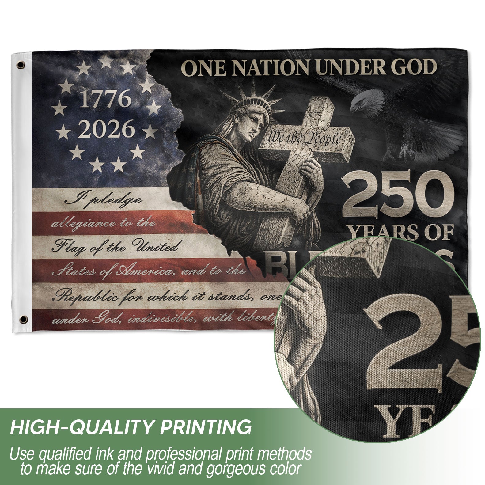 Celebrate 250 years of American blessings with this Pledge of Allegiance house flag, spanning 1776-2026. The profound design showcases the Statue of Liberty embracing a wooden cross inscribed with ‘We The People,’ alongside the full text of the Pledge of Allegiance. Perfect for displaying patriotic Christian values, faith, and freedom on your home. Crafted for outdoor use, this house flag honors the nation’s foundation with durable materials that withstand the elements. Ideal for Independence Day, Memorial Day, or everyday pride in American heritage.