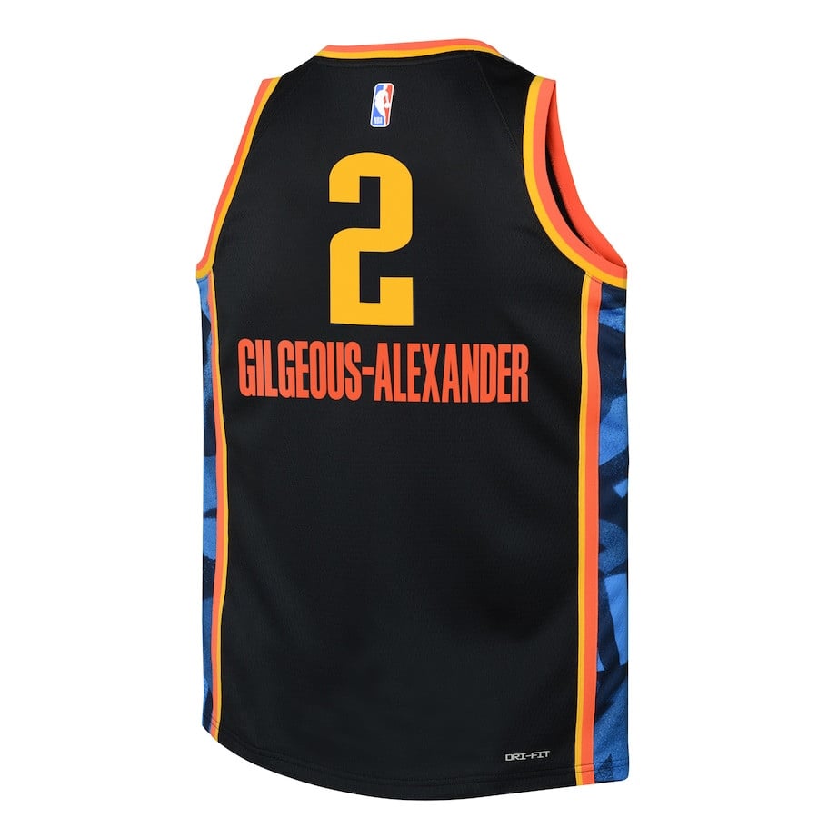 The Shai Gilgeous-Alexander 2 Oklahoma City Thunder 2024/25 Swingman Player Youth Jersey in City Edition Black is a lightweight, breathable sports jersey perfect for young fans. Crafted from 100% polyester, it offers superior comfort and durability for everyday wear, training sessions, or game-day outfits. The classic fit ensures easy layering and pairing with casual styles, while the breathable fabric keeps you cool and dry during activities. Featuring the iconic player name, number 2, and Oklahoma City Thunder City Edition design, this jersey captures team spirit without official affiliation. Available in youth sizes S to 3XL. Ideal for basketball enthusiasts seeking fan-inspired apparel that’s versatile for school, play, or lounging.