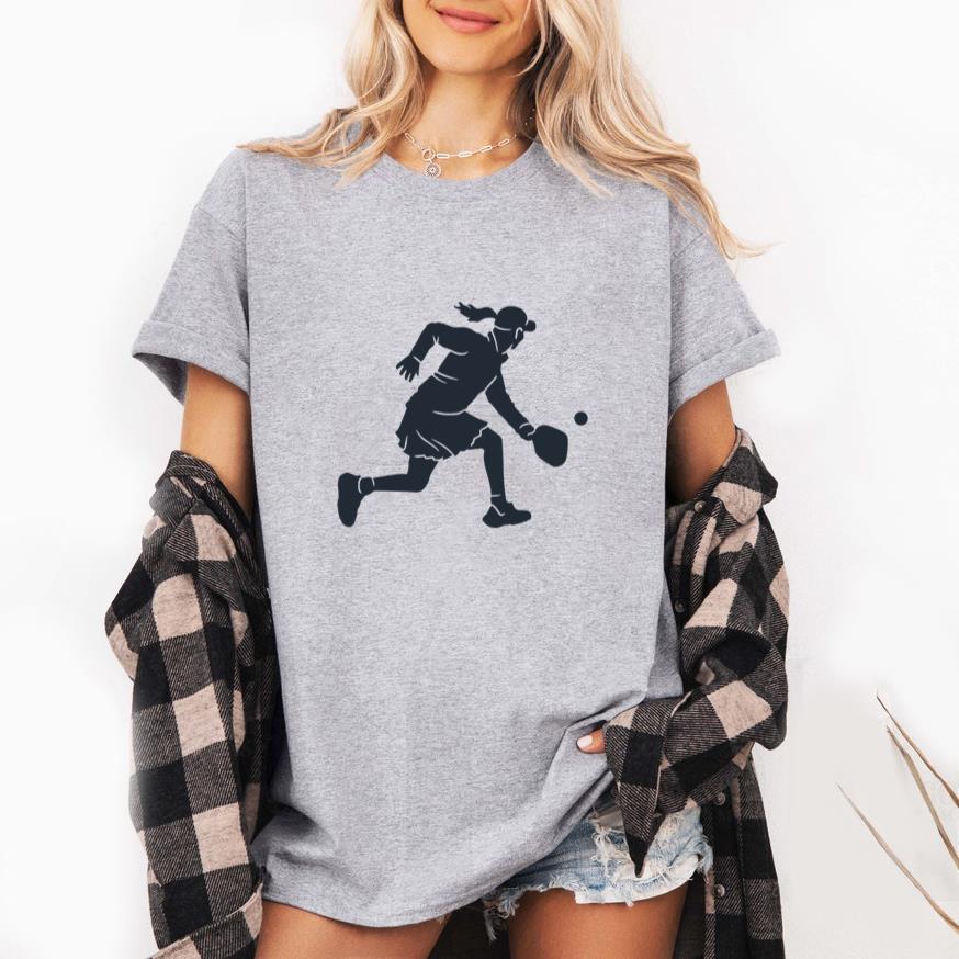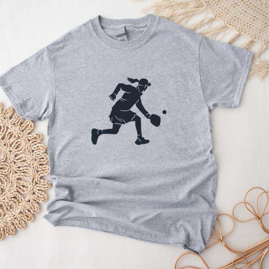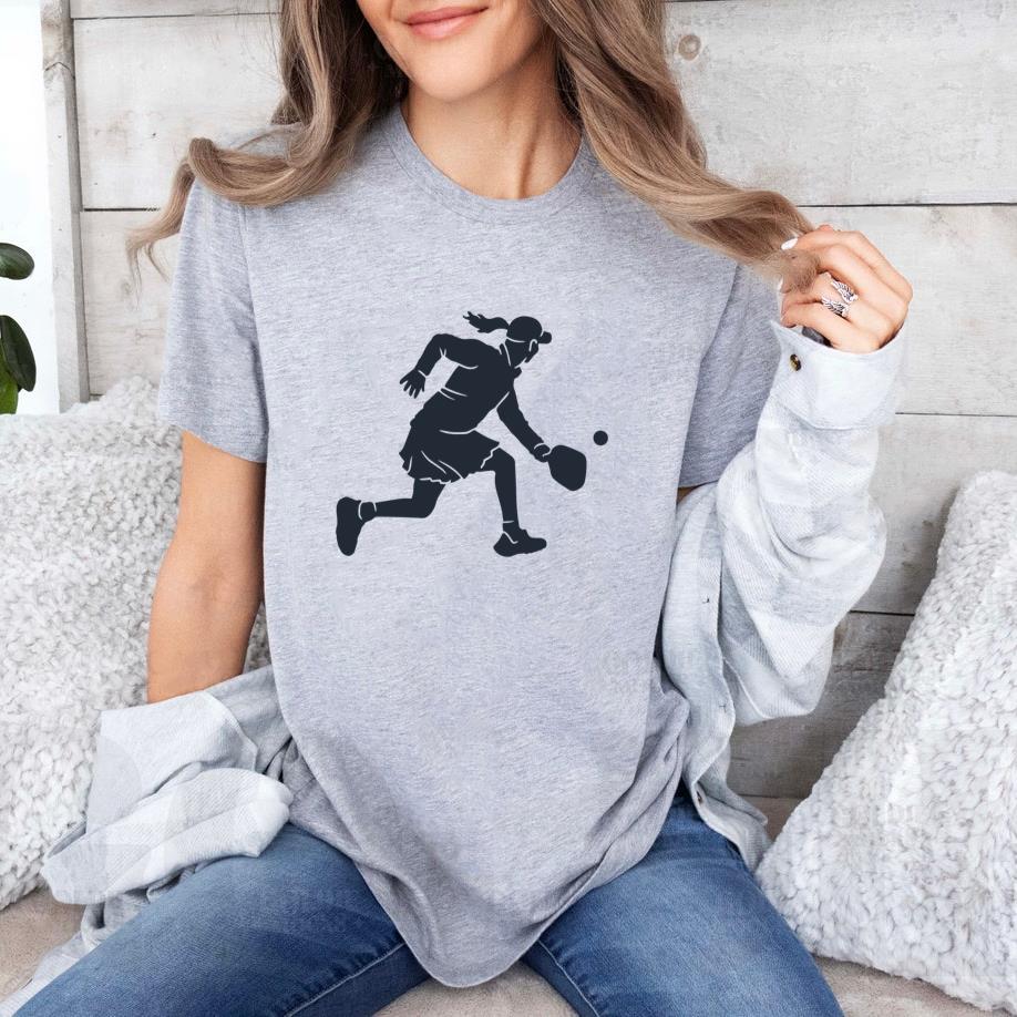 Comfy, casual, and always in style, this Silhouette Of A Woman Running With A Pickeball Racket T-Shirt T-shirt is perfect for daily wear or easy gifting.