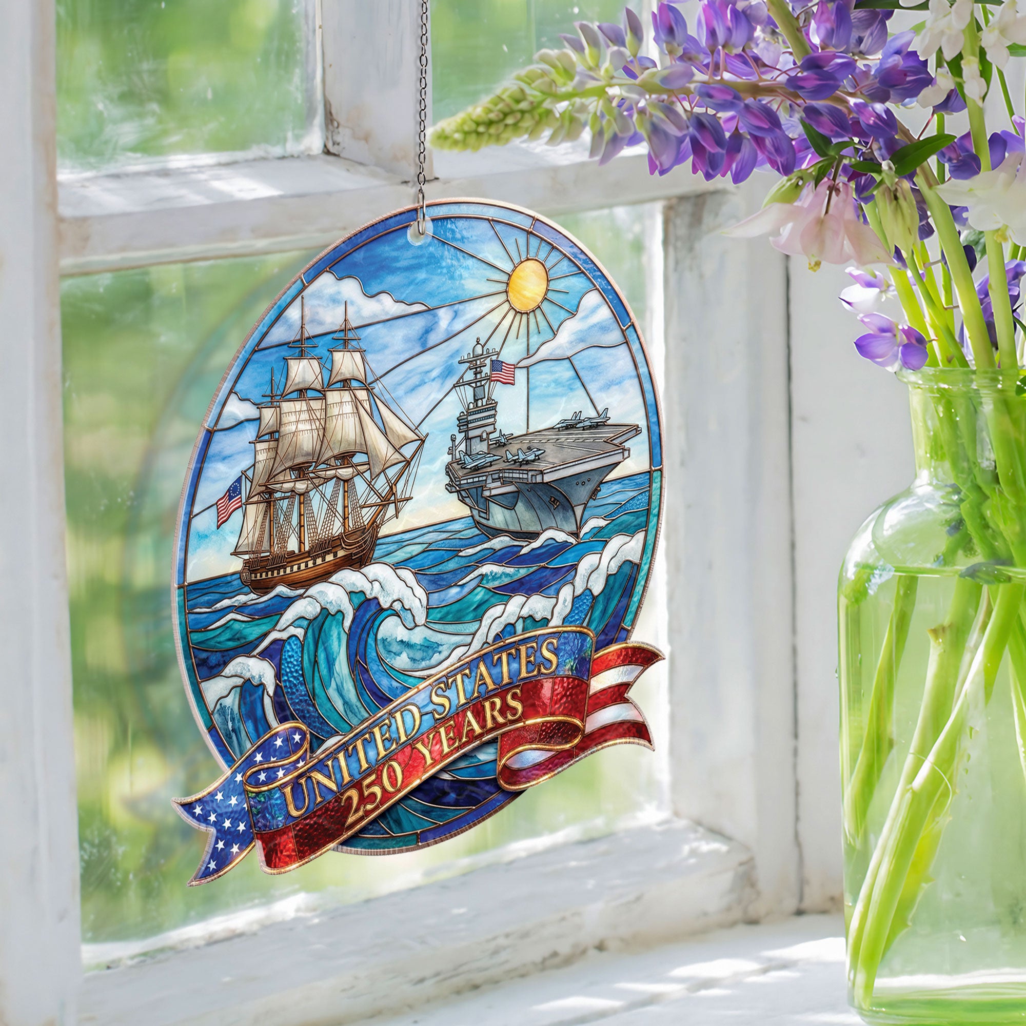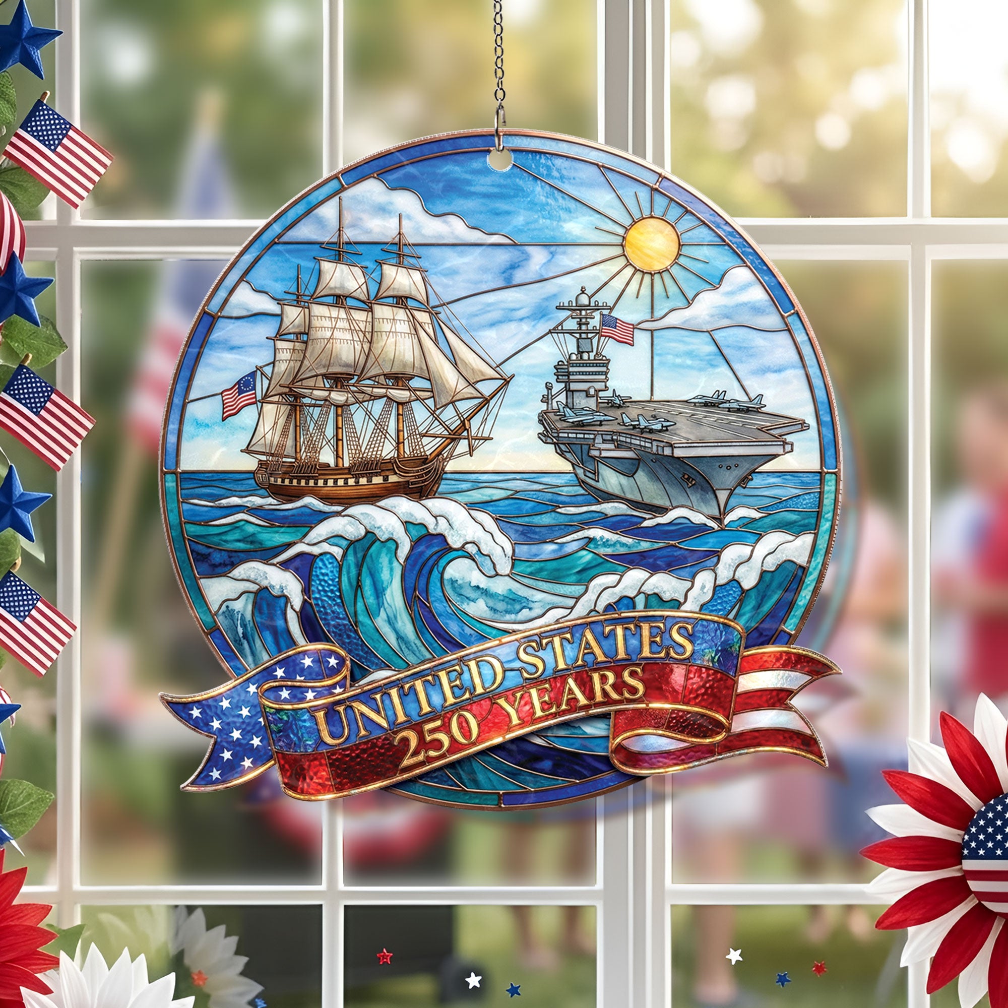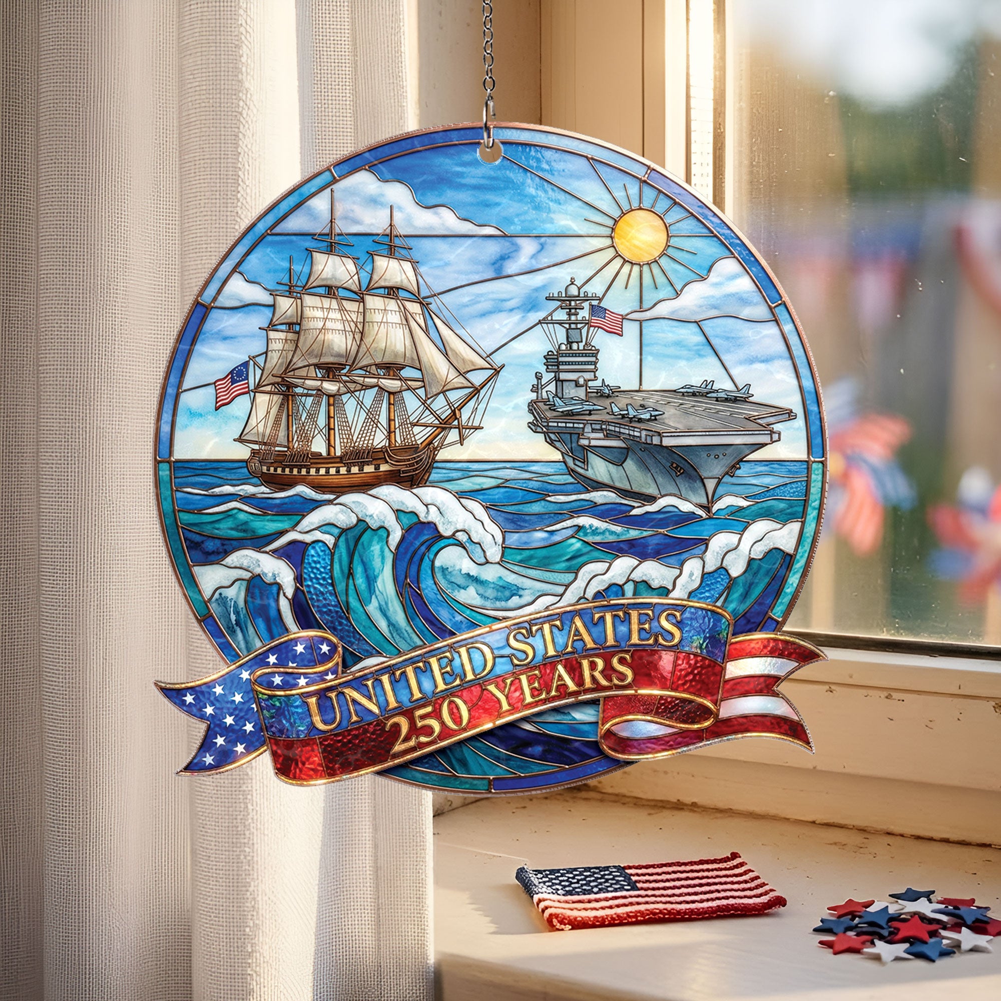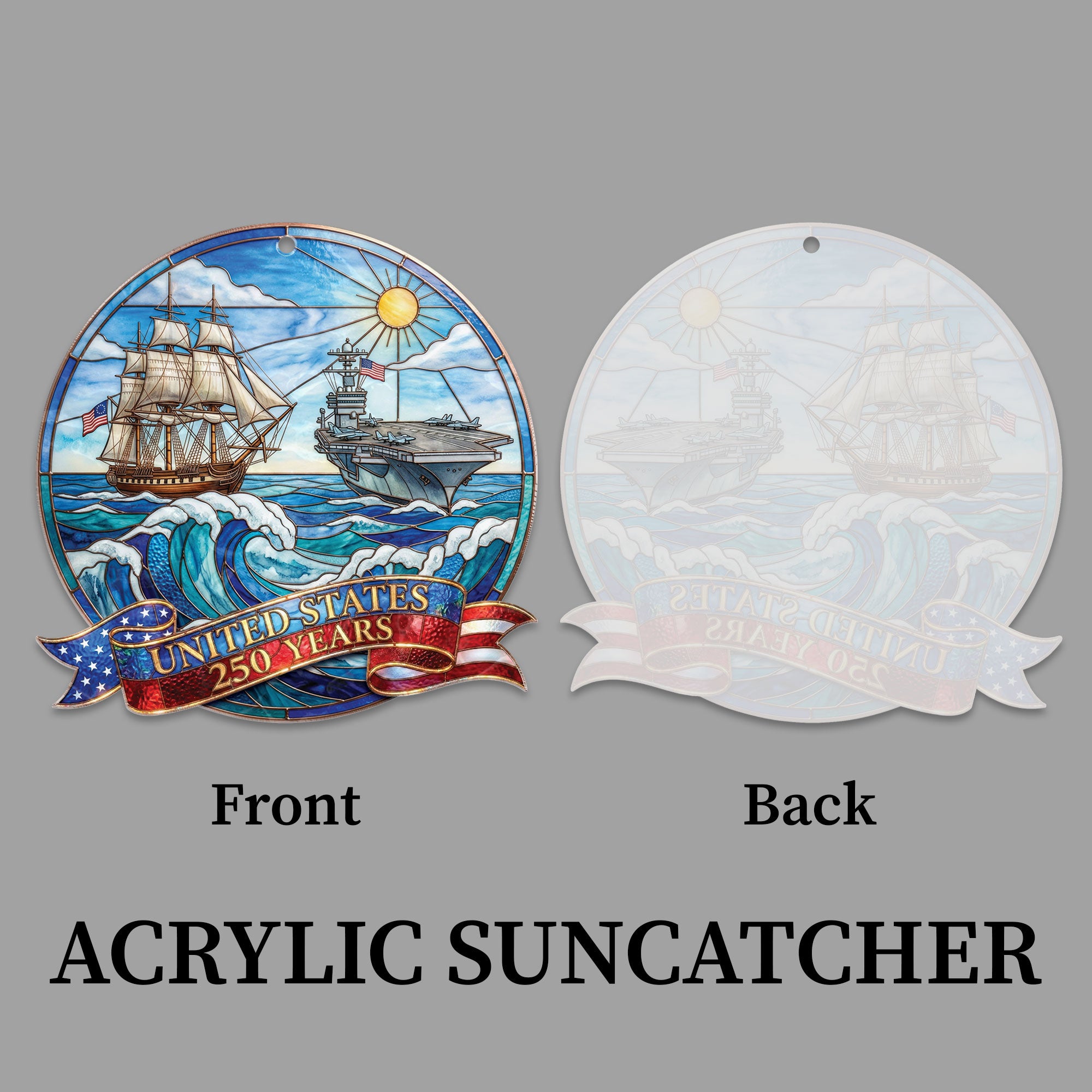 Celebrate 250 years of United States naval history with this striking acrylic suncatcher ornament. Featuring a detailed design of a powerful naval ship and aircraft carrier, it honors the strength and legacy of the U.S. Navy across the seas for generations. Crafted from durable, high-quality acrylic, this suncatcher catches sunlight beautifully, casting colorful rainbows while serving as a meaningful tribute to the enduring mission of defending freedom. Perfect for hanging in windows, patios, or as patriotic decor in homes, offices, or veteran spaces. Ideal for history enthusiasts, Navy veterans, and patriots commemorating America’s 250th anniversary. Lightweight and easy to display, it combines historical significance with elegant ornamentation.