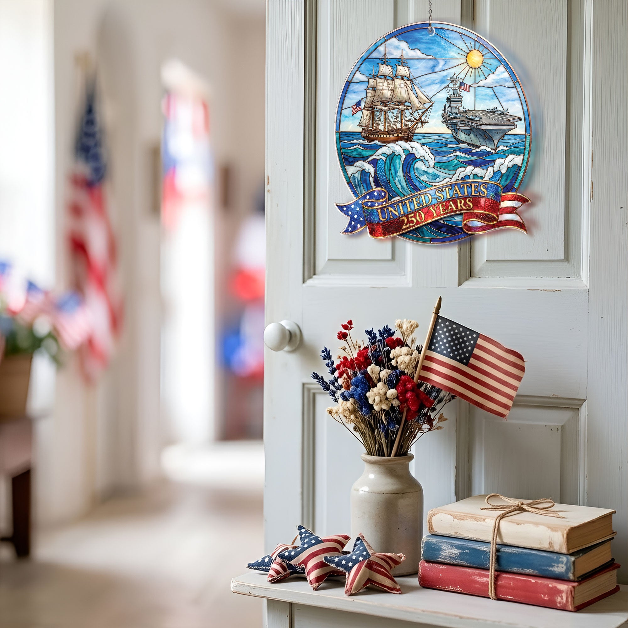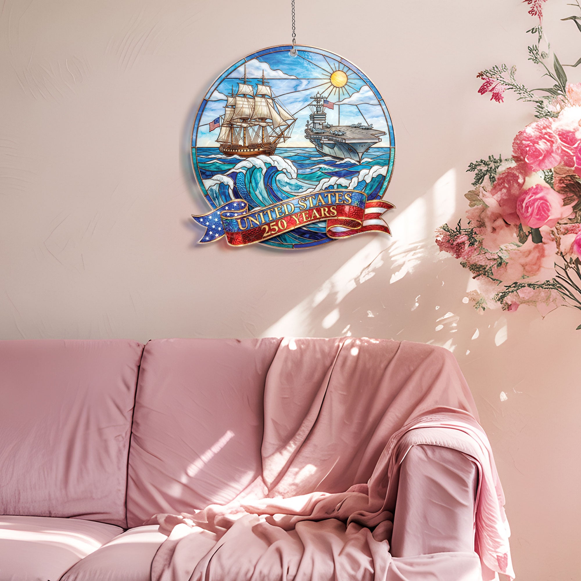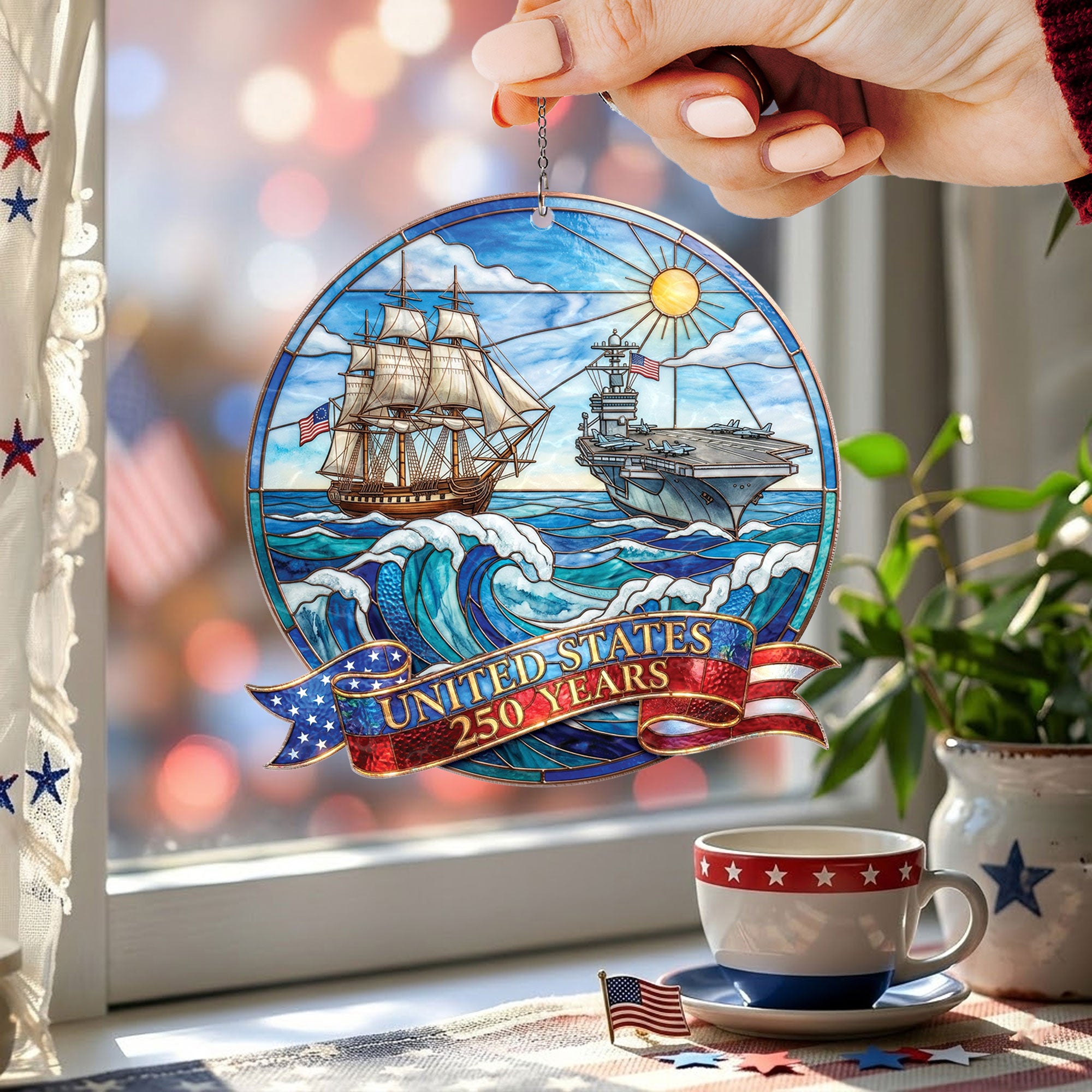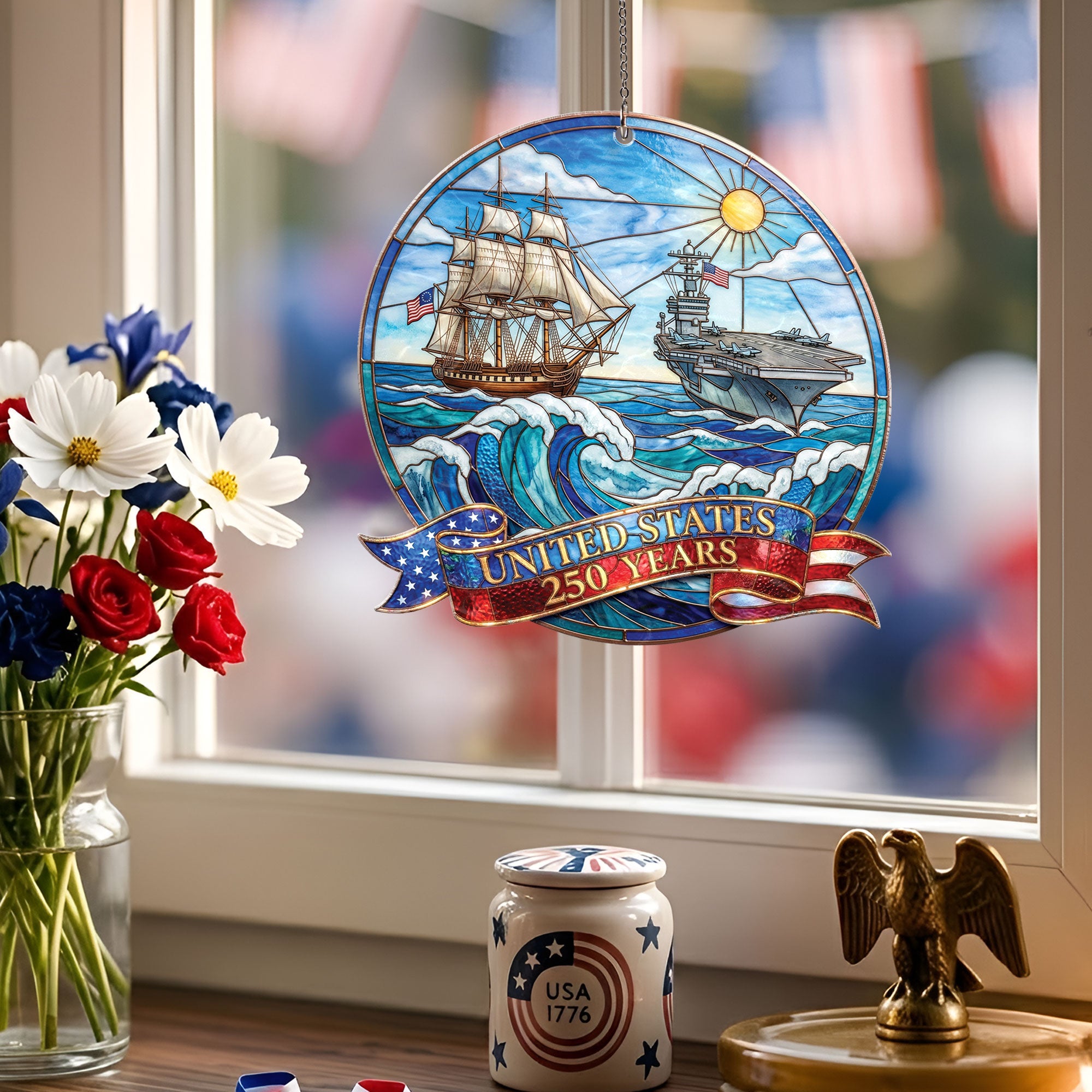 Celebrate 250 years of United States naval history with this striking acrylic suncatcher ornament. Featuring a detailed design of a powerful naval ship and aircraft carrier, it honors the strength and legacy of the U.S. Navy across the seas for generations. Crafted from durable, high-quality acrylic, this suncatcher catches sunlight beautifully, casting colorful rainbows while serving as a meaningful tribute to the enduring mission of defending freedom. Perfect for hanging in windows, patios, or as patriotic decor in homes, offices, or veteran spaces. Ideal for history enthusiasts, Navy veterans, and patriots commemorating America’s 250th anniversary. Lightweight and easy to display, it combines historical significance with elegant ornamentation.