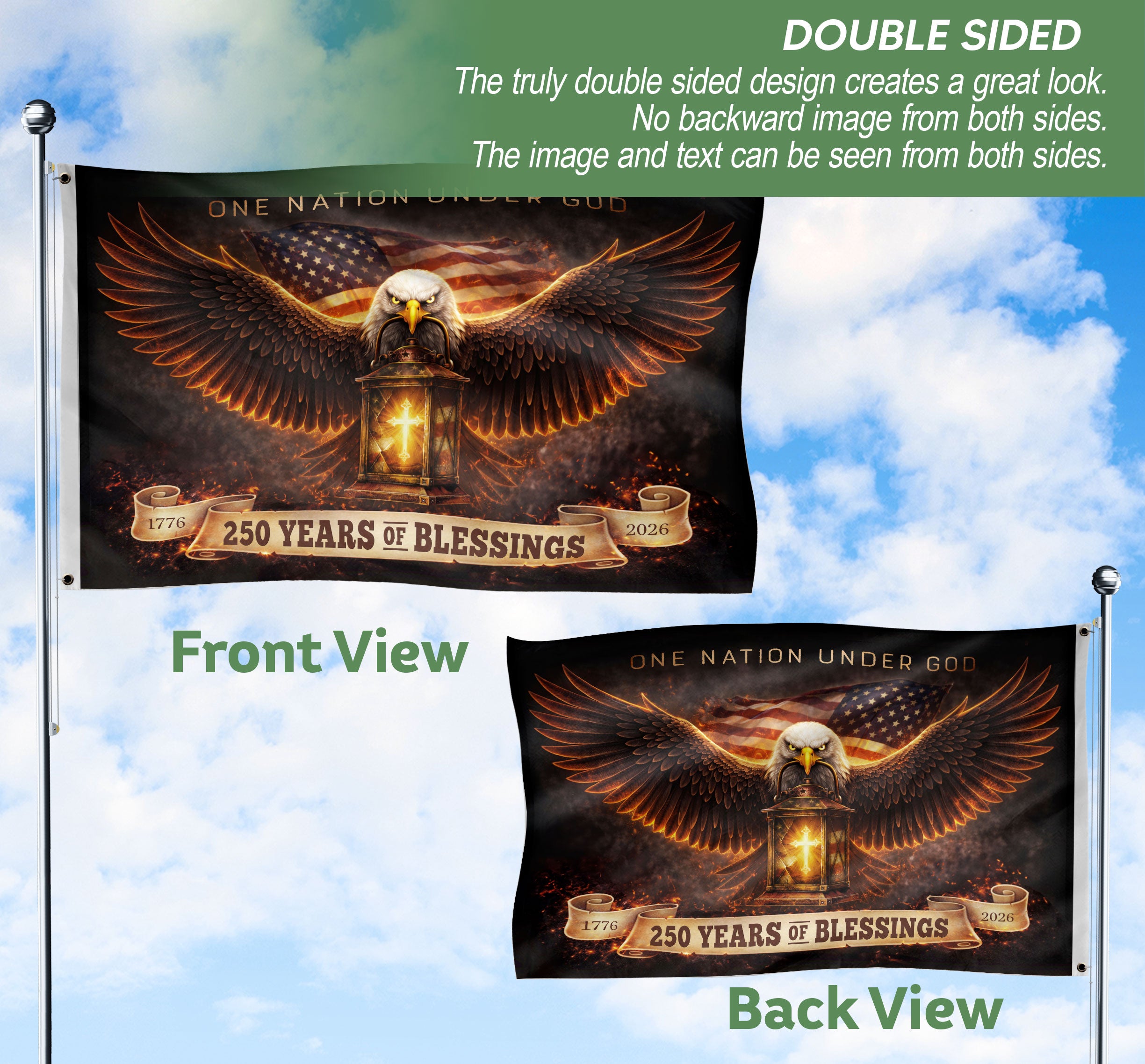 Celebrate America’s 250th anniversary from 1776 to 2026 with this striking Christian patriotic cross flag. The design prominently features a majestic eagle, the historic timeline 1776–2026, and the powerful inscription ‘One Nation Under God,’ symbolizing faith in Christ, freedom, and the enduring American heritage. Perfect for outdoor display in gardens, yards, porches, or during patriotic celebrations, this flag serves as a meaningful tribute to the nation’s Christian roots and values. Crafted for durability to withstand outdoor conditions, it adds a bold statement of patriotism and spirituality to any space.