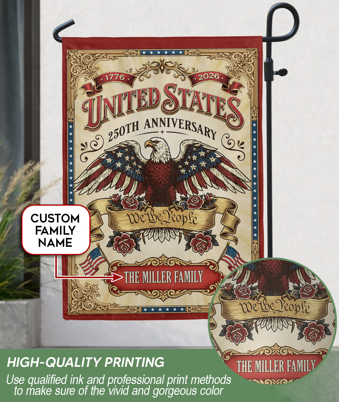 Celebrate the United States 250th anniversary from 1776 to 2026 with this custom garden flag. Featuring a majestic bald eagle, blooming roses, and the iconic ‘We The People’ parchment design, this patriotic banner is perfect for displaying your family heritage. Personalize it with your family name to create a unique, timeless piece for your yard, porch, or garden. Crafted for durability and weather resistance, it proudly honors American history and independence. Ideal for patriots, history enthusiasts, and families wanting to showcase their pride during the semiquincentennial celebrations.