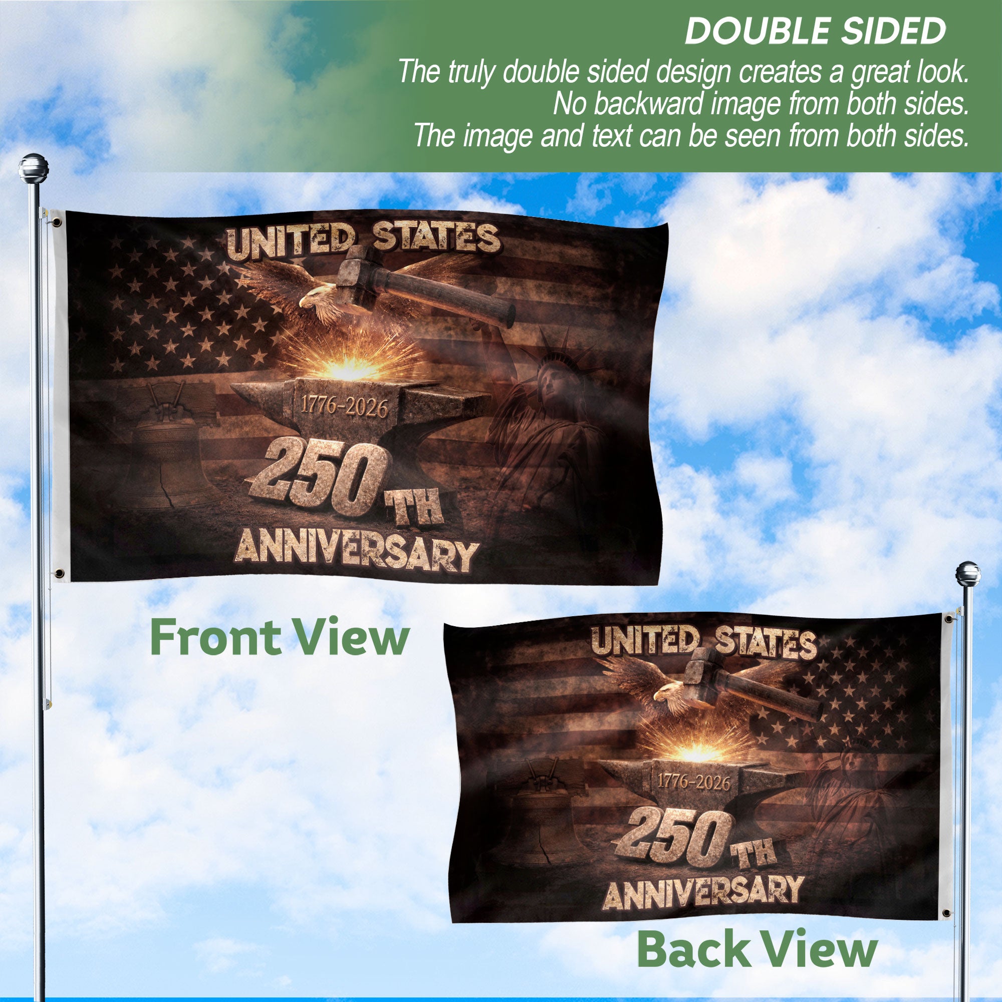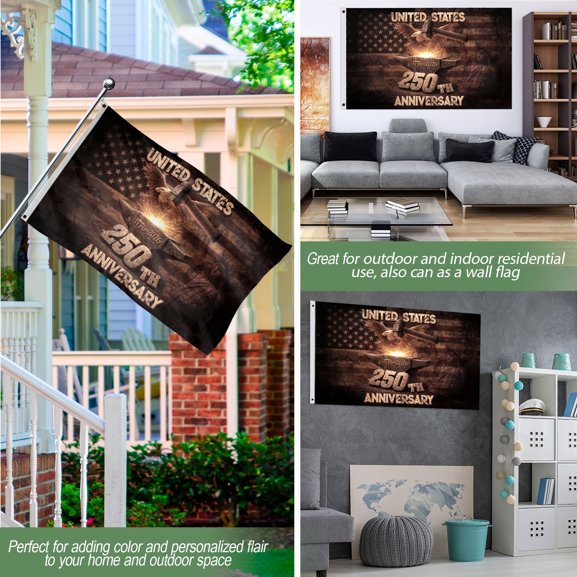 Celebrate 250 years of American independence with the United States 250th Anniversary Flag, commemorating 1776-2026. This patriotic outdoor garden flag features a bold, contemporary design that honors U.S. heritage and national pride. Made from high-quality, weather-resistant polyester fabric, it endures wind, rain, and sun exposure for reliable, long-lasting outdoor display. The double-sided print delivers vibrant colors visible from any angle, making it ideal for gardens, yards, porches, patios, mailboxes, or fences. Perfect for Semiquincentennial celebrations, Fourth of July, Memorial Day, or daily displays of American spirit. Easy to install with reinforced grommets on standard garden flag stands. Standard garden flag size ensures versatile use. Showcase freedom and unity with this durable, commemorative USA flag crafted for patriotic enthusiasts.