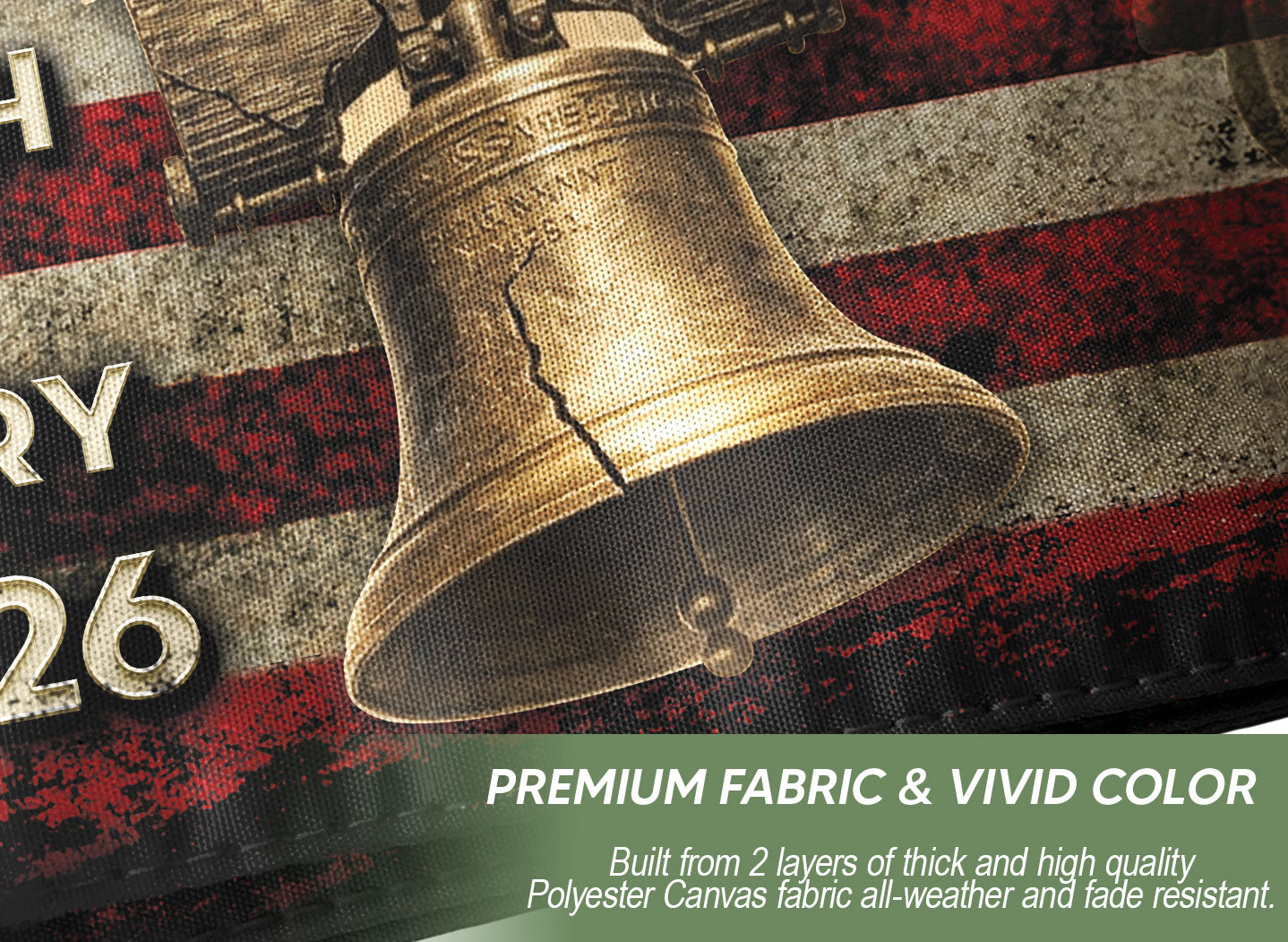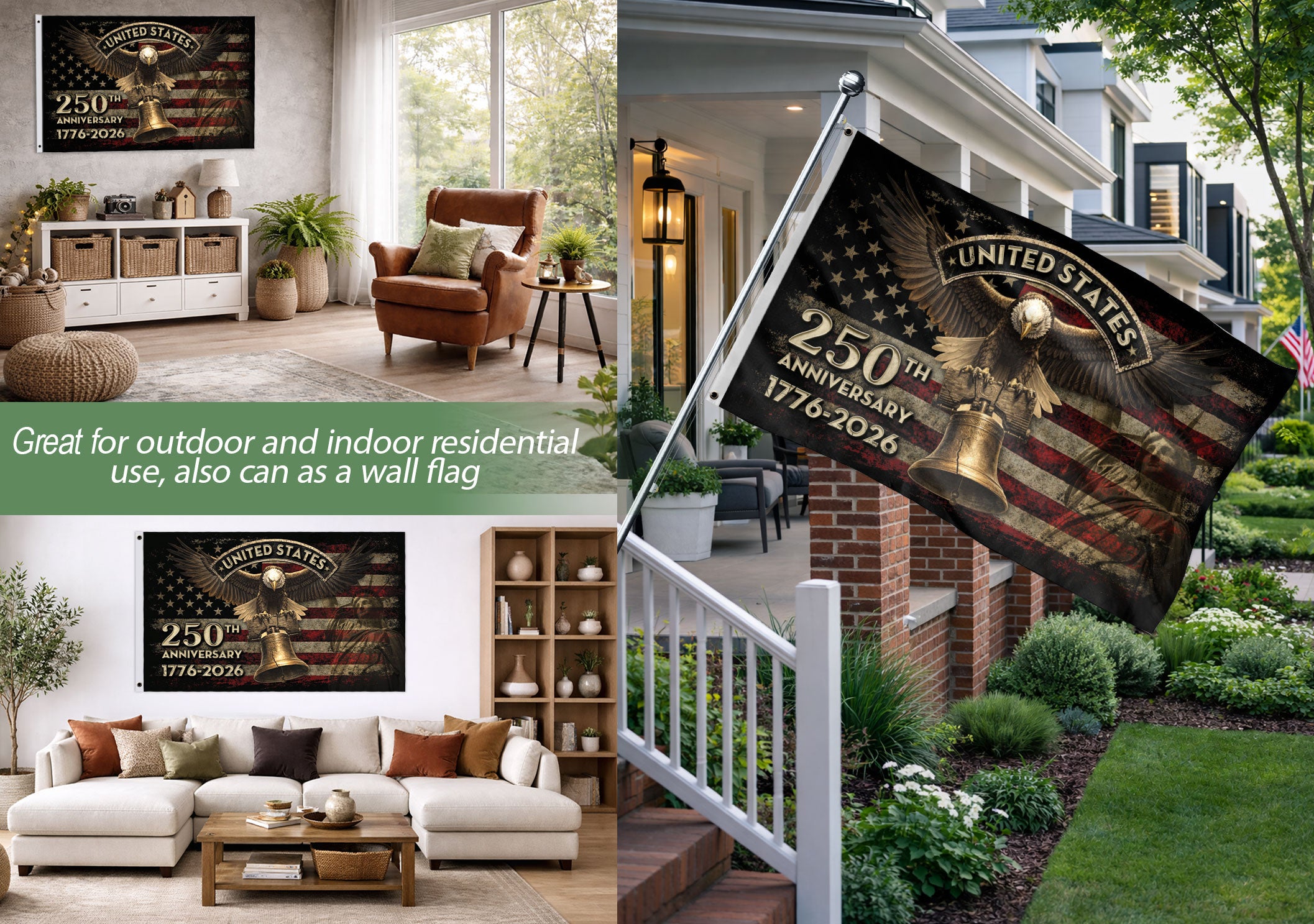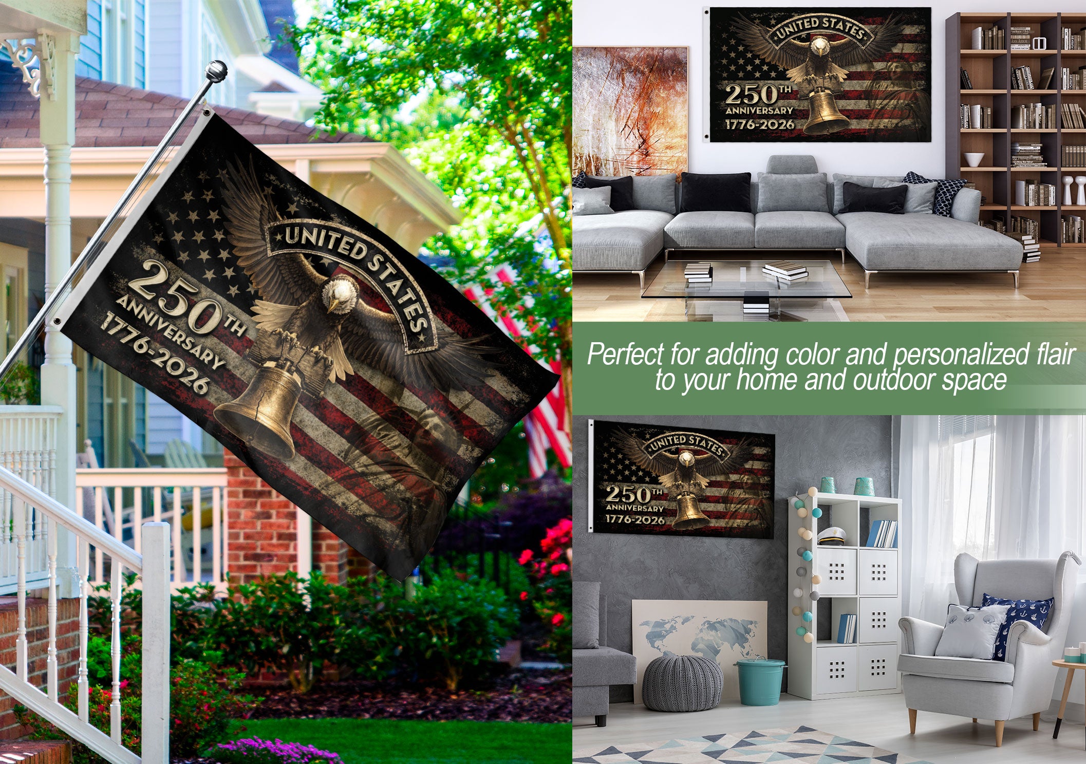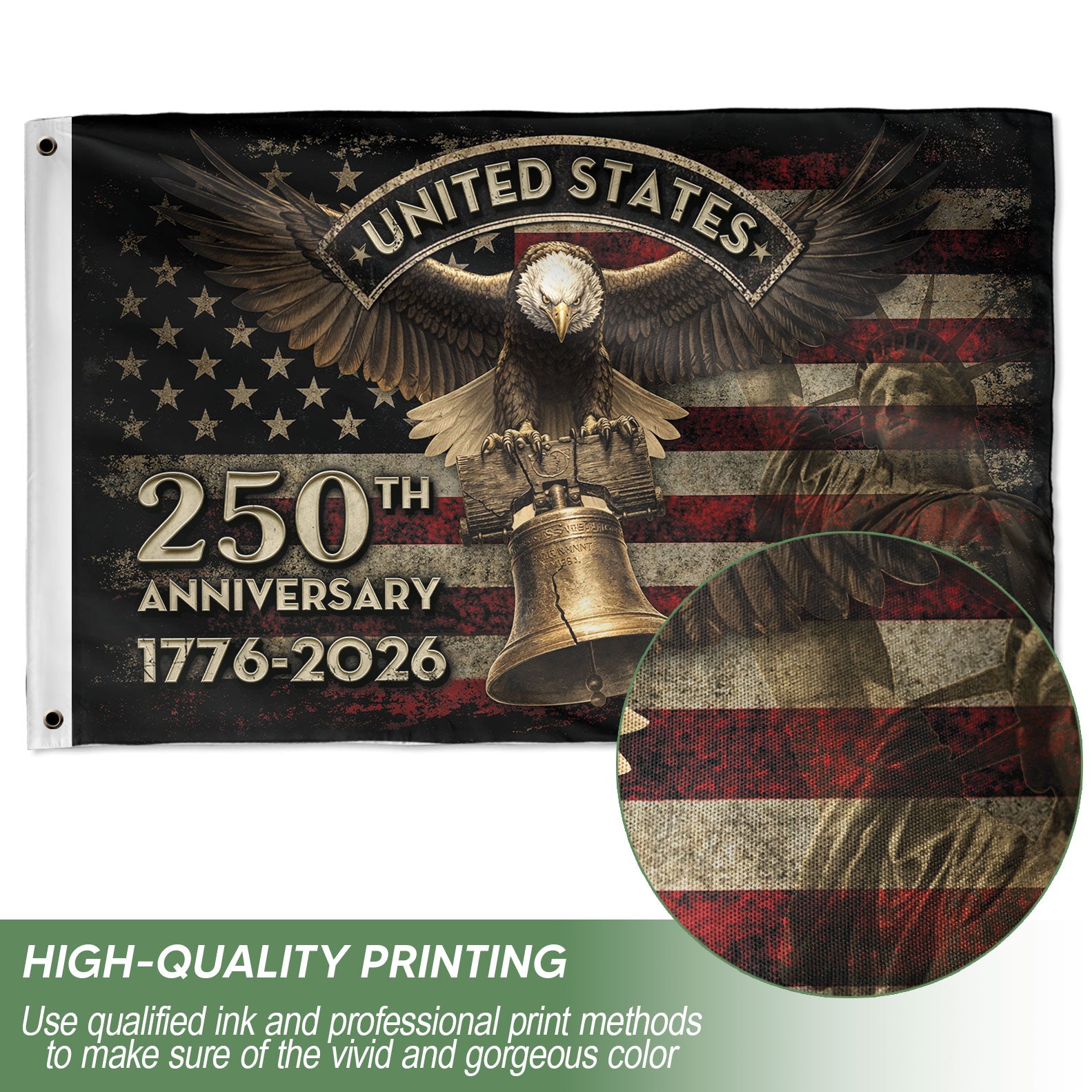 Celebrate America’s 250th anniversary with this striking United States flag featuring a powerful eagle perched above the iconic Liberty Bell, framed by the historic years 1776–2026. This patriotic décor embodies the strength of freedom, legacy of independence, resilience, and unity. Designed in a bold, vintage-inspired style, it serves as a meaningful tribute to the enduring spirit of the nation. Perfect for displaying at home, offices, events, or outdoor spaces to honor American pride and history. Crafted for lasting durability, this commemorative flag captures the essence of patriotism and is ideal for collectors, history enthusiasts, and anyone cherishing the nation’s milestones.