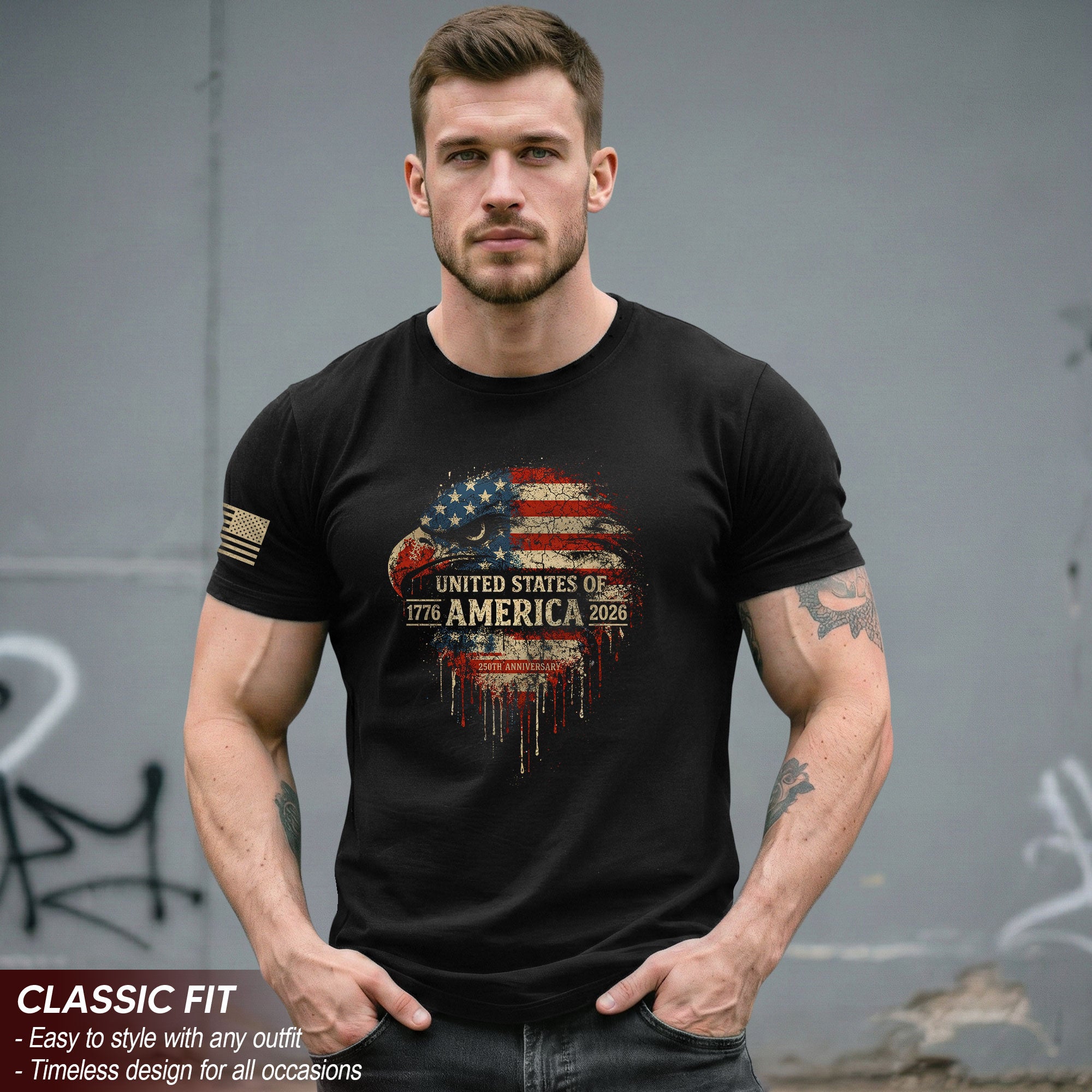 Celebrate America’s 250th birthday from 1776 to 2026 with this patriotic T-shirt featuring a bold USA flag and majestic eagle design. Crafted for comfort and style, this anniversary tee embodies strength, unity, and the enduring spirit of liberty. Perfect for Independence Day celebrations, veterans, history enthusiasts, or anyone proud of American heritage. Made from high-quality, soft cotton blend fabric that holds up wash after wash, ensuring vibrant colors and sharp graphics that won’t fade. Available in multiple sizes for men, women, and unisex fit. Wear it to parades, barbecues, fireworks shows, or everyday to show your patriotic pride as the nation marks a quarter millennium of freedom. Ideal gift for Father’s Day, Memorial Day, or any occasion honoring the USA’s journey.