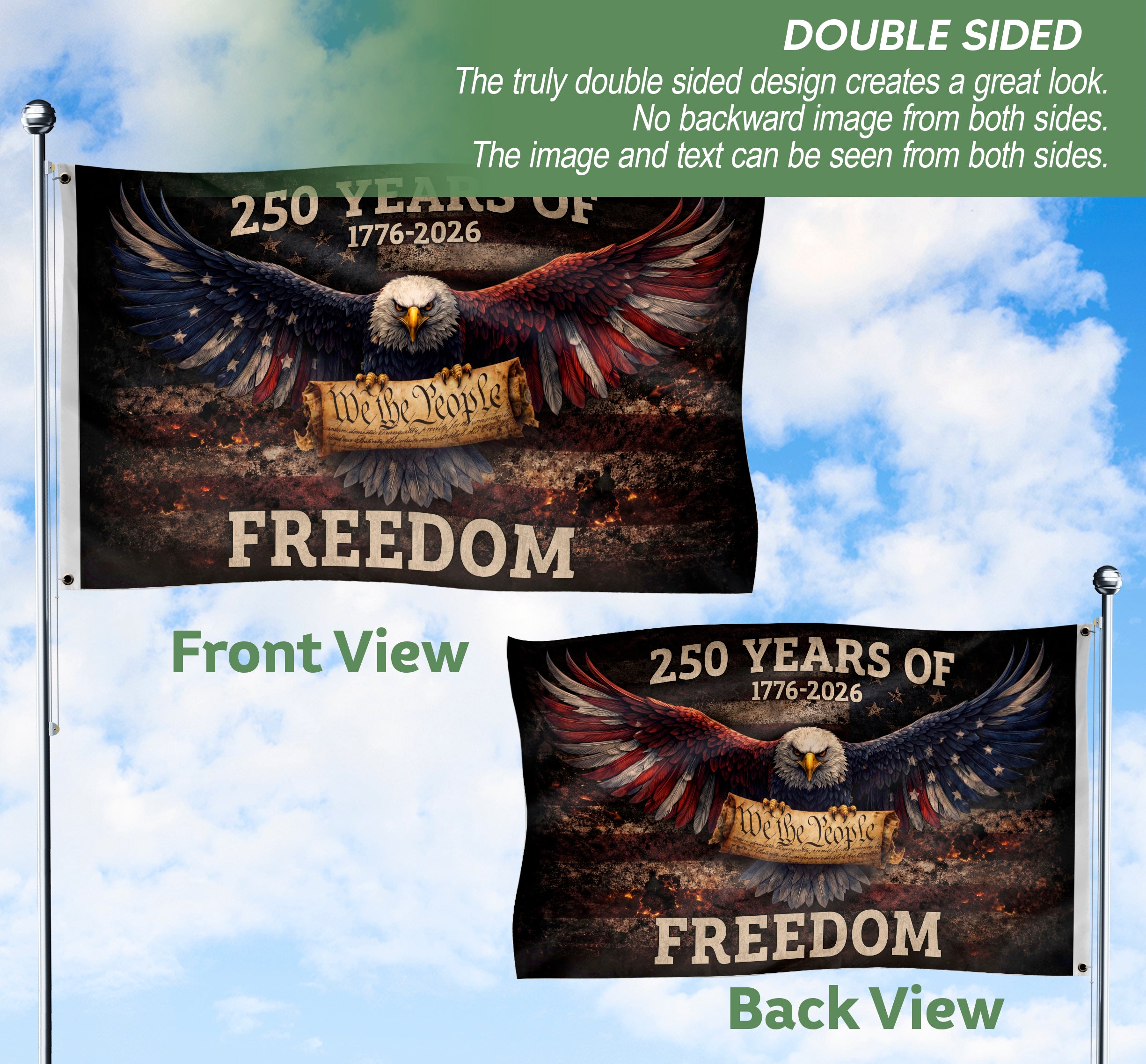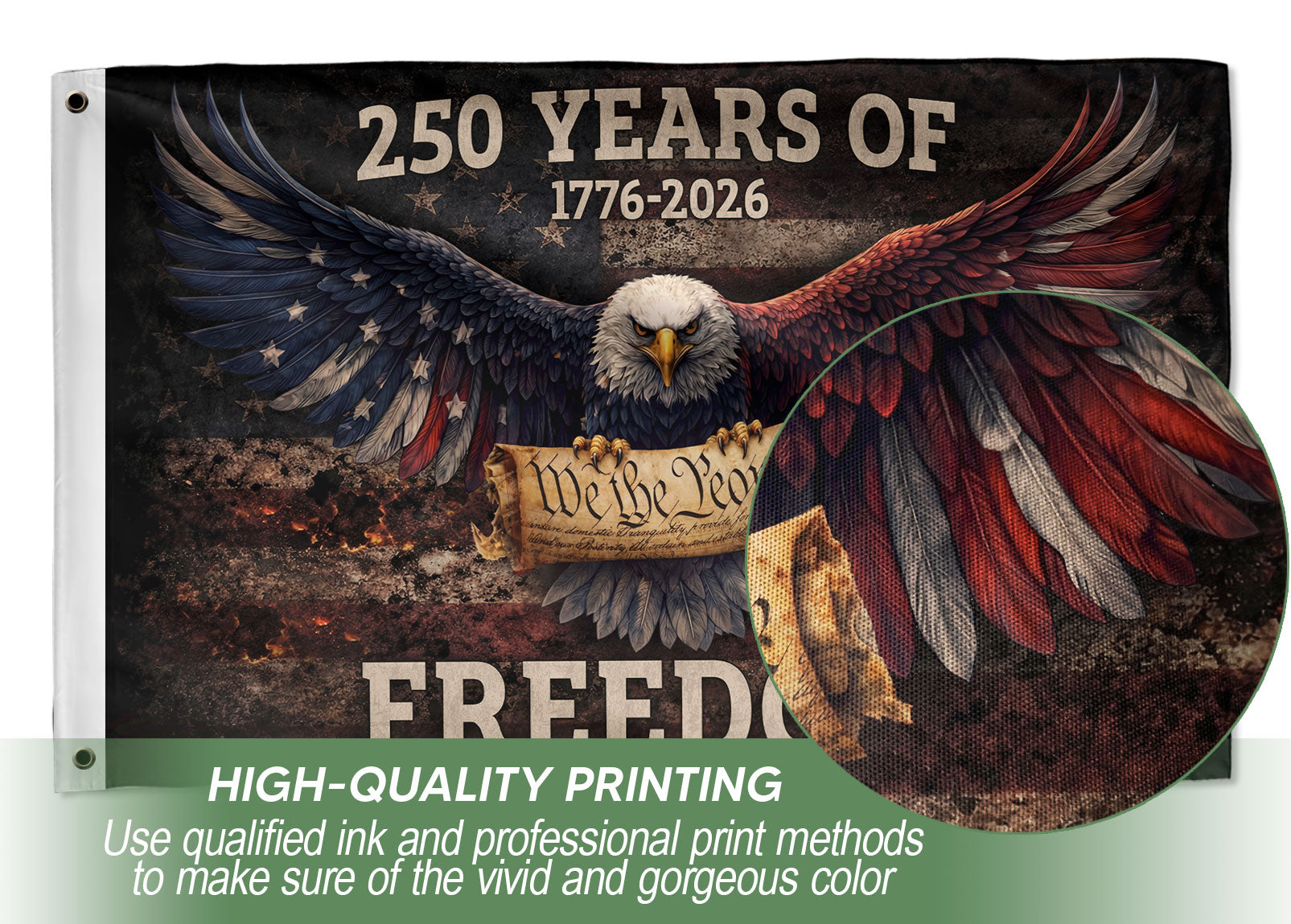 Celebrate America’s 250th birthday with this patriotic United States Freedom Flag featuring ‘We The People’ and the years 1776-2026. Perfect for outdoor display in gardens, yards, or patios, this bold garden flag proudly represents American heritage, independence, and national pride. Crafted for durability to withstand weather elements, it adds a striking touch of patriotism to any outdoor space. Ideal for Semiquincentennial celebrations, historical commemorations, or everyday display of freedom and unity.
