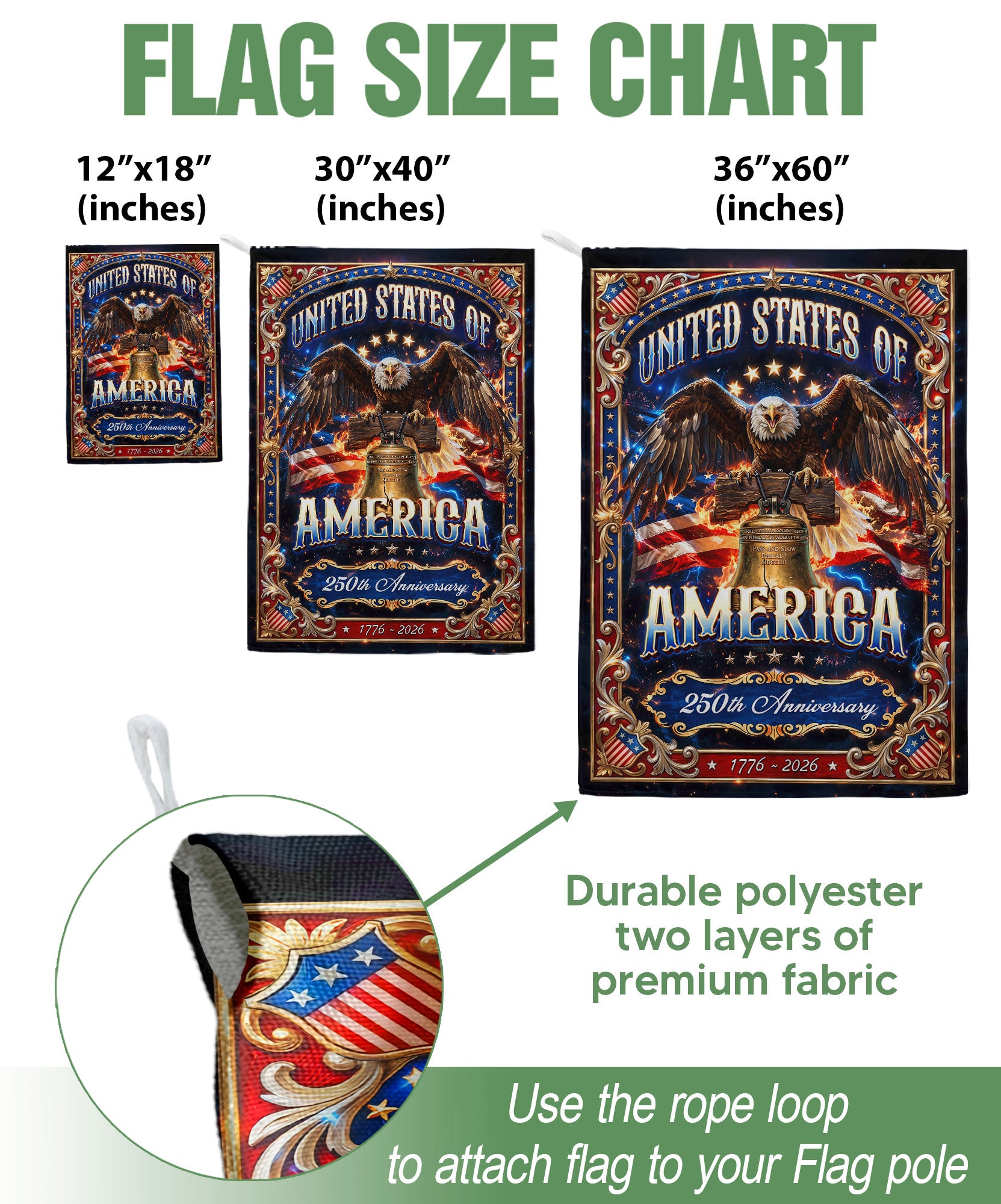Celebrate American pride with this United States house flag featuring a striking bald eagle perched near the iconic Liberty Bell, commemorating 1776-2026. This patriotic flag design honors the nation’s history, freedom, and enduring spirit. Ideal for displaying on your porch, garden flagpole, or home exterior during holidays like the 4th of July, Independence Day, Memorial Day, or Veterans Day, as well as everyday decoration to showcase your love for the USA. Crafted from durable, weather-resistant polyester fabric that withstands outdoor conditions, ensuring vibrant colors and clear details year-round. Double-sided printing for visibility from both sides, with reinforced edges and brass grommets for easy hanging on standard house flag poles (not included). Measures approximately 28×40 inches, perfect size for residential display. Easy to clean and store. Bring a timeless, heroic look to your home and inspire patriotism in your neighborhood.