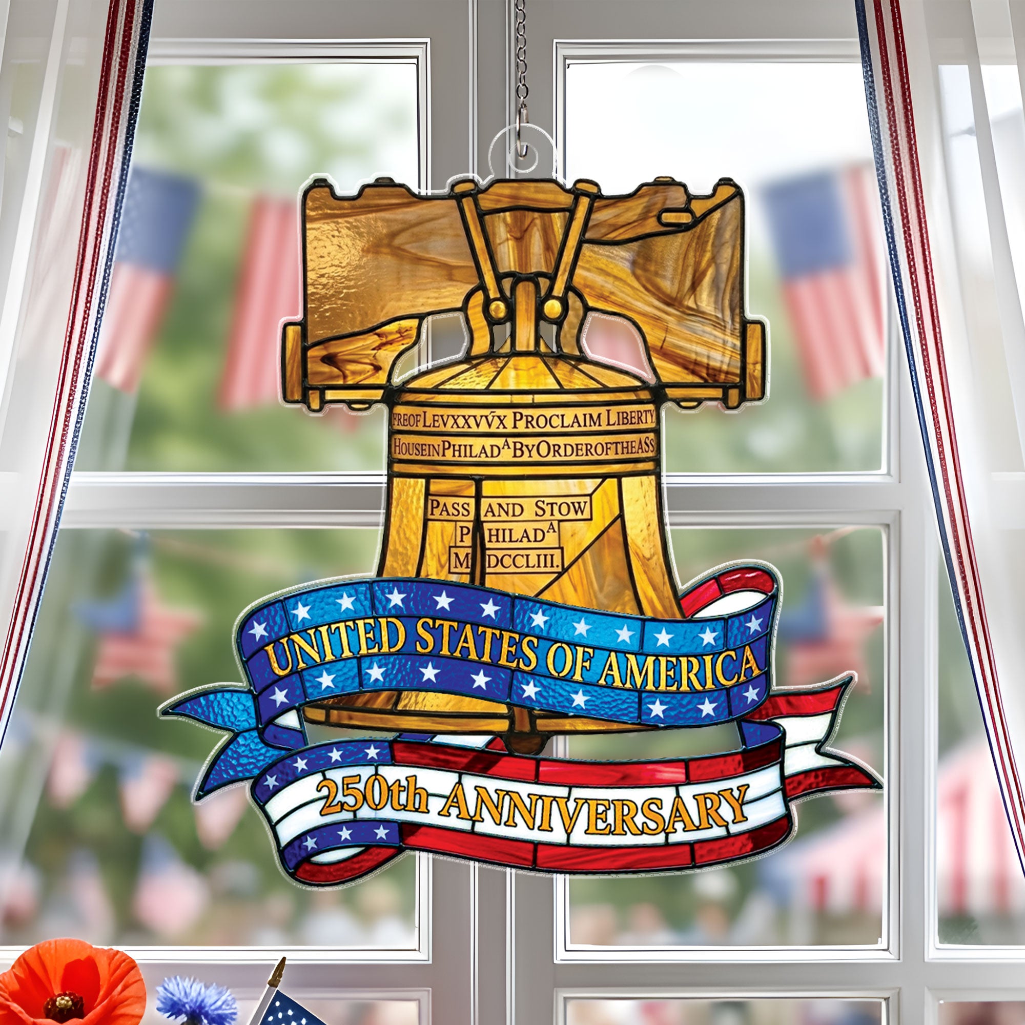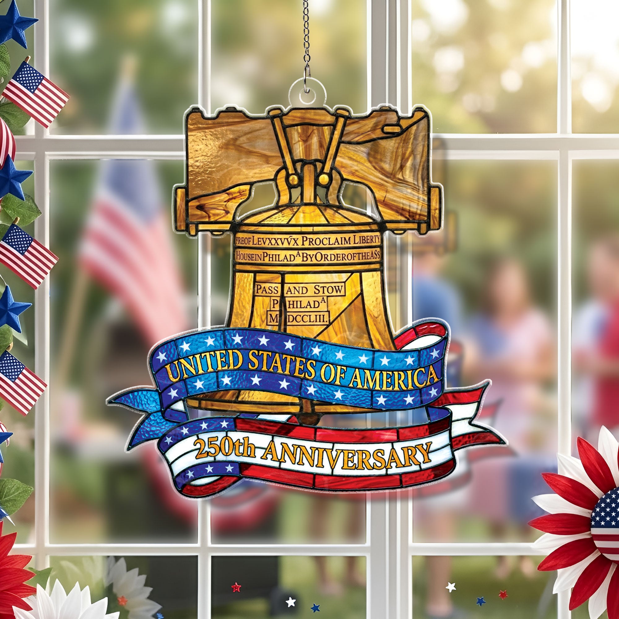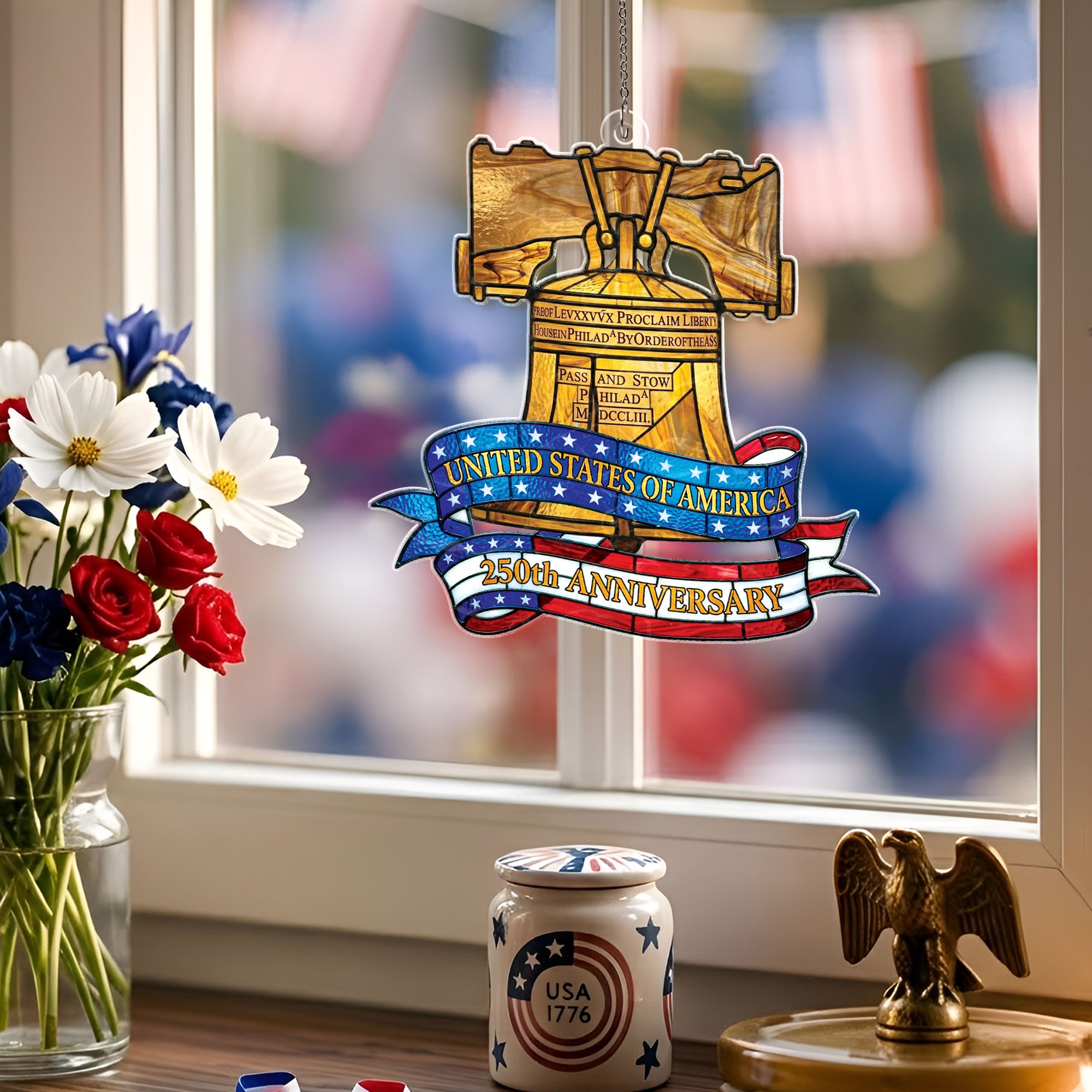 Celebrate America’s 250th anniversary with this stunning Philadelphia Liberty Bell heritage suncatcher ornament. Crafted from high-quality acrylic in a vibrant stained glass style, it captures the iconic symbol of liberty in radiant colors. Hang it in a window to create beautiful rainbows and dazzling light displays throughout your home. Perfect for patriotic decor, historical enthusiasts, or as a meaningful gift commemorating US independence. Durable, lightweight, and easy to display year-round on Christmas trees, mantels, or outdoor patios. Measures standard ornament size for versatile use. Embrace the enduring spirit of freedom with this timeless piece of American heritage.