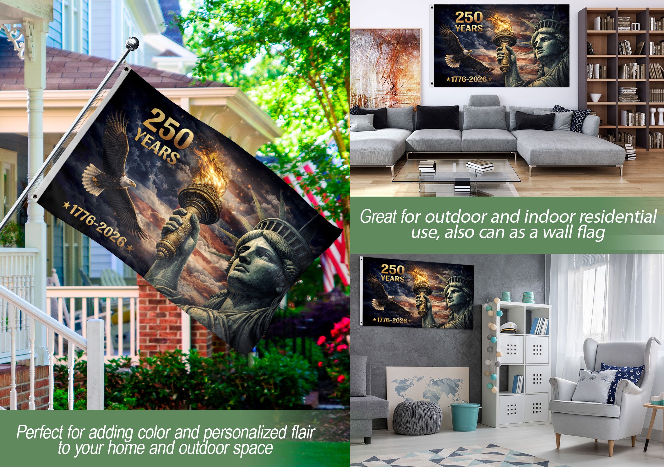 Celebrate 250 years of American independence with this striking USA 250 Years Flag featuring the iconic Statue of Liberty torch and a majestic soaring eagle on a bold American flag backdrop. The prominent ‘250 Years’ text and dates 1776–2026 commemorate the nation’s historic journey from founding to semiquincentennial anniversary. Crafted for durability, this patriotic flag symbolizes freedom, strength, and enduring ideals. Perfect for home décor, patios, gardens, porches, or outdoor display to honor the United States’ legacy. Ideal for veterans, history enthusiasts, and proud Americans marking this milestone event.