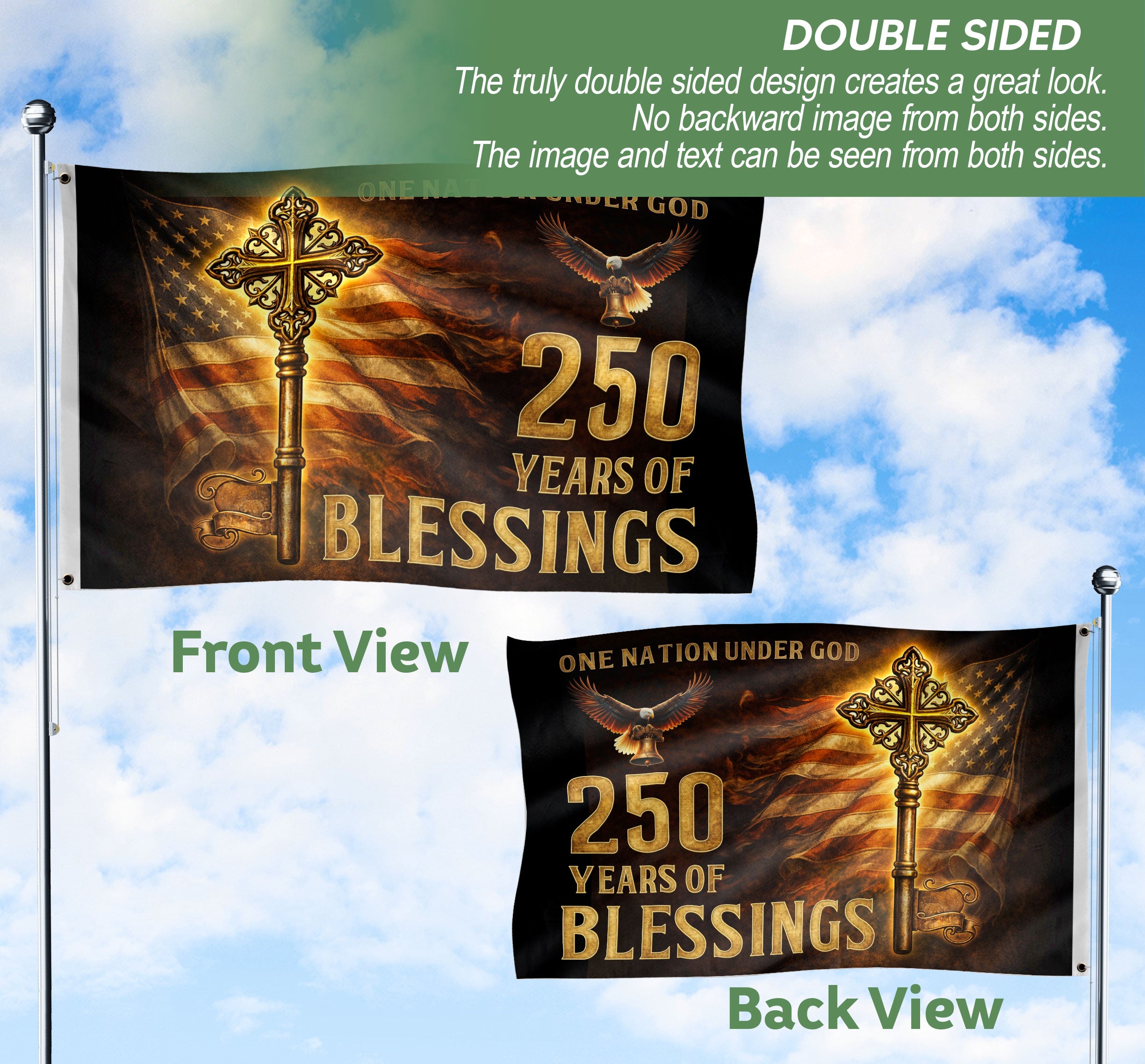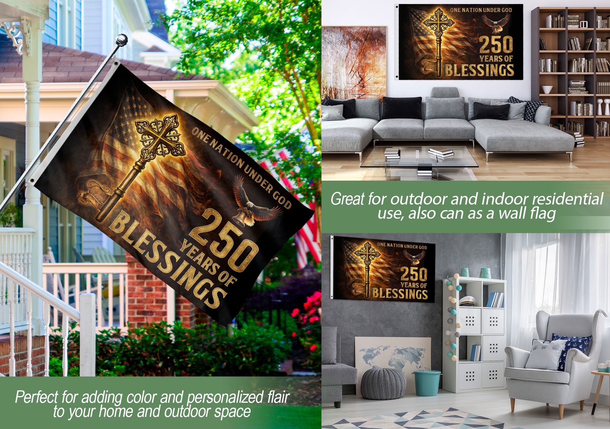 Celebrate 250 years of American history and faith with the USA 250 Years of Faith Cross Flag. This striking Christian patriotic flag features a bold cross emblem, the iconic phrase ‘One Nation Under God,’ and ‘250 Years of Blessings,’ commemorating the nation’s spiritual heritage from 1776 to 2026. Crafted for durable outdoor use, it’s perfect for displaying in gardens, yards, porches, or during patriotic celebrations, church events, and Independence Day gatherings. Show your gratitude for America’s Christian roots and inspire others with this meaningful symbol of faith and freedom. High-quality polyester construction ensures vibrant colors and weather resistance for long-lasting display.