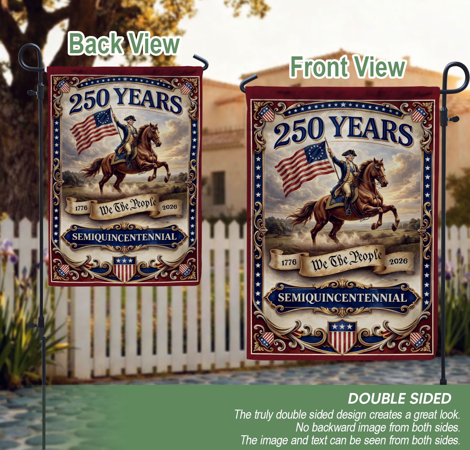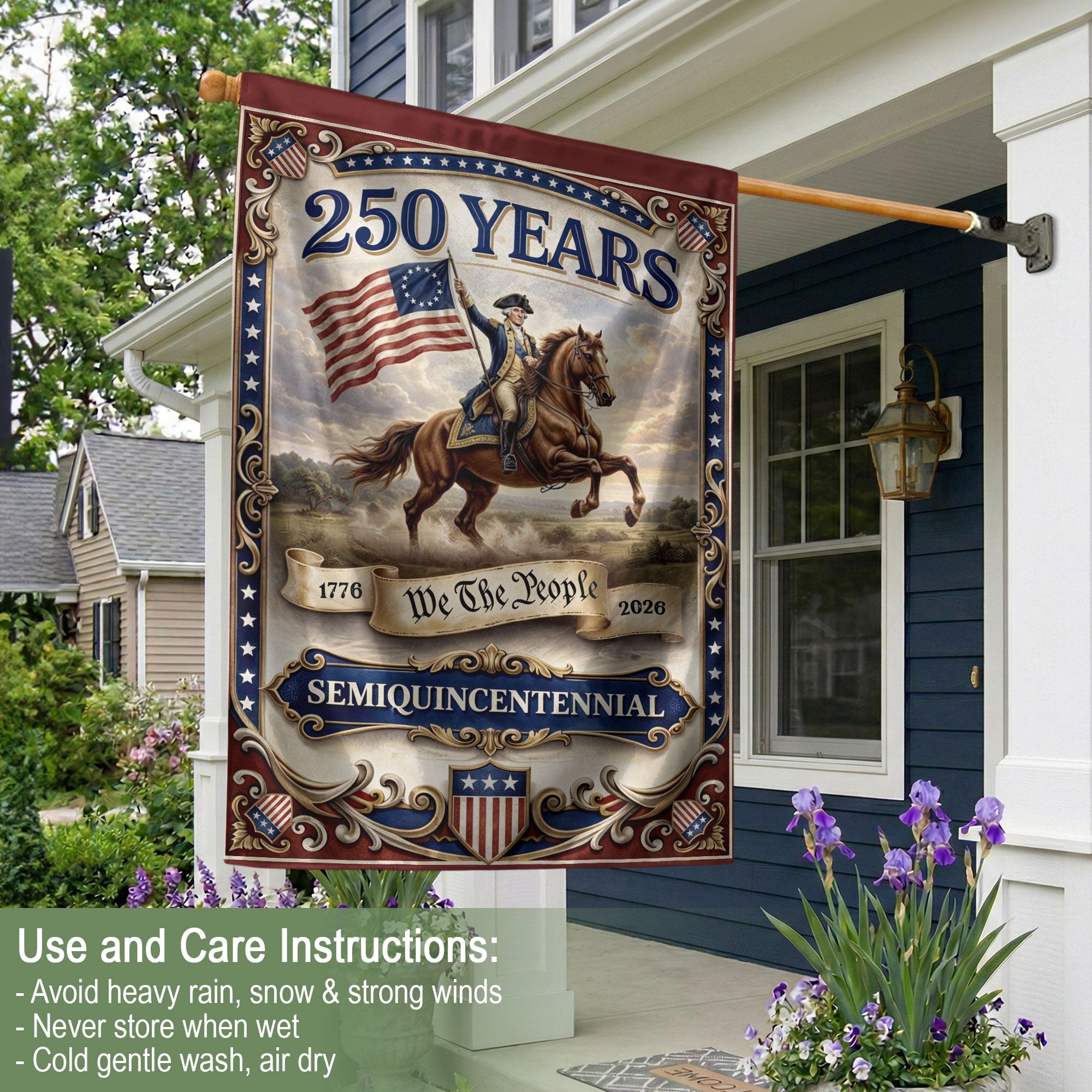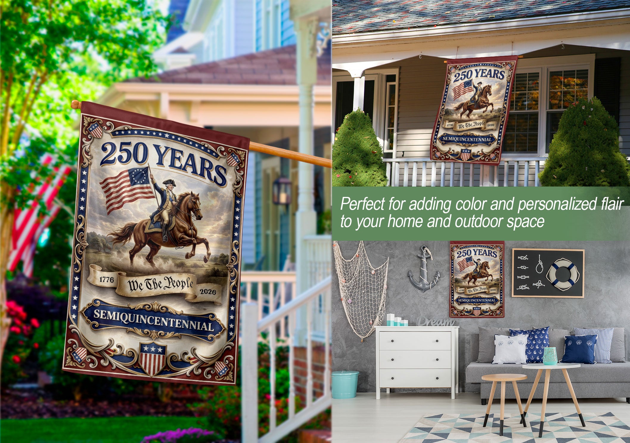 Celebrate America’s 250th anniversary with this double-sided house flag featuring George Washington and the iconic ‘We The People’ design. Commemorating the period from 1776 to 2026, this garden flag honors two and a half centuries of constitutional values, liberty, and enduring patriotism. Perfect for yard decor, porches, or gardens, it serves as a tribute to the nation’s founding leadership. Crafted for durability and visibility from both sides, it’s an ideal patriotic display for Independence Day, anniversaries, or everyday pride. Easy to hang with a standard flag bracket (sold separately). Show your American spirit with this high-quality anniversary yard flag.
