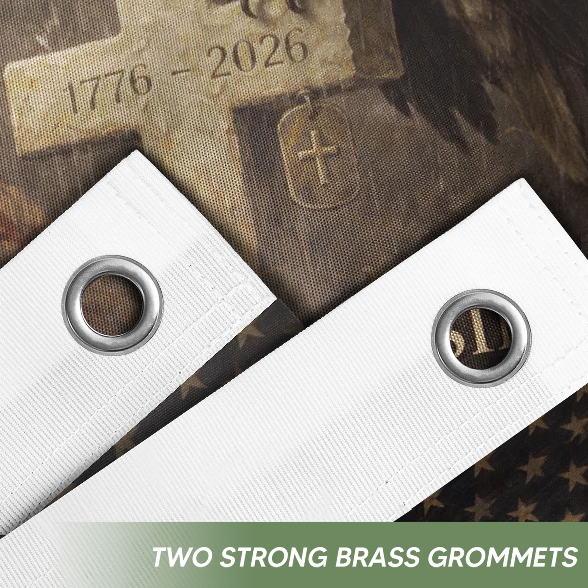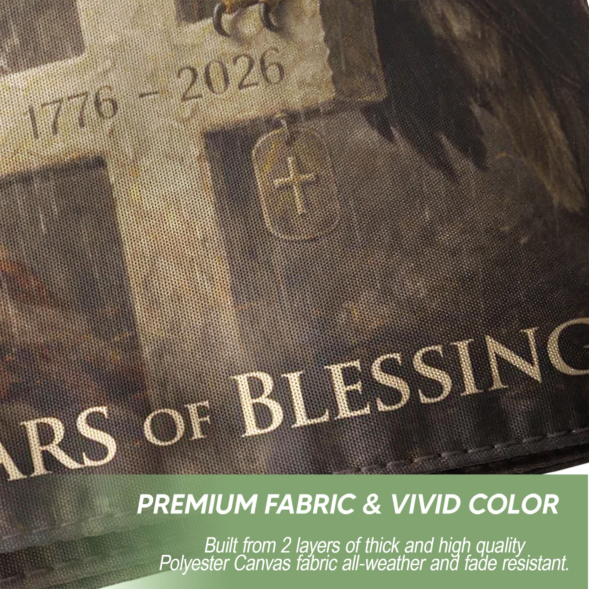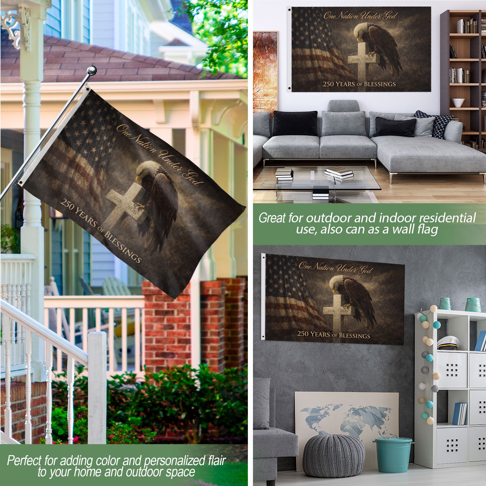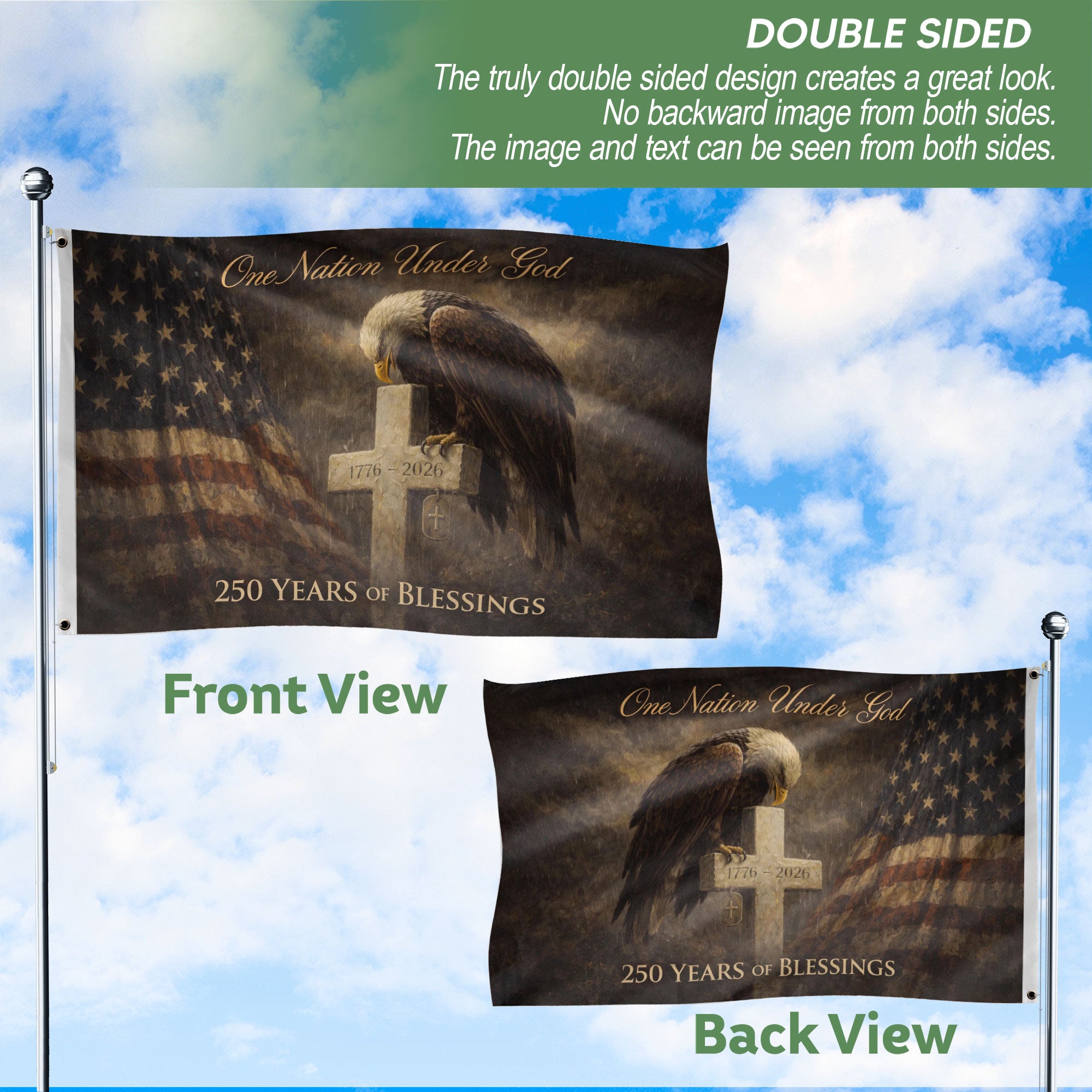 Celebrate America’s 250th anniversary from 1776 to 2026 with this striking double-sided flag. Featuring a bold bald eagle and cross design, it beautifully combines patriotic pride with Christian faith, symbolizing 250 years of blessings, courage, and freedom. Perfect for displaying at home, in your office, or during patriotic events like Independence Day celebrations. Crafted for durability, this high-quality flag is printed on both sides for visibility from any angle, ensuring your message of faith and liberty shines through. Ideal for veterans, history enthusiasts, church groups, and anyone honoring the nation’s heritage. Hang it proudly on a pole, porch, or wall to inspire patriotism and devotion.