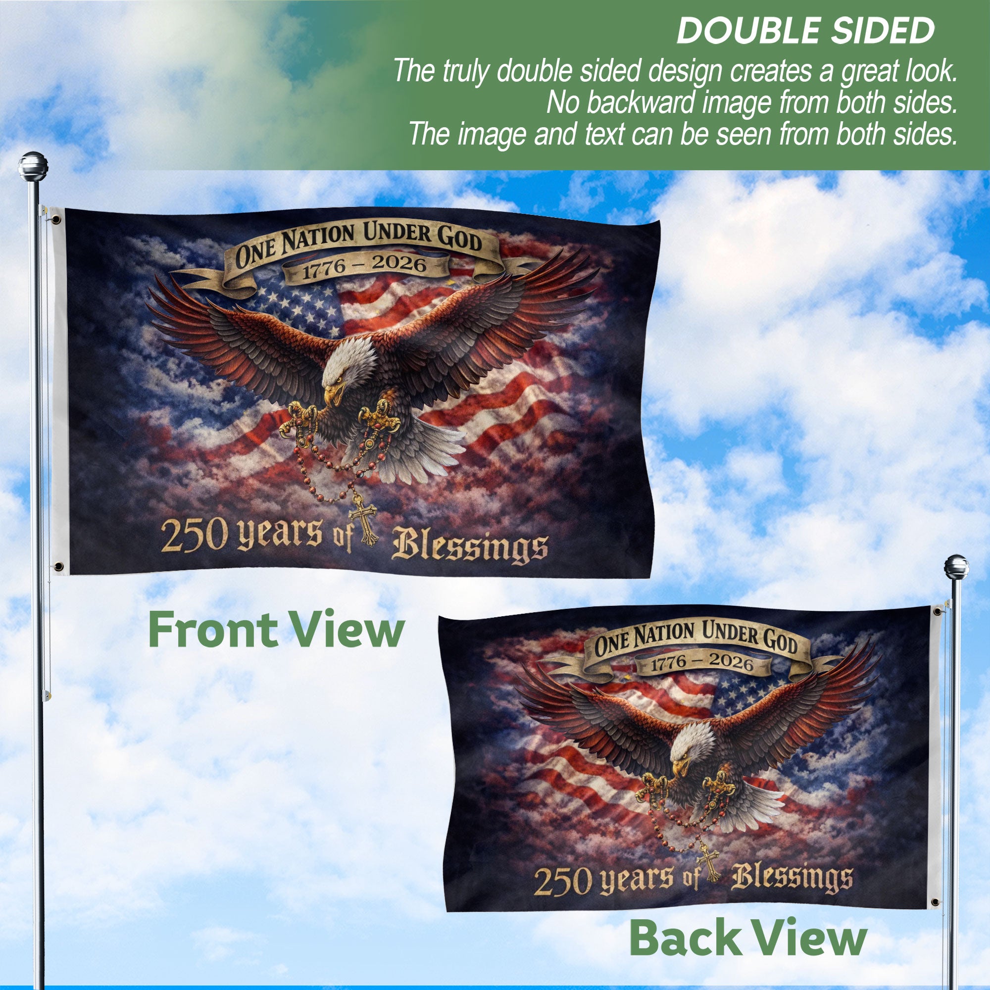 Celebrate America’s 250th anniversary from 1776 to 2026 with this striking double-sided flag featuring a majestic flying eagle design. Printed on both sides for visibility from any angle, it proudly displays ‘250 Years of Blessings One Nation Under God’ to honor national pride, resilience, and faith. Perfect for patriotic decor, home displays, porches, or outdoor events. Crafted from durable, weather-resistant polyester fabric that withstands wind and elements, ensuring long-lasting vibrancy. Easy to hang with reinforced grommets. Ideal for Fourth of July celebrations, historical commemorations, or everyday displays of American spirit.