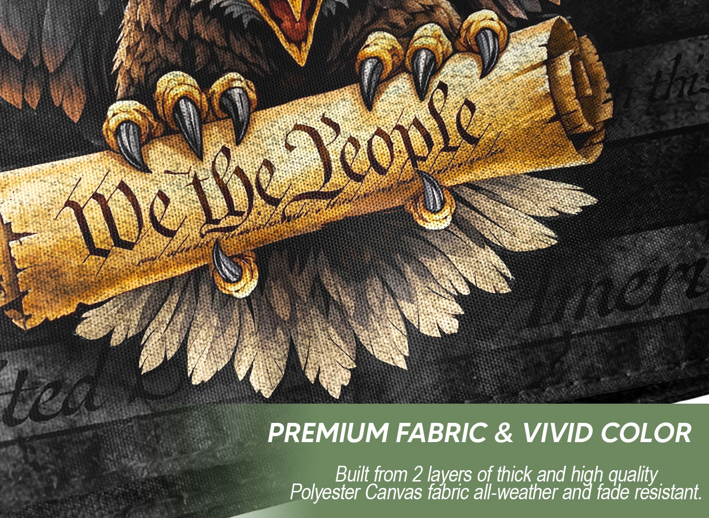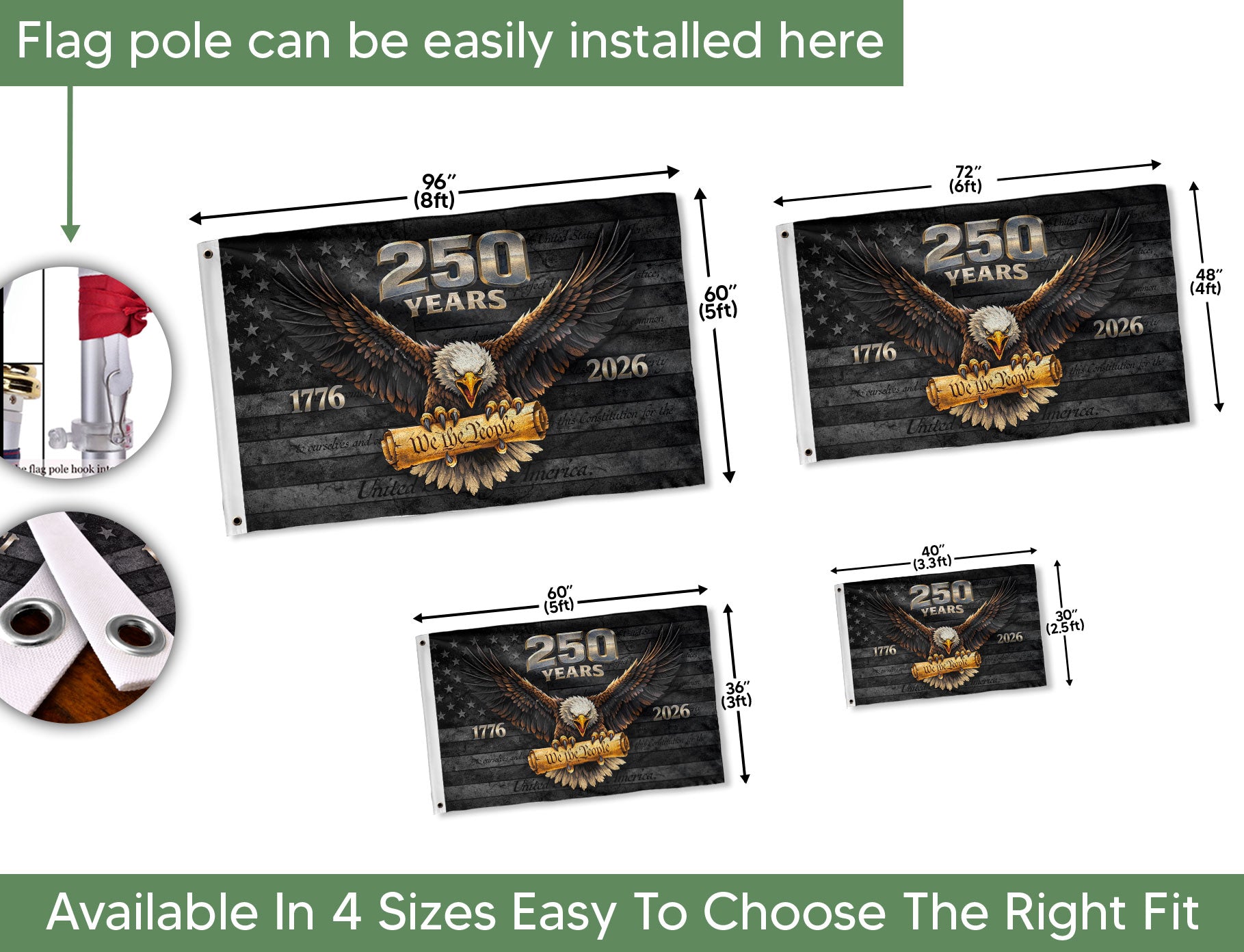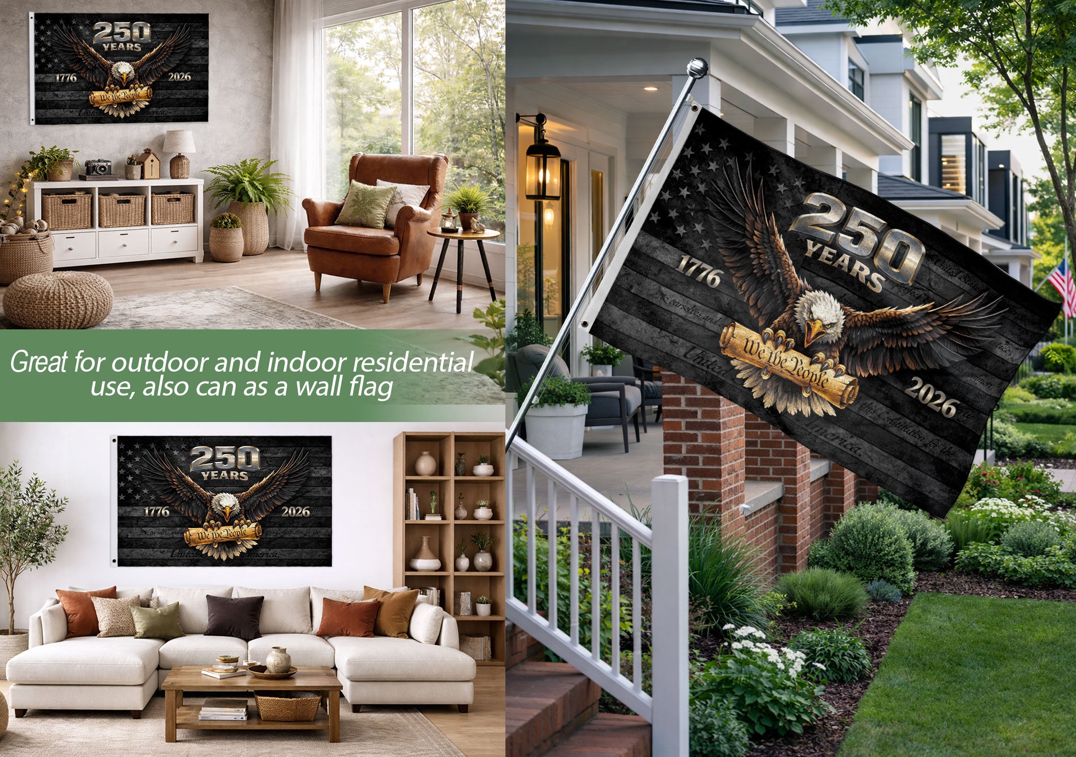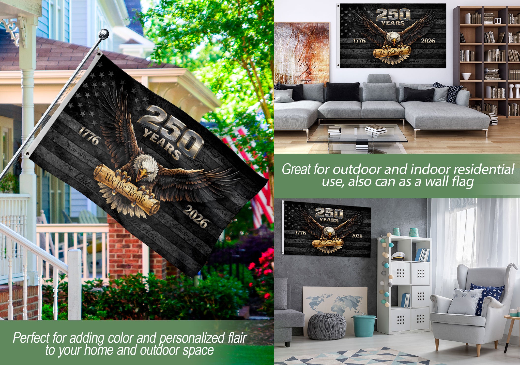 Celebrate America’s 250th anniversary from 1776 to 2026 with this premium double-sided house flag featuring a vintage bootleg eagle design and the iconic ‘We The People’ phrase. Crafted from high-quality polyester, it delivers vibrant colors and sharp details visible from both sides, ensuring eye-catching display from any angle. Durable construction withstands wind, rain, and sun exposure, making it perfect for outdoor use on porches, gardens, or homes. Ideal for patriotic holidays like Independence Day, Memorial Day, and Fourth of July, or year-round display to honor American history, freedom, and national pride. Easy to hang with included hardware, this flag measures standard house flag size for versatile placement. Show your patriotism with this timeless piece that captures the spirit of the USA’s founding principles.